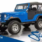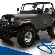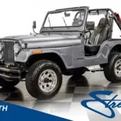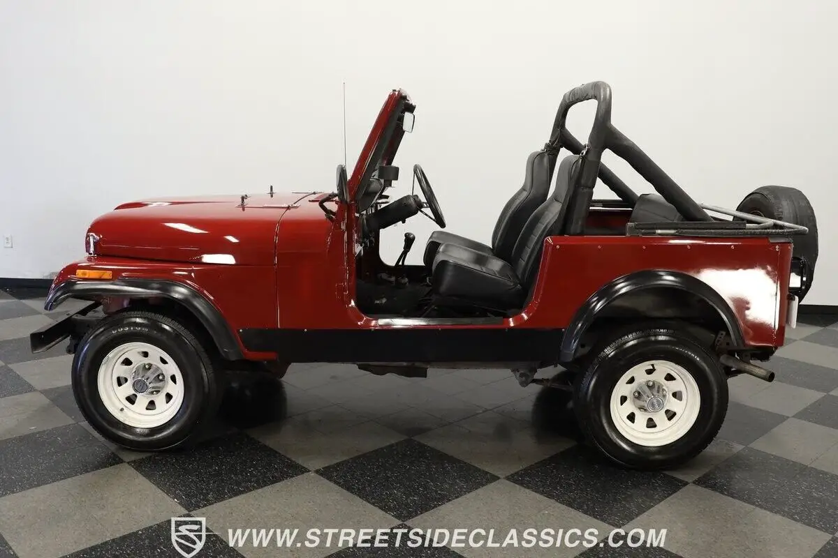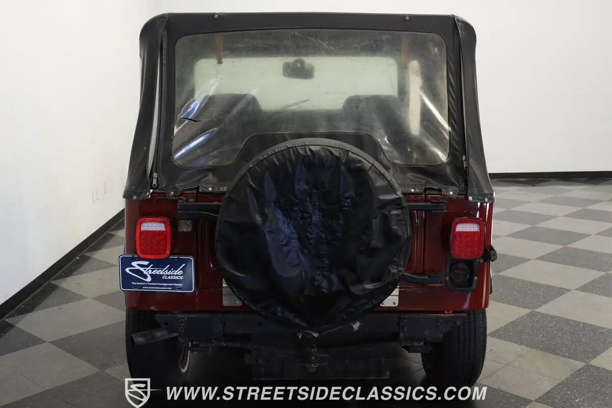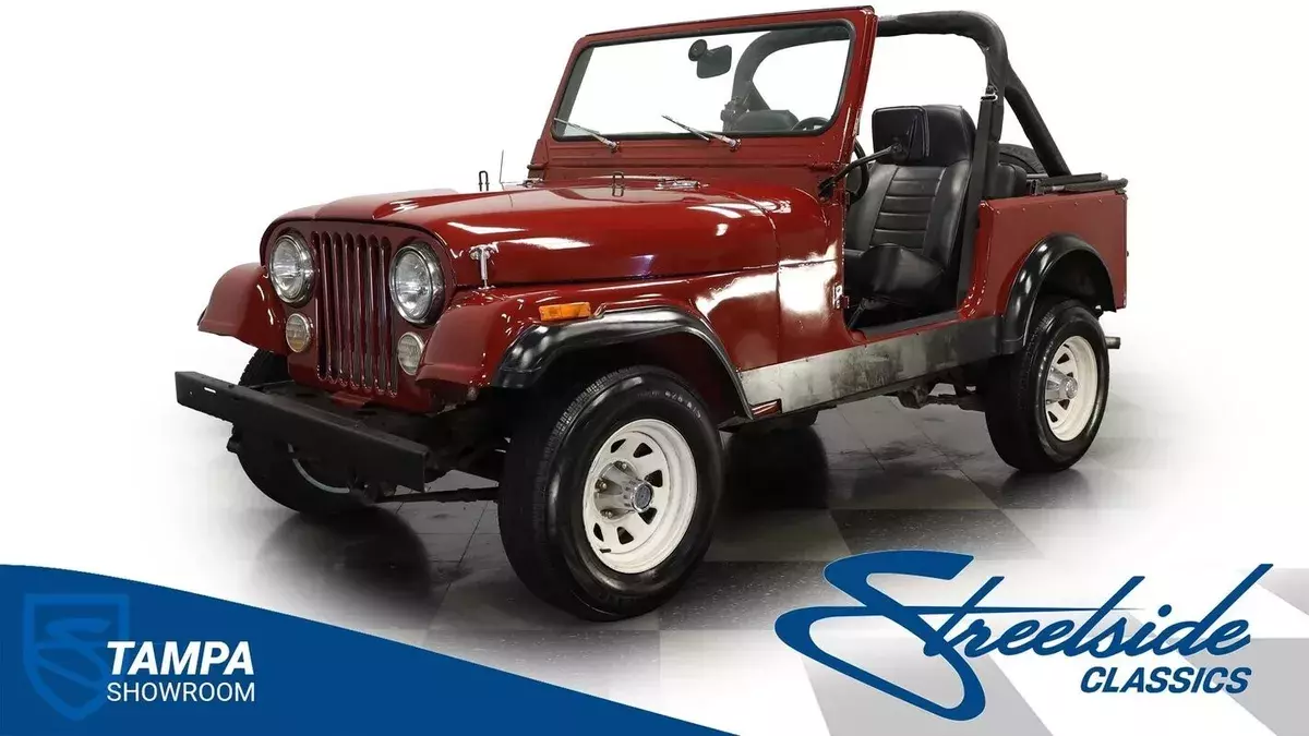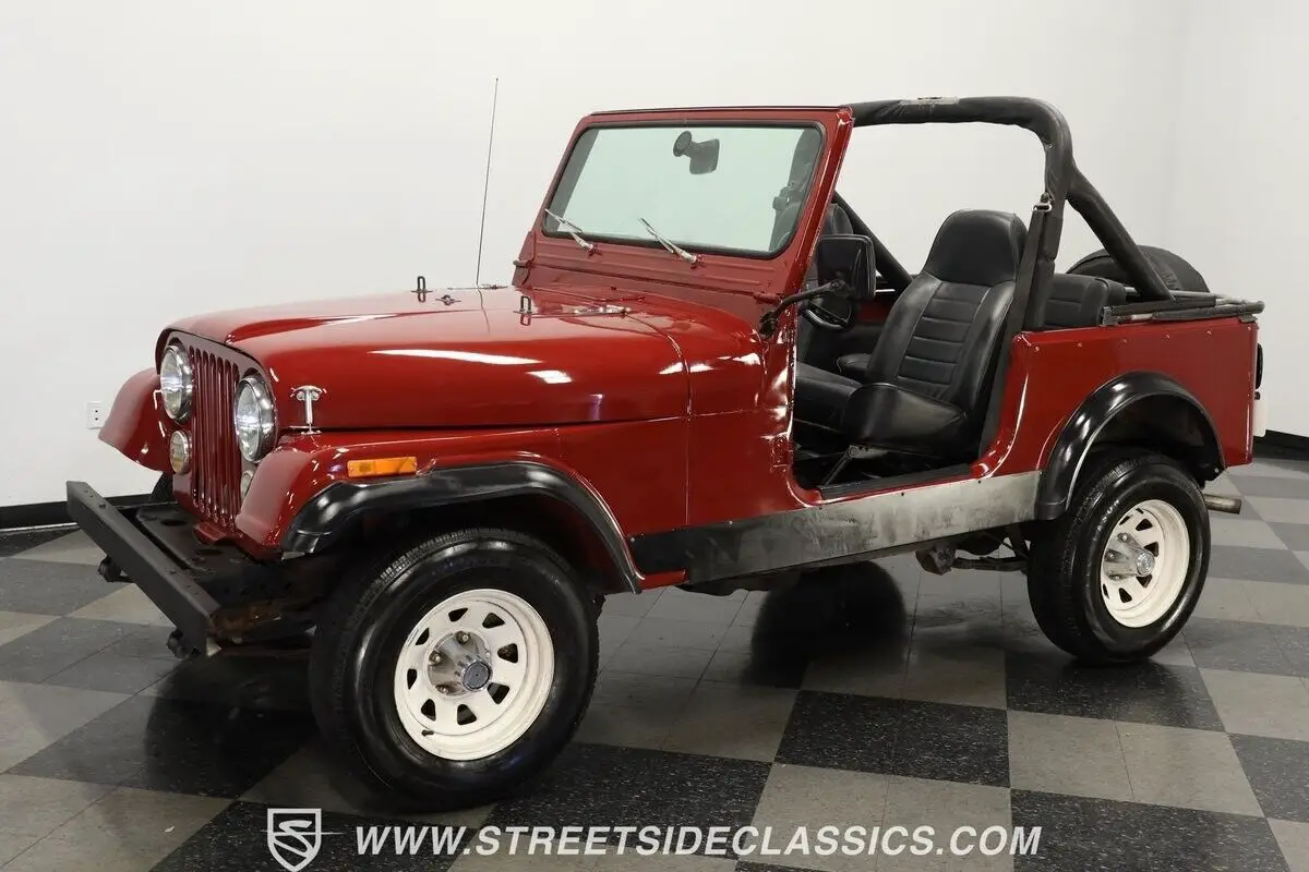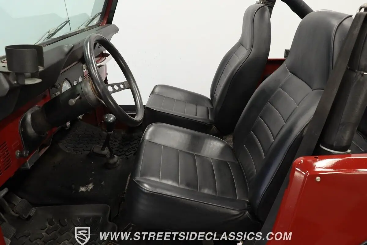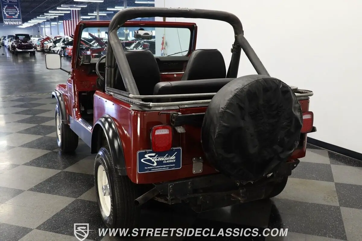 4953-TPA 1982 JEEP CJ7 HIGHLIGHTS: • 4.0L Inline-6 Engine • 4-Speed Manual Transmission • Front Disc Brakes • Upgraded Aluminum Radiator • Belt-Driven Cooling Fan • Power Steering • Burgundy Paint • Vinyl Removable Top • 15" Wheels with 225/75R15 All-Season Radial Tires • Front and Rear Bumpers • Trailer Hitch • Rear-Mounted Spare Tire • Black Interior with Bucket Seats • Floor Shifter • Sony AM/FM CD Player • Maintenance Records Since 1987