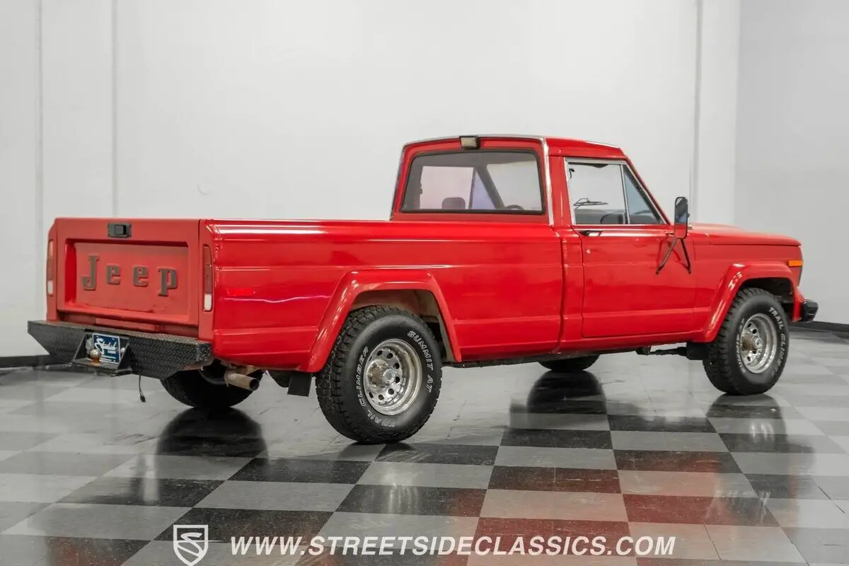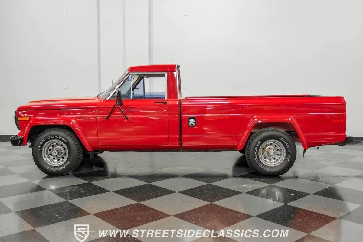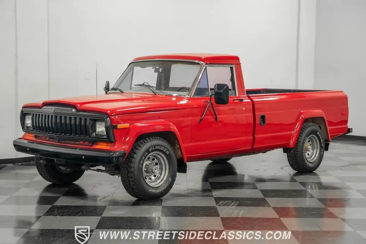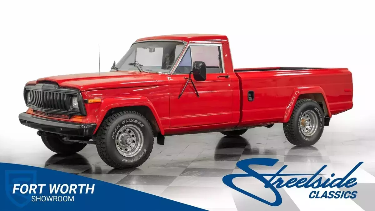 Built for conquering trails and tackling tough jobs, the legendary 1982 Jeep J10 4x4 pickup wears its red finish like a badge of honor. Squared-off lines and unmistakable Jeep presence create an imposing silhouette that means business without saying a word. The black-accented trim provides sharp contrast against the vibrant paintwork, while the rugged stance is elevated by 15" chrome wheels wrapped in aggressive 31x10.50R15 Summit tires from 2024. A powder-coated front bumper leads the charge, matched by a sturdy steel rear bumper with hitch ready for hauling duties. The practical bedliner protects the cargo area from whatever punishment you dish out, while tinted windows add a touch of mystery to this hard-working machine. Inside awaits a tan vinyl interior that balances utility with comfort. Bucket seats with a center console provide both support and convenience for long days on rough terrain. The Grant aftermarket steering wheel mounted on a tilt column puts control firmly in your hands, while additional under-dash gauges keep you informed about what's happening with your rig. When the summer heat hits, the functioning air conditioning keeps the cabin comfortable no matter how dusty the trail gets. The factory AM radio remains in place, preserving a piece of 1980s authenticity amid the otherwise purpose-driven cockpit. Rubber floor covering stands ready to take on mud, dirt, and whatever else your adventures might bring inside. Muscle comes courtesy of a 360 V8 engine that delivers the torque needed for crawling over obstacles or pulling heavy loads. The 3-speed automatic transmission makes for effortless gear changes when your focus needs to be on the terrain ahead. When the pavement ends, the 4x4 system with part-time transfer case engages to conquer mud, rocks, and loose surfaces with confidence. Cooling duties are handled by an upgraded aluminum radiator with electric fans, ensuring this truck keeps its cool even during low-speed off-road challenges. Power front disc brakes provide stopping ability, while solid axles with leaf springs at both ends offer the durability and articulation needed when the going gets rough. HIGHLIGHTS: • 360 V8 Engine • 3-Speed Automatic Transmission • 4X4 Drivetrain • Power Front Disc Brakes • Aluminum Radiator w/ Electric Cooling Fans • Solid Axle Suspension with Leaf Springs and Shocks • Powder Coated Front Bumper • Steel Rear Bumper with Hitch • 15" Chrome Wheels in 31x10.50R15 Summit Tires (2024) • Bedliner • Tinted Windows • Black Accented Trim • Tan Interior with Bucket Seats with Console • Grant Aftermarket Steering Wheel • Tilt Steering Column • Air Conditioning • Power Steering Born to venture where ordinary trucks fear to tread, this 1982 Jeep J10 4x4 combines brute strength with practical capability. The potent 360 V8, go-anywhere 4x4 system, and tough-as-nails construction make this truck an ideal companion for both work duties and weekend warrior missions. Call today!
