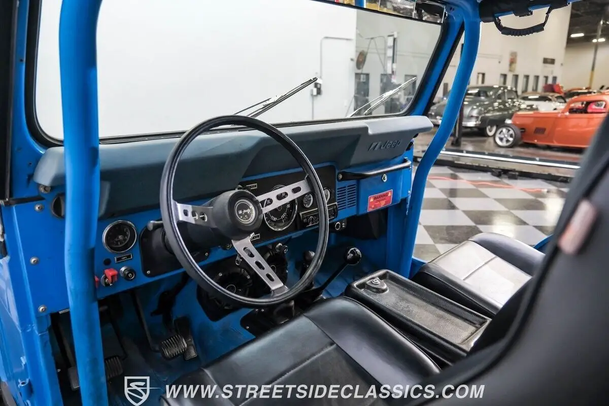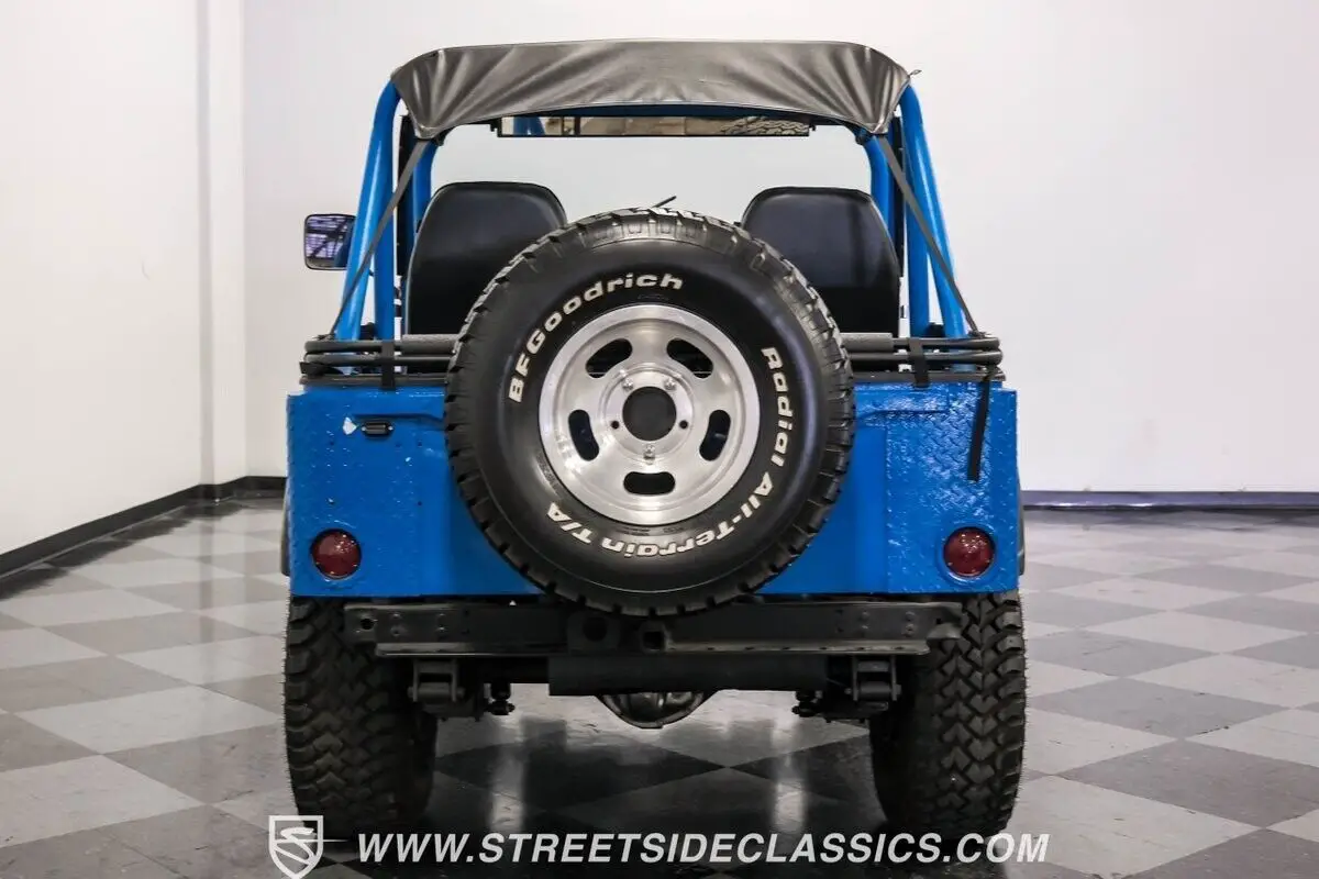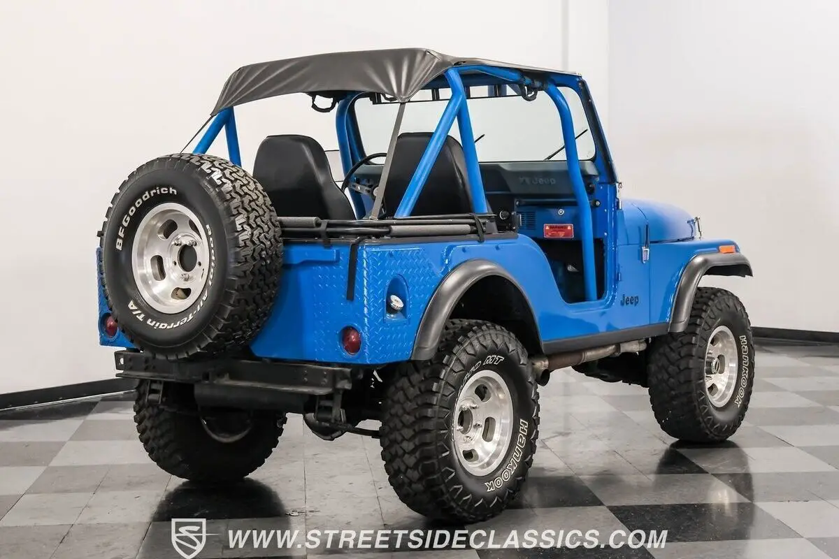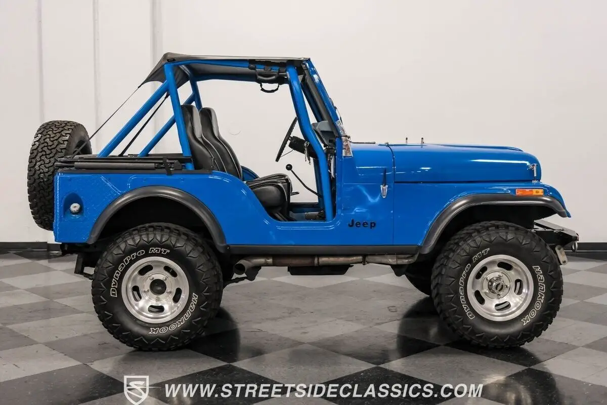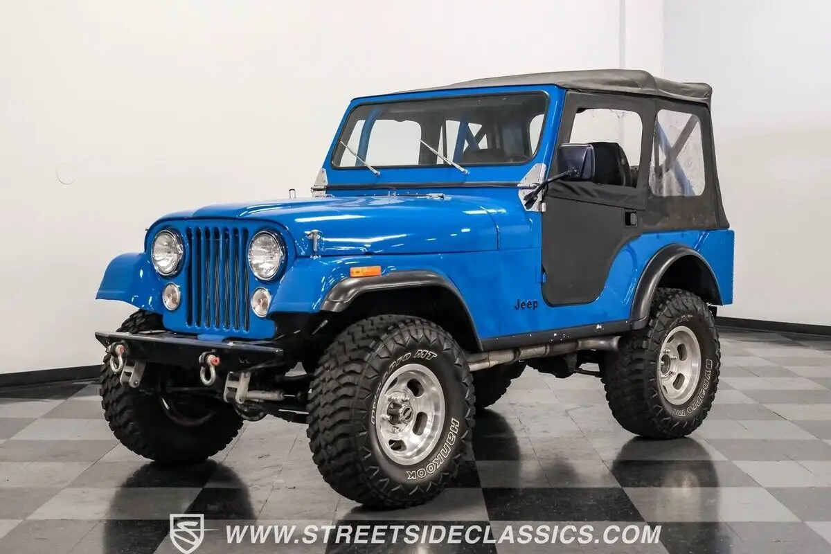 Vehicle Original VIN : J6F83EH011751Born for the trails and transformed for adventure, this 1976 Jeep CJ5 V8 wears a vibrant blue exterior that announces its off-road capabilities without saying a word. Previously a white Levi Package model, this CJ5 received a complete color makeover in 2016, giving it a distinct identity on and off the beaten path. Fender flares accentuate the muscular body lines while making room for those massive 32x11.50R15 Dynapro tires mounted on 15" slotted mag wheels. A steal front bumper with tow hooks adds both function and rugged aesthetics, while the side-exit exhaust system and spare tire mounted on the back complete the adventure-ready look. This Jeep also includes both a Bimini top and a brand new full soft vinyl top with doors from Best Top for all your weather conditions. The black interior creates a straightforward, no-nonsense environment built for adventure. TRS bucket seats provide solid support for those off-road excursions, while the center console offers convenient storage for essential gear. A full roll cage fabricated by Full Bore in San Diego adds both safety and structural integrity. Instead of a back seat, this Jeep utilizes a Smittybilt lockable cargo storage box, maximizing utility without sacrificing style. The dash remains clean and uncluttered, while large grab handles make entry and exit a breeze. Power steering allows for easy maneuvering over rough terrain, and the JVC stereo provides the soundtrack for your outdoor expeditions. A muscular 360 V8 engine powers this off-road machine, replacing the original 304ci powerplant with additional cubic inches and output. The motor pairs with a 3-speed manual transmission that puts control squarely in your hands. The 4x4 drivetrain features Dana 30 axles front and rear for proven durability on challenging terrain. Power steering and power brakes make handling straightforward even in tough conditions. Recent mechanical upgrades include a new alternator, voltage regulator, repaired wiring harness, rebuilt transfer case with new seals, new clutch and pressure plate, new brake booster, master cylinder, front and rear brake cylinders, and upper and lower engine gaskets. HIGHLIGHTS: • 360 V8 Engine • 3-Speed Manual Transmission • 4X4 Drivetrain • Dana 30 Front and Rear Axles • Power Brakes • Side-Exit Exhaust System • Blue Exterior Paint • 15" Slotted Mag Wheels in 32x11.50R15 Dynapro Tires • Bimini Top • New Full Soft Vinyl Top with Doors • Black Interior with TRS Bucket Seats with Console • Roll Cage by Full Bore San Diego • Power Steering • JVC Radio From mountain trails to desert adventures, this 1976 Jeep CJ5 V8 combines classic 4x4 capability with thoughtful upgrades that make it ready for action. With its powerful 360 V8 engine, dual top options, and plenty of recent mechanical work, this American off-road legend awaits your next expedition. Call today!