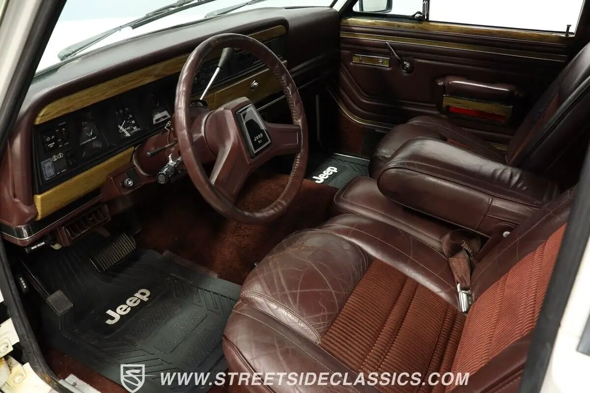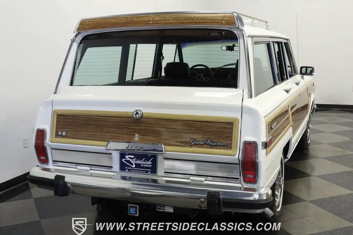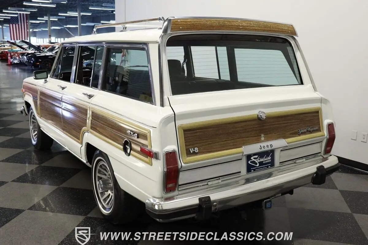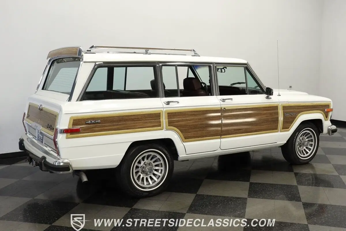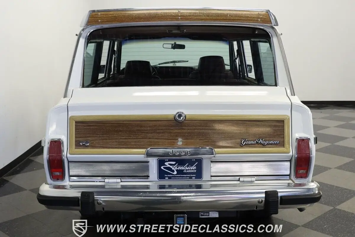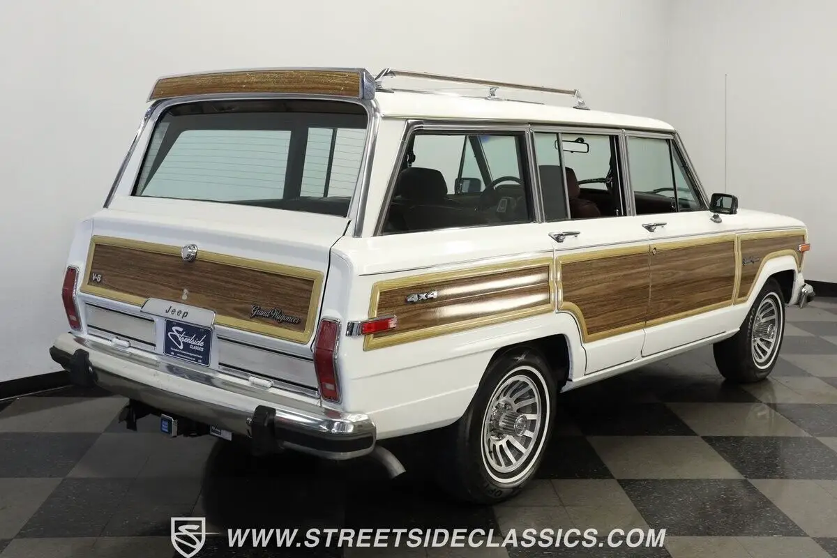 4728-TPA 1988 JEEP GRAND WAGONEER HIGHLIGHTS: • 360 V8 Engine • 3-Speed Automatic Transmission • Motorcraft 2-barrel Carburetor • Power Steering • Power Front Disc Brakes • Dana Front and Rear Axles (3.31 gears) • Leaf Spring Suspension with Air Shocks (Rear) • Single Exhaust System • Pearl White Paint • Woodgrain Paneling • Chrome Bumpers, Grille, and Trim • 15" Wheels in 235/75R15 Whitewall Tires • Roof Rack • Reese Trailer Hitch with Plug-in • Rear Power Window • Dark Red Interior • Leather and Cloth Seats • AM/FM Cassette Stereo • Air Conditioning • Clear Gauges