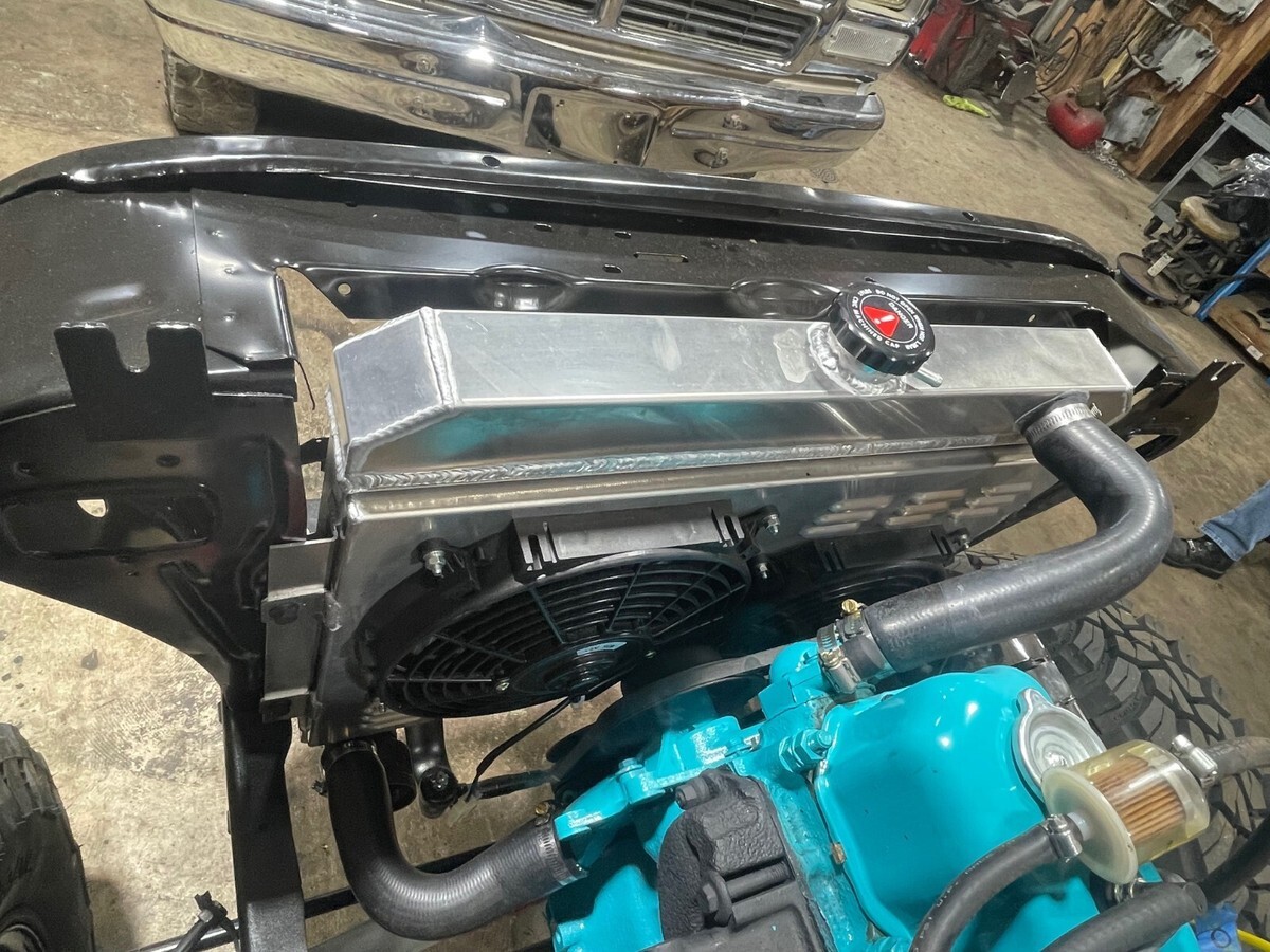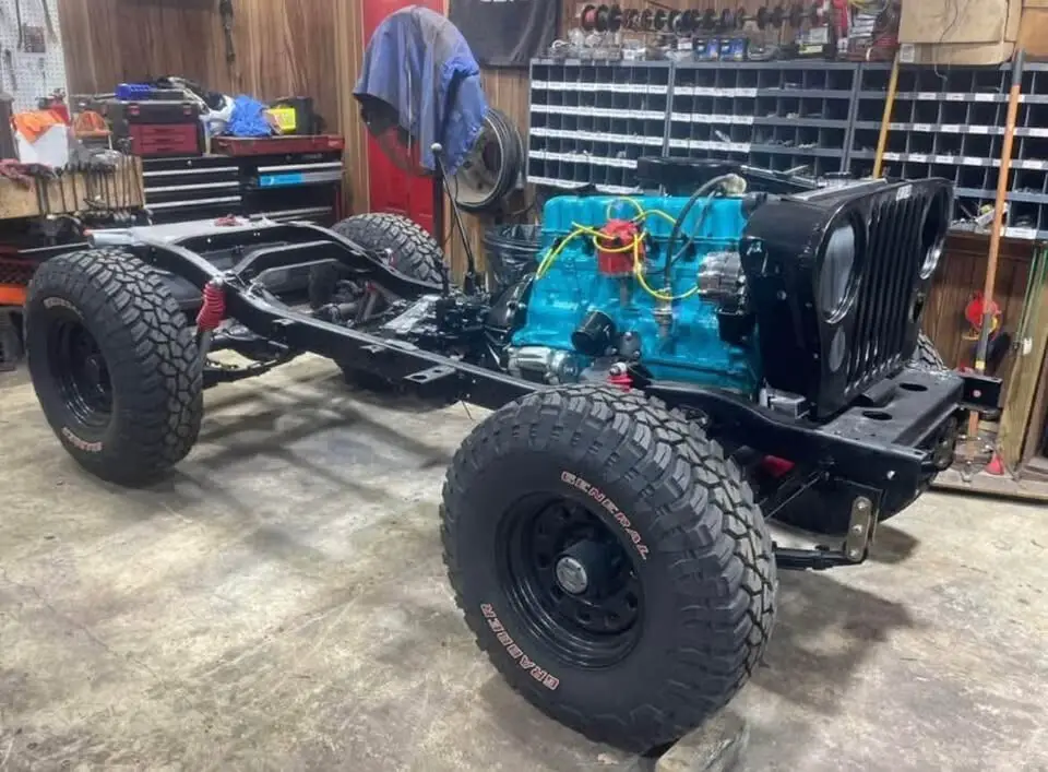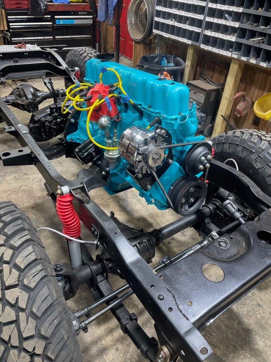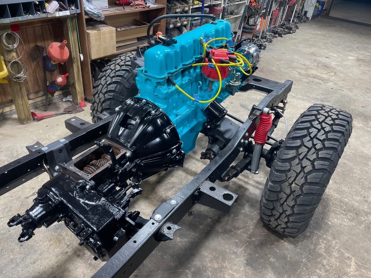 ALL of the work is done for you. Motor runs, transmission and transfer case hooked up and in place, brake lines run and 100% bled, exhaust started and driveshafts installed. All 3 pedals hooked up and working perfectly. Complete running and rolling chassis. Every grease fitting is greased and every bolt is tight.