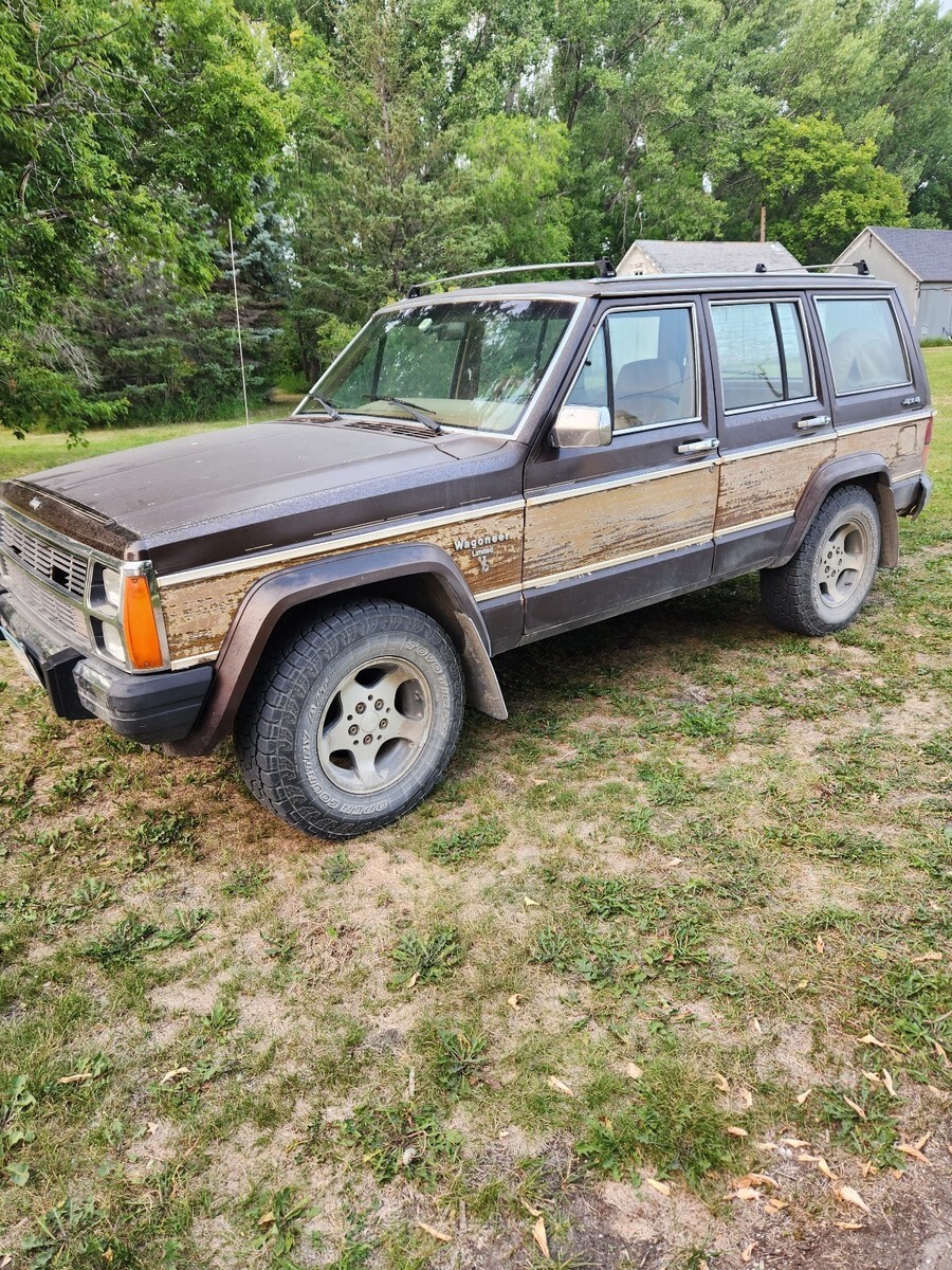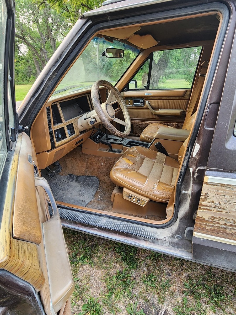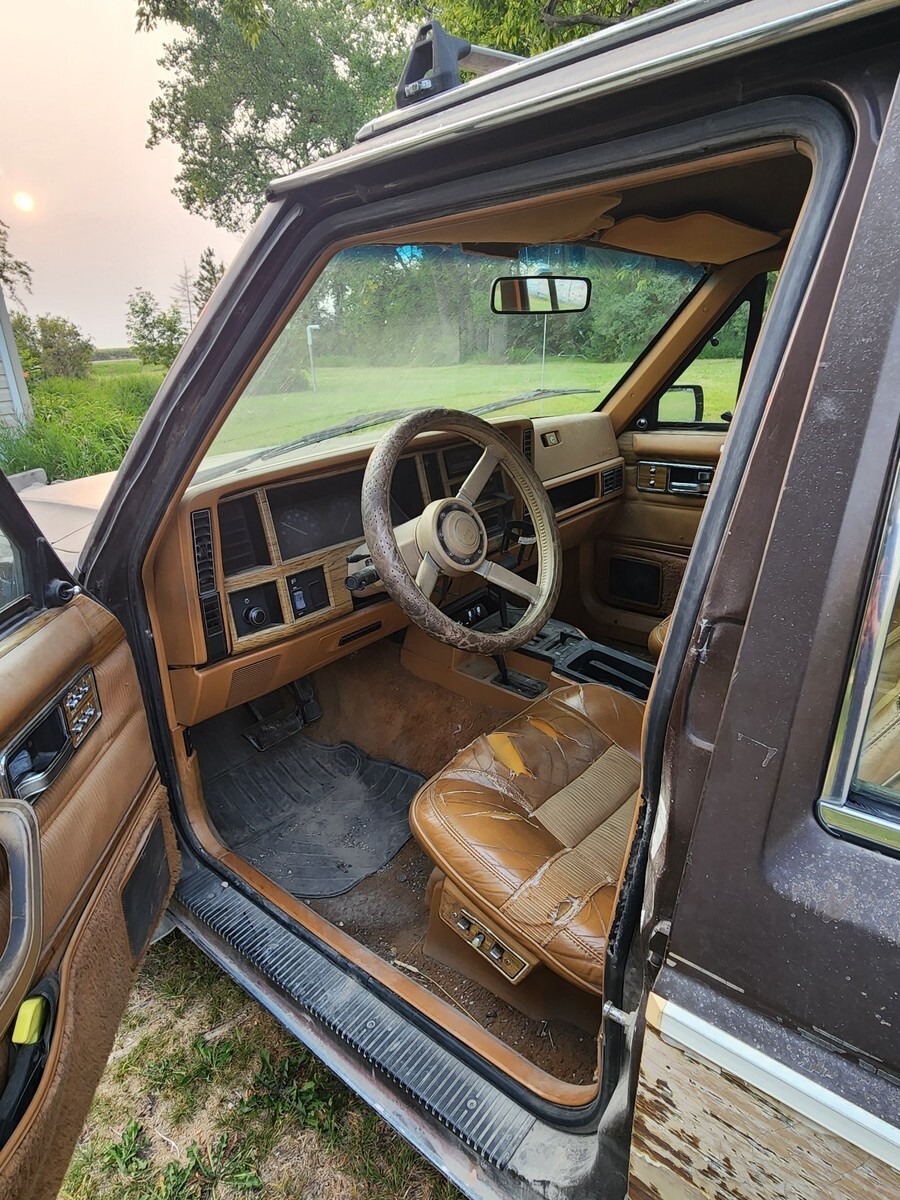 This 1986 Jeep Wagoneer is an original vehicle that has been in the owner's possession for 5 years. It is brown in color and has a mileage of 208,000. It does have some mechanical flaws that are taken into consideration reflecting the low starting bid price. However this fun little jeep still runs and drives smoothly down the road. The flaws include, an electrical connection issue that causes the vehicle lights and gauges in the dash to flicker and priodically lose connection. This started after running the vehicle through a high pressure car wash, something got wet and still seems to cause issues. The 4x4 works, however the selectrac feature is stuck in 4 High. When trying to switch back to 2 wheel drive something in the linkage grinds. This jeep is an automatic, with the floor style shift lever between the front seats. The lever sometimes has to be placed in neutral, rather than park, when starting the vehicle. This mostly happens if the shift lever isn't put into the park position with enough force to lock it in, but once in neutral it turns over and starts as it should.