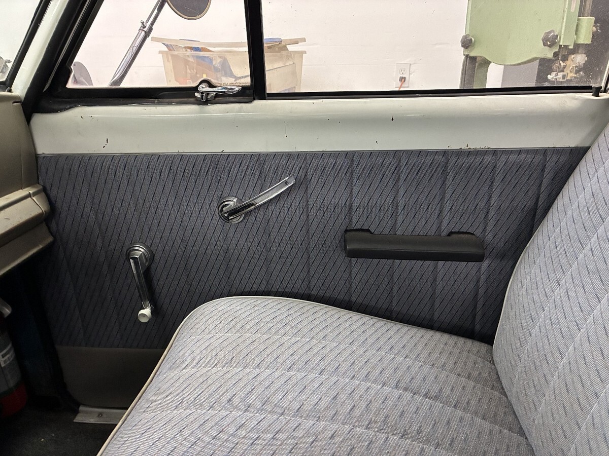 The interior of this truck is in pretty good shape. The farmer repainted the interior as well. The carpet appears to be original and is in pretty good shape. The seated upholstery and door panels were reupholstered in a 1950s Rambler fabric. The door panels were floppy and a little moldy. I bought ABS panels and had them recovered with the exact same fabric, which I was lucky enough to find on the Internet. I have enough to reupholster the bottom of the seat I think. The bottom of the seat has a cigarette burn on the driver side. The back of the seat is in good condition.