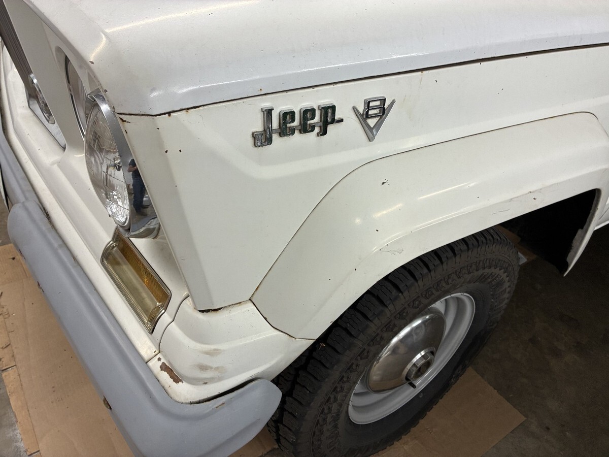 I got this truck with some ugly rusted chrome wheels. I replaced them with some AMC era CJ wheels. I had them powder coated and found some AMC era J truck hubcaps. They look pretty cool, but they have the wrong logo and colors. There is a full size spare. I replaced the tires with new ones.