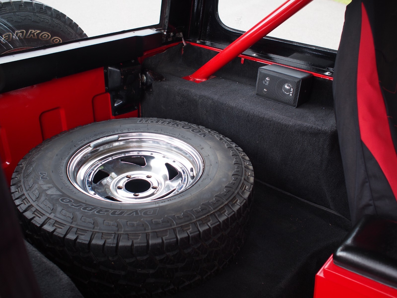 The exterior has been cleanly repainted and is currently equipped with two full-size doors, as well as two additional half-size doors, providing a customized driving experience. The Jeep sits on like-new tires mounted on Grand Cherokee aluminum rims, combining performance and vintage Jeep aesthetics. Additional upgrades include a tow bar bumper for easy transport and a chrome bumper that adds a classic touch.
