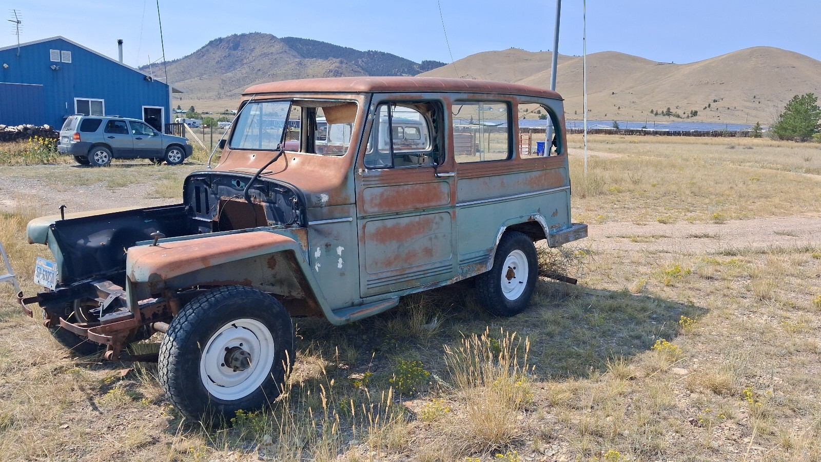 The Green Willy parts Jeep has very little rust and includes: A straight hood, two good front grills, the Top & Bottom of a wagon tail gate, tail lights, 2 T-90 transmissions [one re-buildable and the other parts],four extra 15" X 4.5 rims [two with good tires], tail lights, new in box wiring, fuel tank good extra glass, a skid plate to cover gas tan, ,, plus too many other parts to mention here.