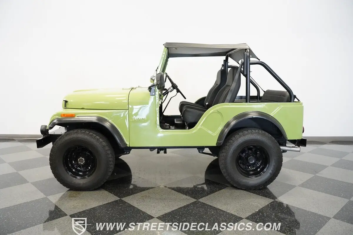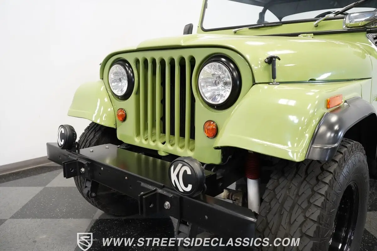 Adventure calls, and this 1966 Jeep CJ5 answers with lime green paint that cuts through any landscape. Ghost flames flow across the hood in subtle artistry, while black plastic fender flares protect against trail debris. KC light pods mounted on the front bumper illuminate night runs and dawn expeditions. Riding on 15" black steel wheels with 31x10.50R15LT Falken Wild Peak AT tires, this machine grips everything from rocky ledges to muddy creek beds. The black soft vinyl bikini top and roll bar complete the open-air freedom that defines true off-road capability.