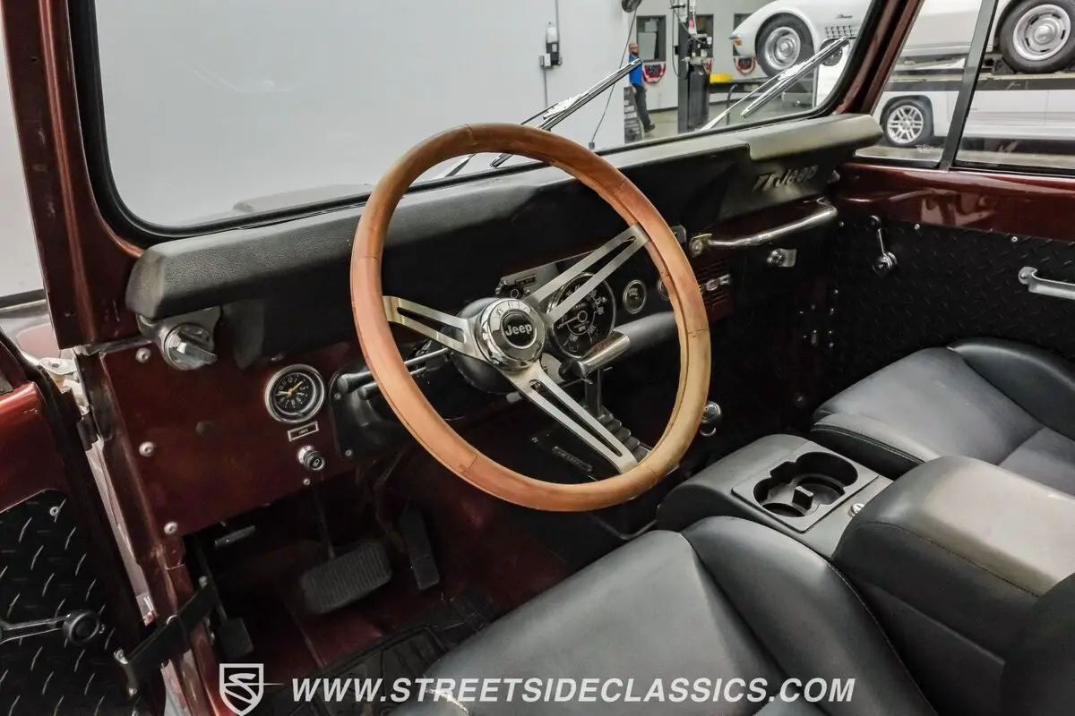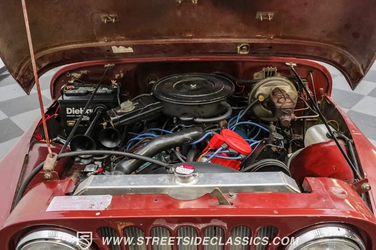 Under the hood, this Jeep is powered by a sturdy 304 V8 engine paired with a smooth-shifting 3-speed automatic transmission. It boasts an aluminum radiator and a Holley 2-barrel carburetor, ensuring reliable performance and a spirited driving experience. The drivetrain is complemented by power steering, front power disc brakes, and a robust four-wheel-drive system, ready to tackle a variety of terrains with confidence and ease.