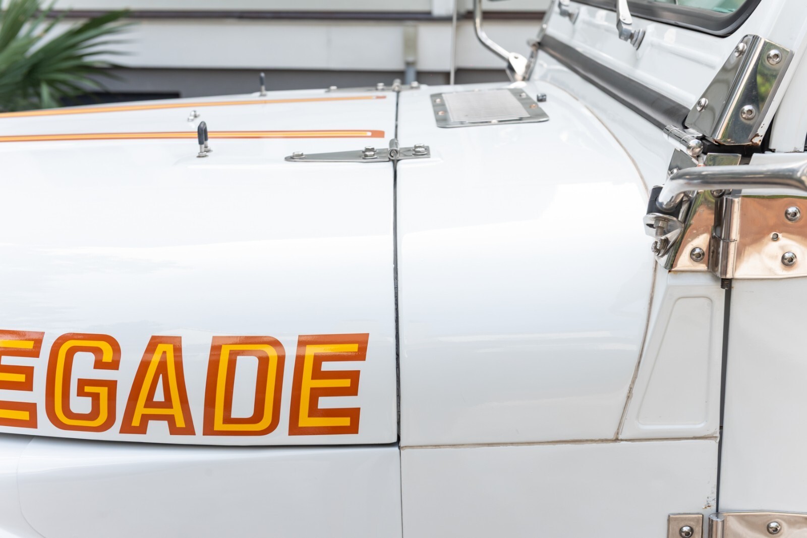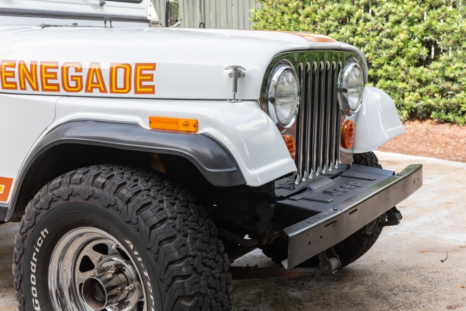 This 1985 Jeep CJ-7 Renegade was registered with its previous owner in Texas for 15 years, during which it was refinished, painted, and its interior was refreshed. a 4.2-liter inline-six paired with a five-speed manual transmission, it was acquired in 2021 and subsequent work has involved adding Holley Sniper fuel injection, installing a Flowmaster muffler, new Holley fuel tank with fuel pump, rear axle, clutch assembly, rear main seal, power steering gear, and timing chain. A marine Kenwood stereo and 6×9″ speakers were fitted, as well. Additional equipment includes a chrome grille, a tan soft top, full metal doors, and 15″ chrome wheels. The CJ-7 shows 180k miles and is offered with service records, spare parts, a bikini top, an accident-free Carfax report, and a clean South Carolina title. Finished at the factory in Olympic White (9B), the body was stripped to bare metal ~12 years ago, and its hood, windshield frame, and a fender were replaced before it was refinished in GM-specification Pure White. The windshield and side windows were also replaced under previous ownership along with lenses and seals. The locks in the doors do not work, and the right door handle is loose. The chromed 15″ steel wheels were mounted with 31×10.50″ BFGoodrich All-Terrain T/A KO2 tires in November 2021. The steering gearbox, brake master cylinder, and shock absorbers were replaced in 2022. The brake rotors and pads were replaced in June 2025. Bestop high-back bucket seats are trimmed in Spice upholstery, and the rear bench is reupholstered to match, while the floors are coated with textured bedliner. The cabin also has a replacement dashboard pad and seatbelts. Two 6×9″ marine speakers and a Kenwood marine stereo with Bluetooth were installed in 2021. Mounted on a tilt column, a replacement soft-feel sport steering wheel fronts the dashboard, which has a digital outside-temperature display, a voltmeter, an oil-pressure gauge, and an 85-mph speedometer with a six-digit odometer showing 180k miles, ~7k of which were added by the seller. The coolant temperature gauge is not working, and the windshield wipers only work intermittently. A spare windshield wiper motor accompanies the Jeep. The 258ci inline-six was equipped with Holley Sniper electronic fuel injection in January 2023. A replacement Holley fuel tank with an in-tank pump was installed under current ownership, as was a replacement catalytic converter and a Flowmaster muffler, and the timing chain, flywheel, rear main seal, valve cover, alternator, ignition distributor, and spark plugs were replaced. The rear axle was also replaced in 2024. The transfer case and 4 wheel drive work well. This is a very clean, reliable and head turning late model CJ7 that is a lot of fun! Besttop bikini top will also be included. Additional photos and videos are available upon request.