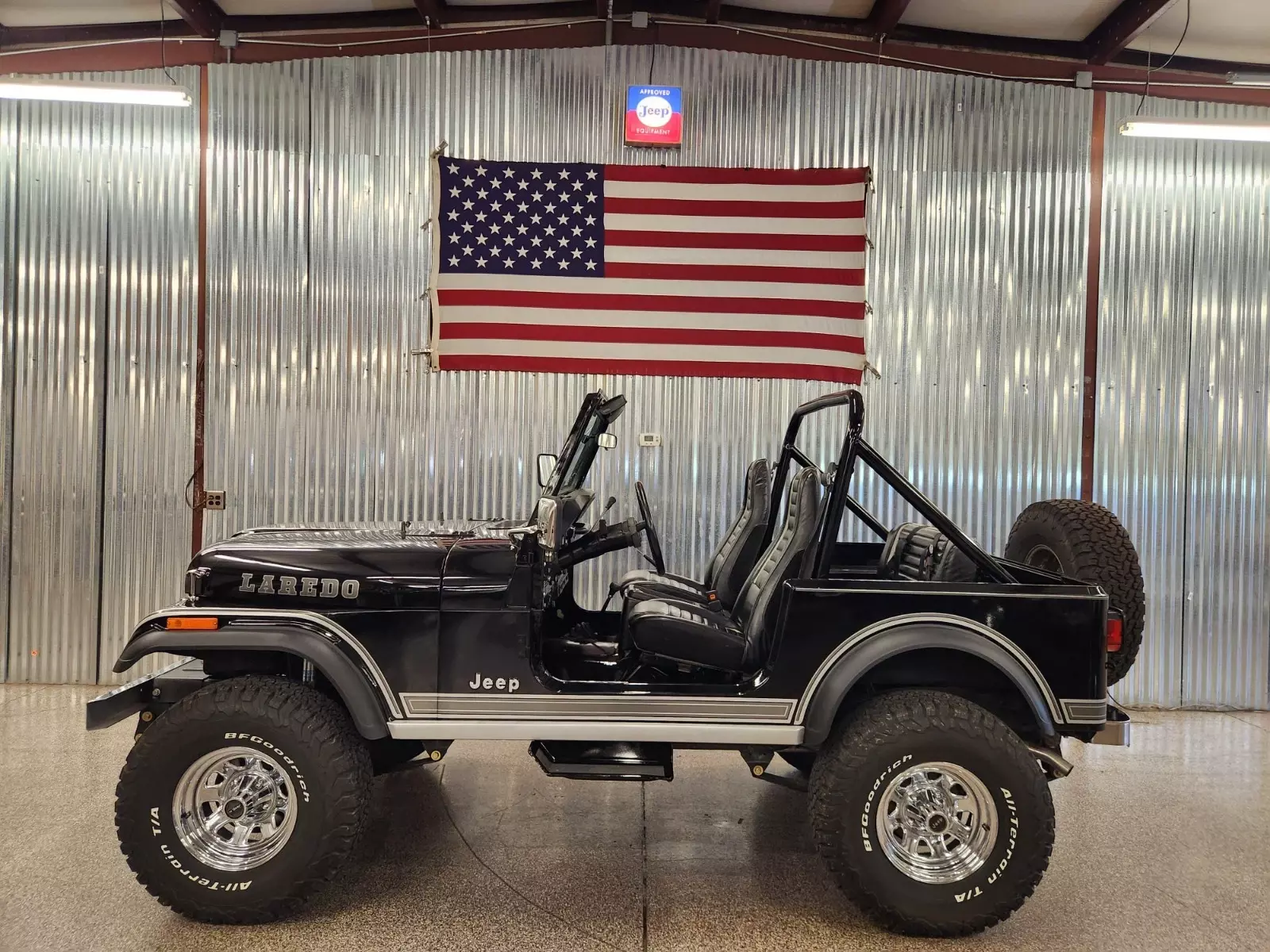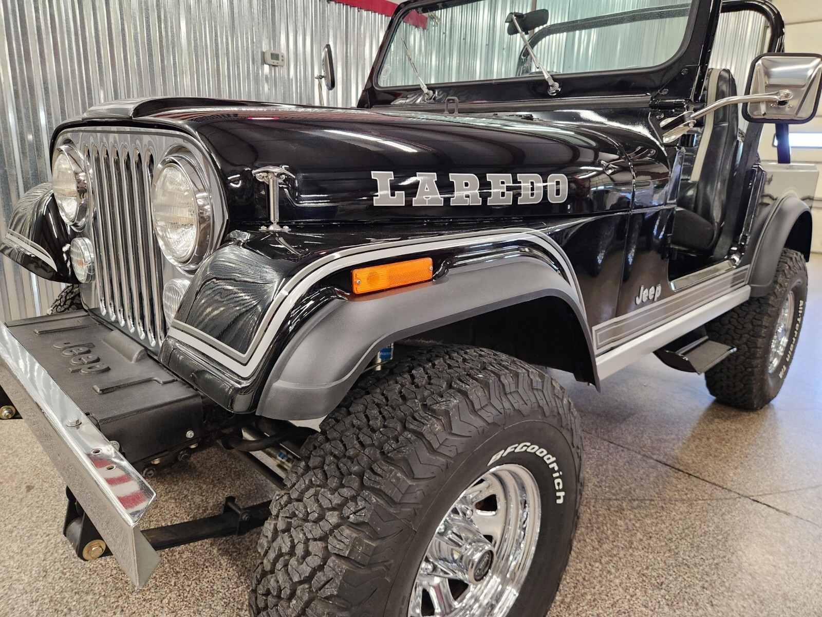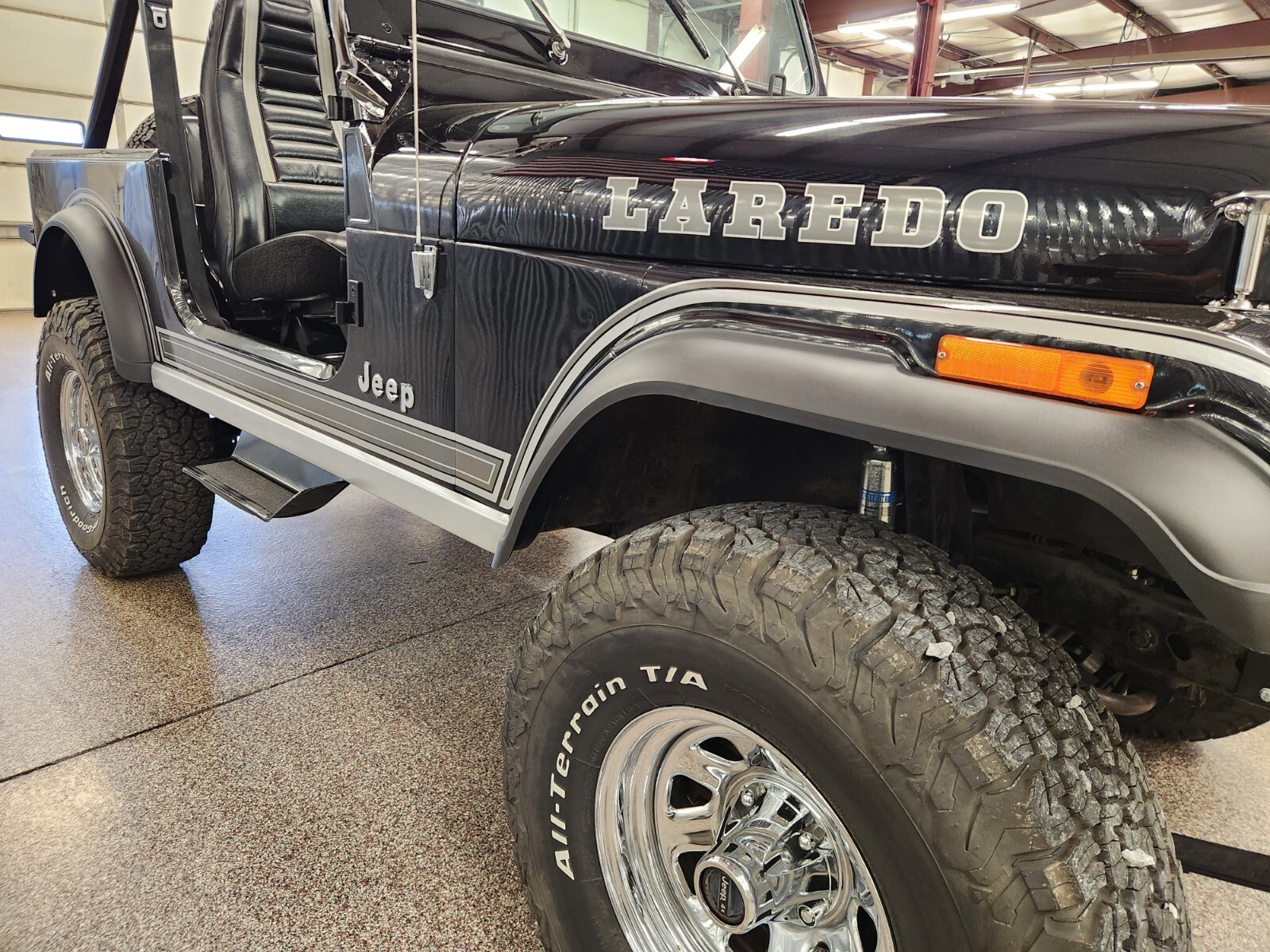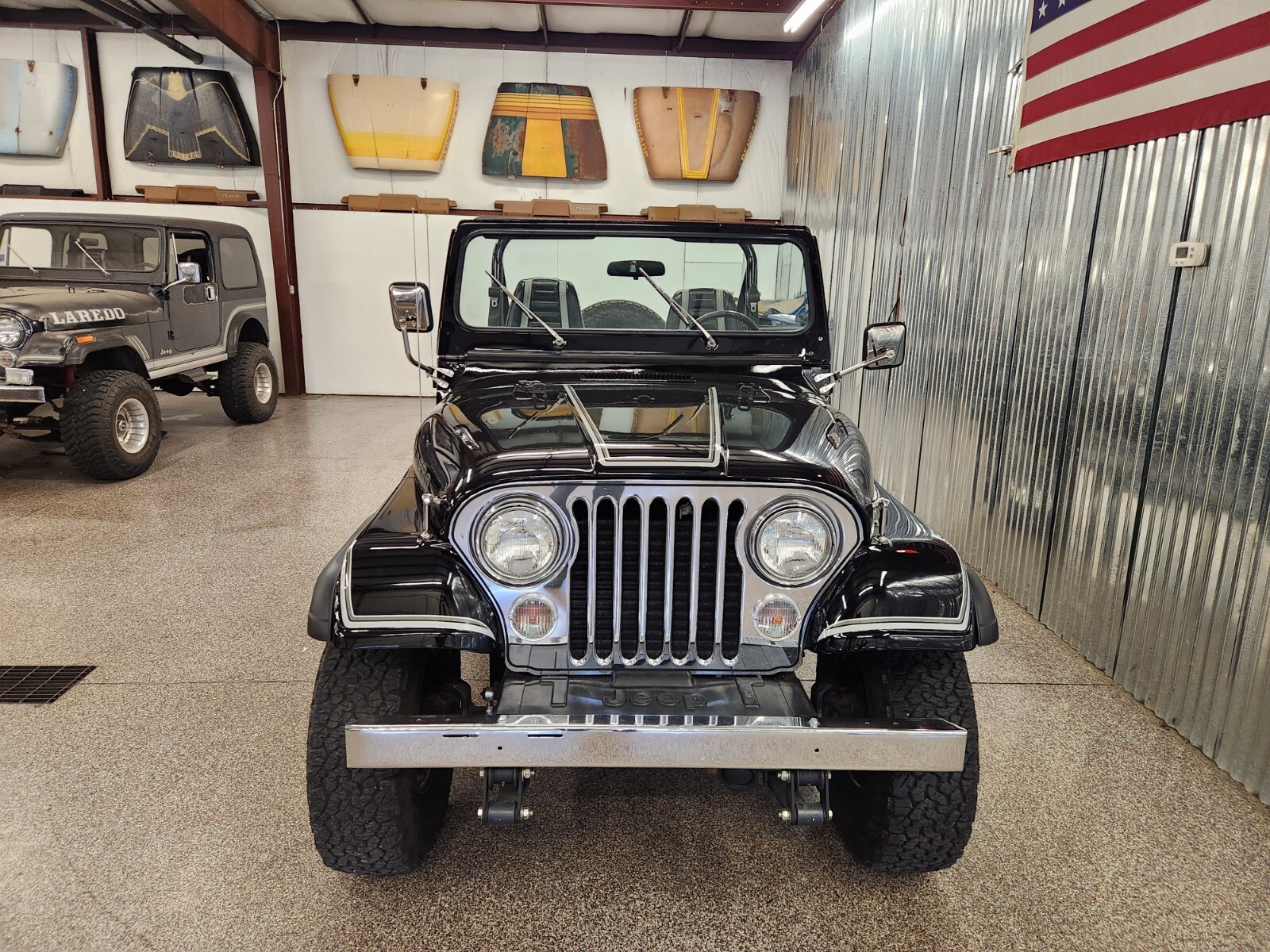 Always rot free classic black Jeep CJ7 Laredo from Texas and Arizona. Original steel body w no patching done ever Shiny steel oem floors.