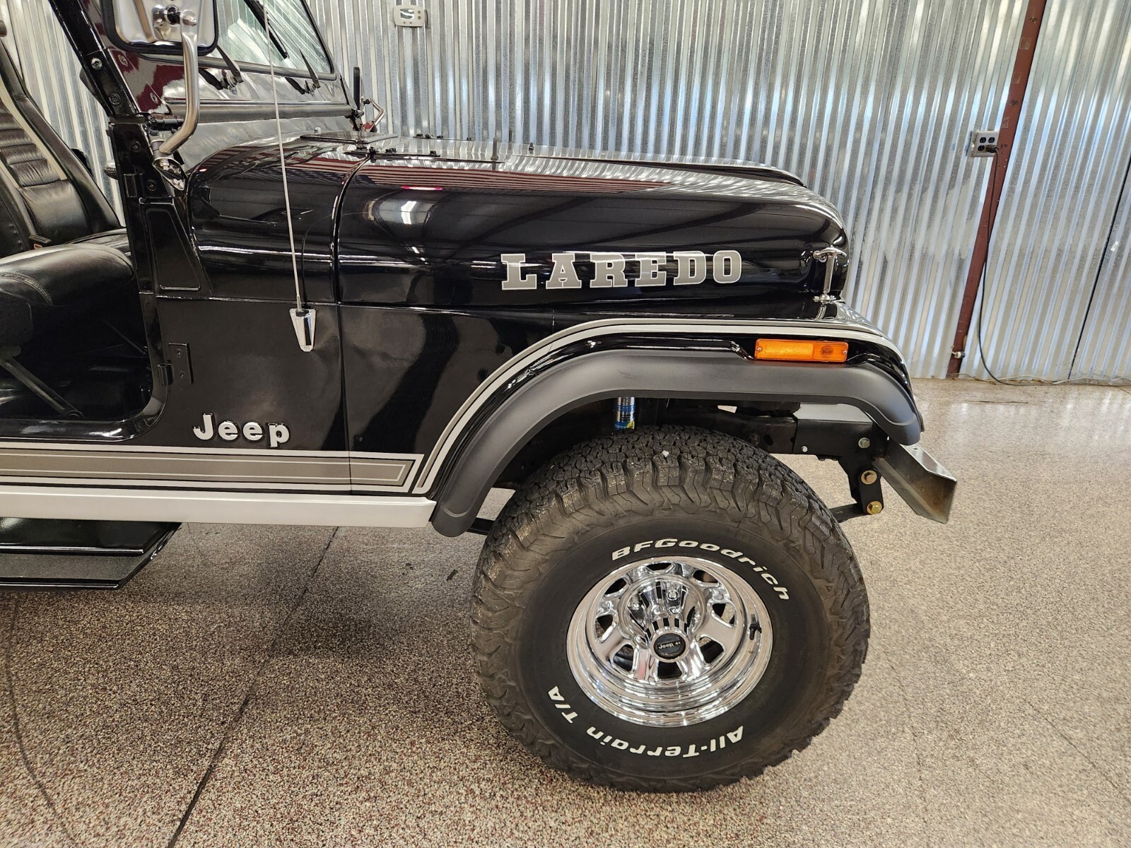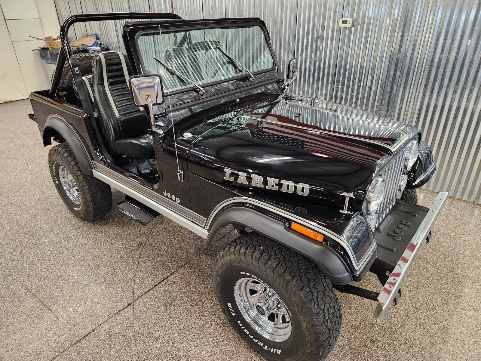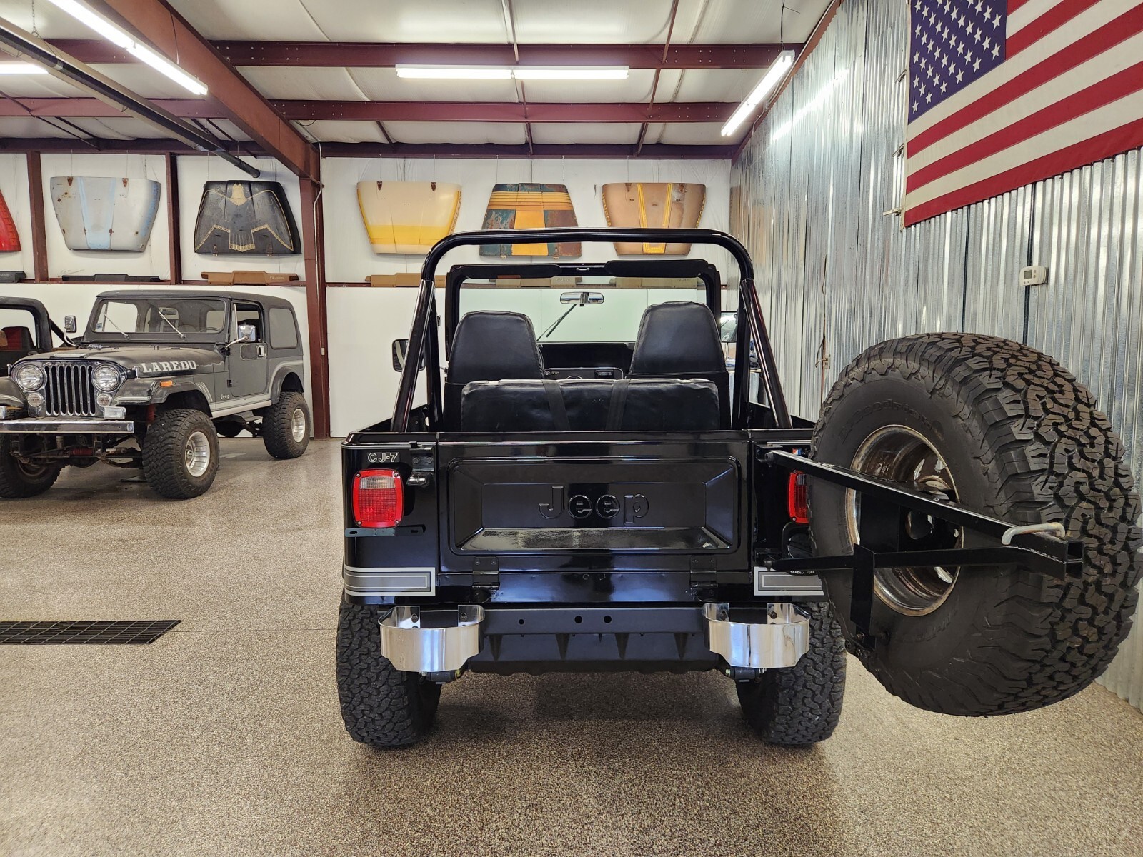 Always rot free classic black Jeep CJ7 Laredo from Texas and Arizona. Original steel body w no patching done ever Shiny steel oem floors.