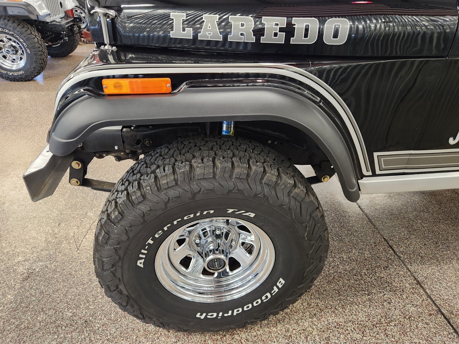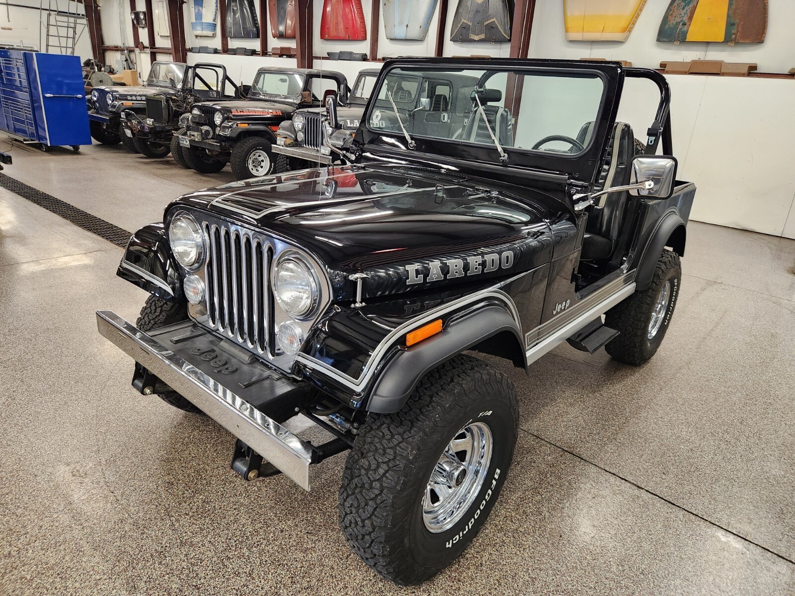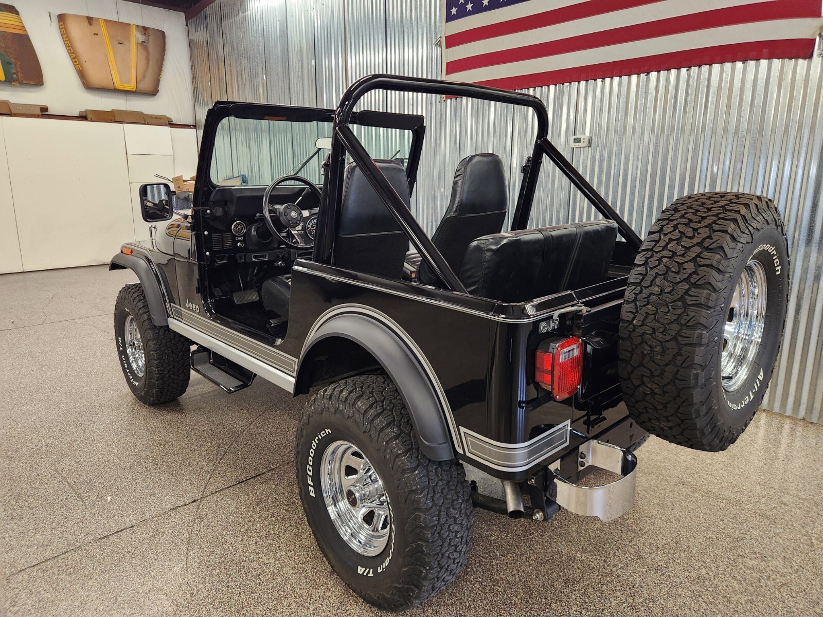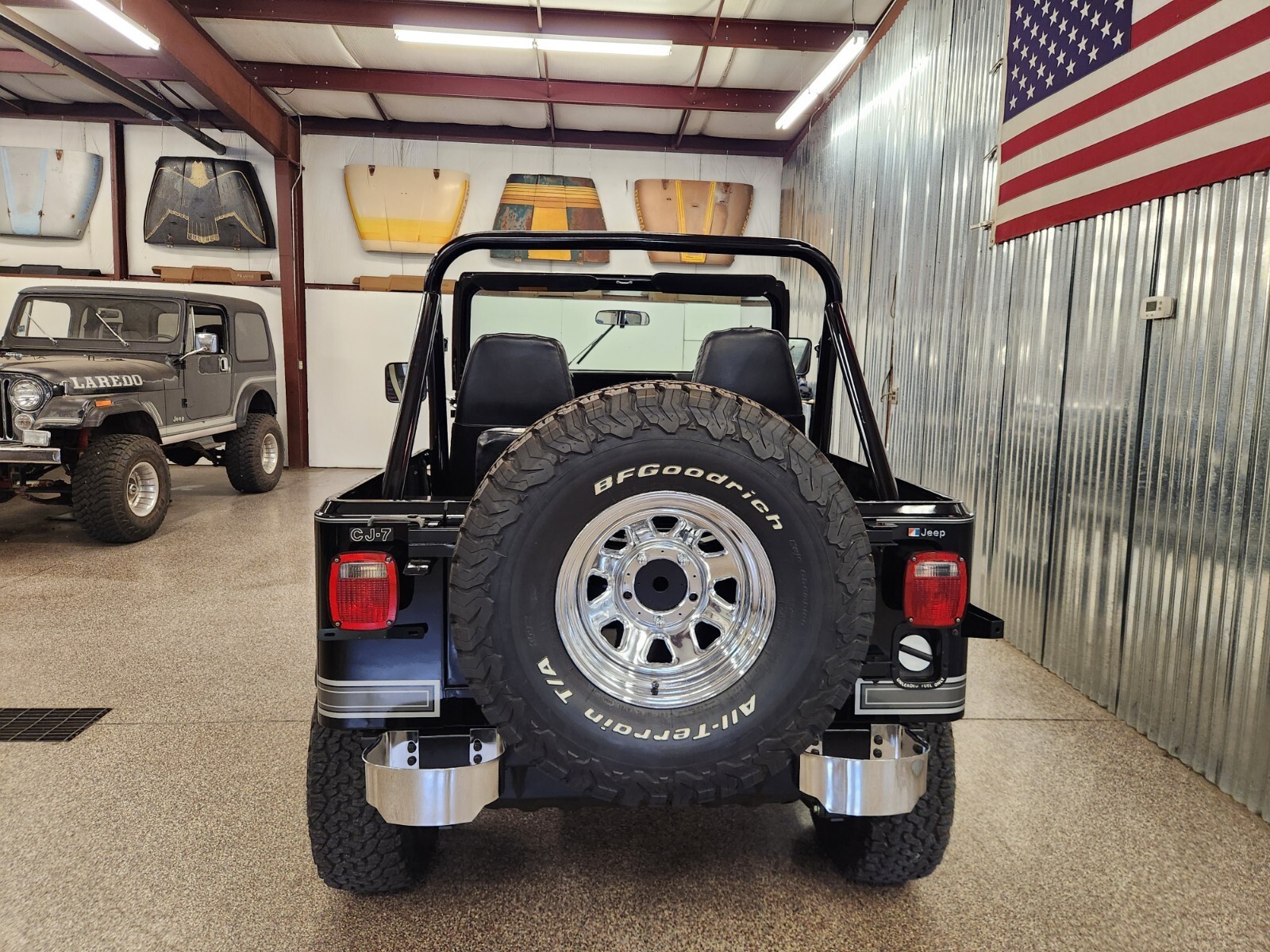 Always rot free classic black Jeep CJ7 Laredo from Texas and Arizona. Original steel body w no patching done ever Shiny steel oem floors.