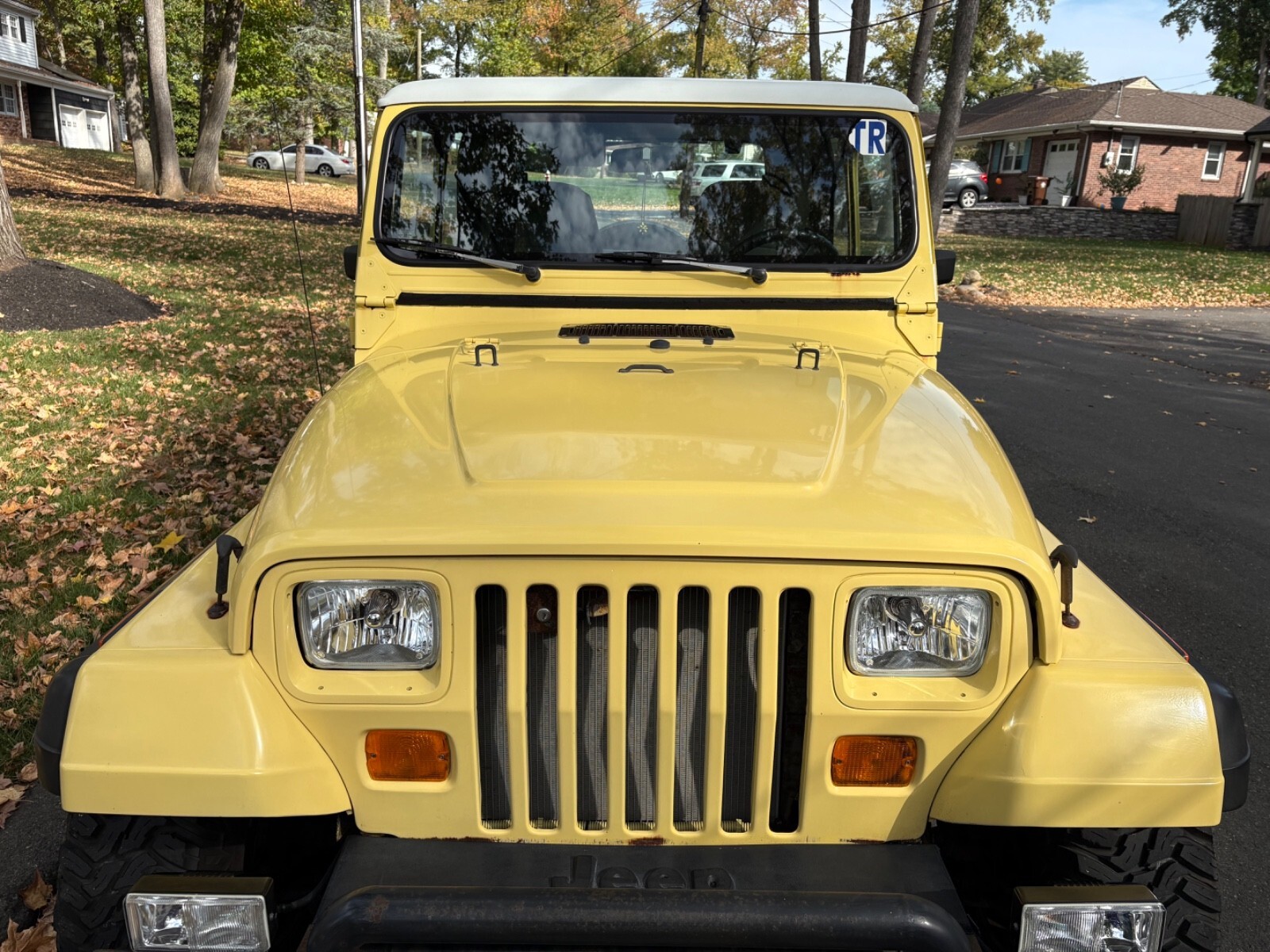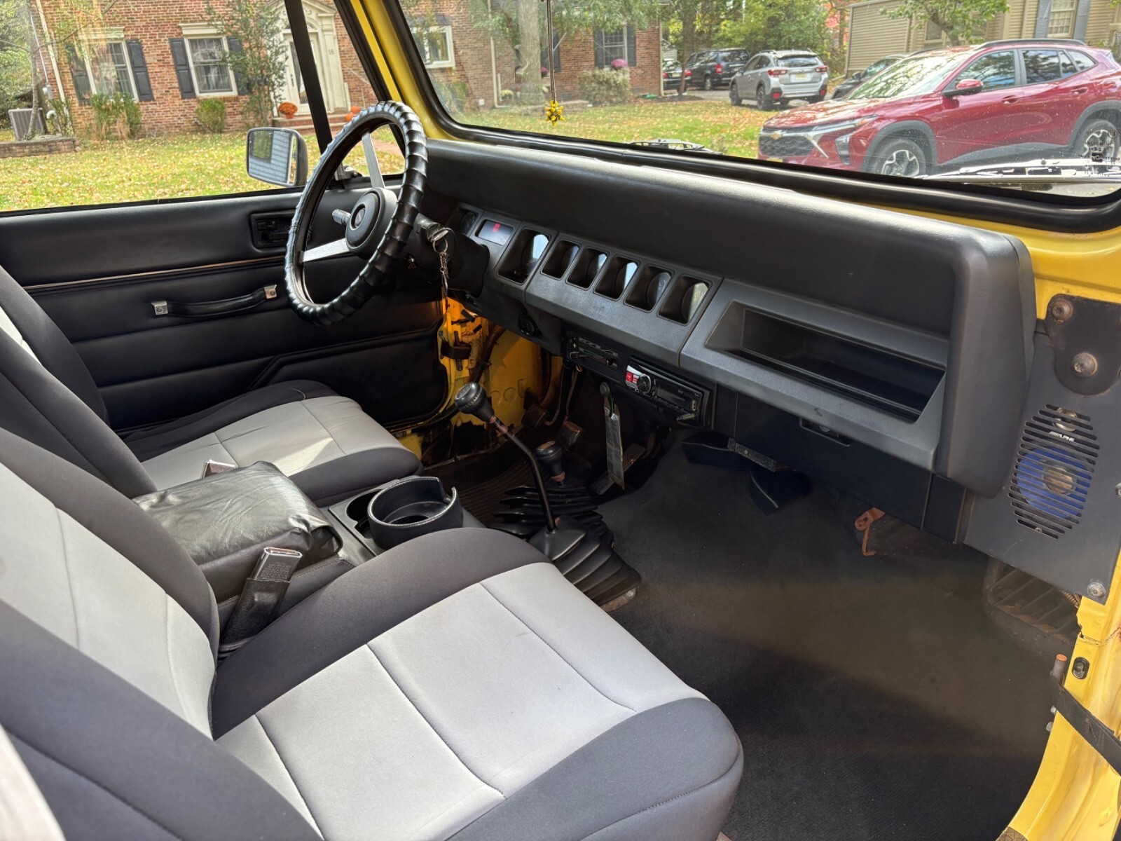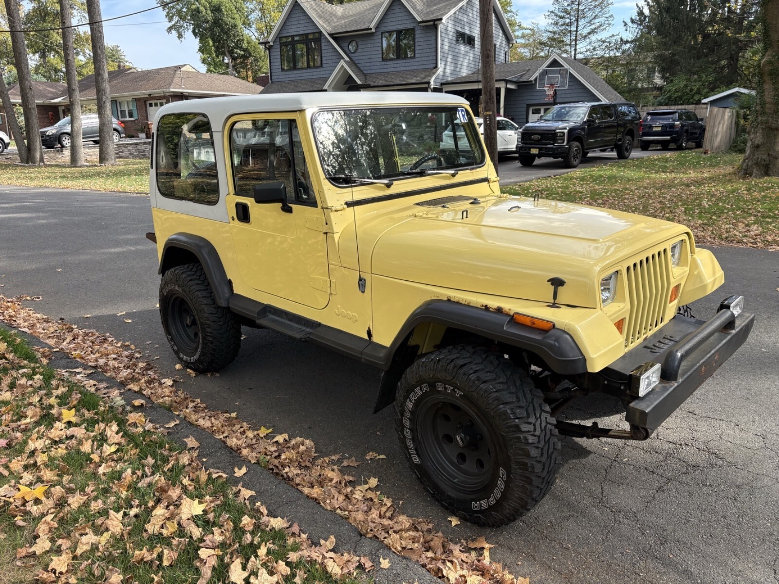 The 1992 Jeep Wrangler is a classic SUV with a black interior and yellow exterior, featuring a manual 5 speed transmission and 6 cylinder engine. With only 3 previous owners and 106,298 miles on the odometer, this 2 door vehicle is a reliable choice for anyone looking for a rugged and stylish off-road experience. It has a suspension lift and 31' off road tires. In addition to the hardtop, it has a soft top and bikini top. An aftermarket AM/ FM CD player and 6 speakers with amplifier to power the system were installed to enhance the listening experience.