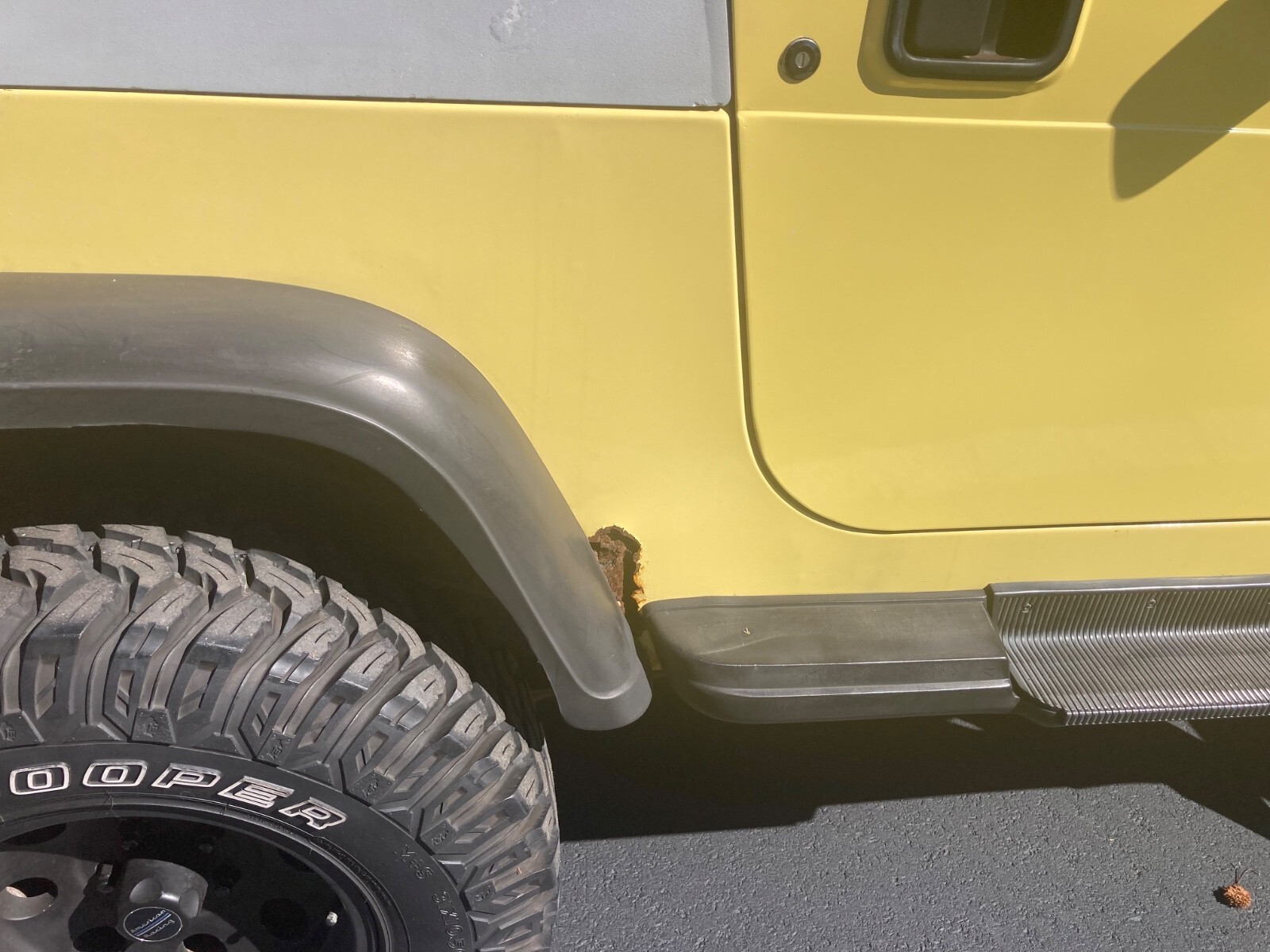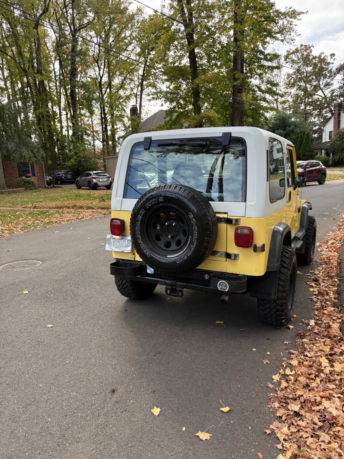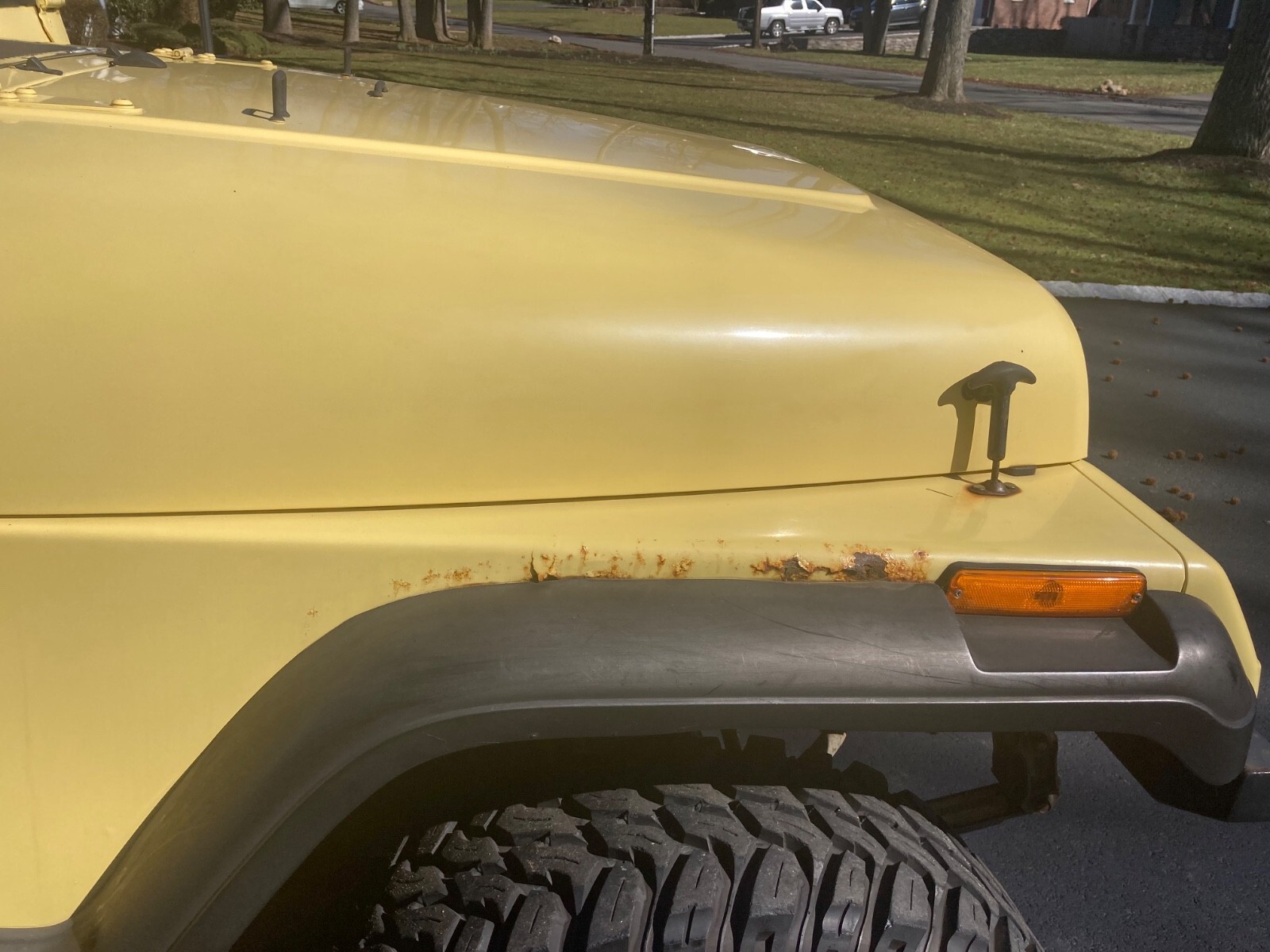 The 1992 Jeep Wrangler is a classic SUV with a black interior and yellow exterior, featuring a manual 5 speed transmission and 6 cylinder engine. With only 3 previous owners and 106,298 miles on the odometer, this 2 door vehicle is a reliable choice for anyone looking for a rugged and stylish off-road experience. It has a suspension lift and 31' off road tires. In addition to the hardtop, it has a soft top and bikini top. An aftermarket AM/ FM CD player and 6 speakers with amplifier to power the system were installed to enhance the listening experience.