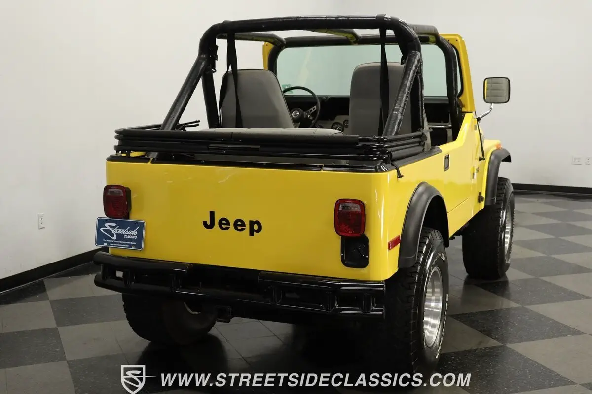 Rugged yellow fiberglass panels showcase American exploration at its finest on this 1976 Jeep CJ7, built for conquering wilderness trails and mountain passes. The vibrant yellow exterior captures the adventurous spirit of backcountry exploration while black plastic fender flares frame massive 33x12.50R15LT tires mounted on 15" ARE slotted alloy wheels. Off-road capability extends with heavy-duty bumpers while a black soft top adds all-weather versatility. The tilt-back hood provides easy access while the entire fiberglass body construction offers lightweight durability for tackling rough terrain.