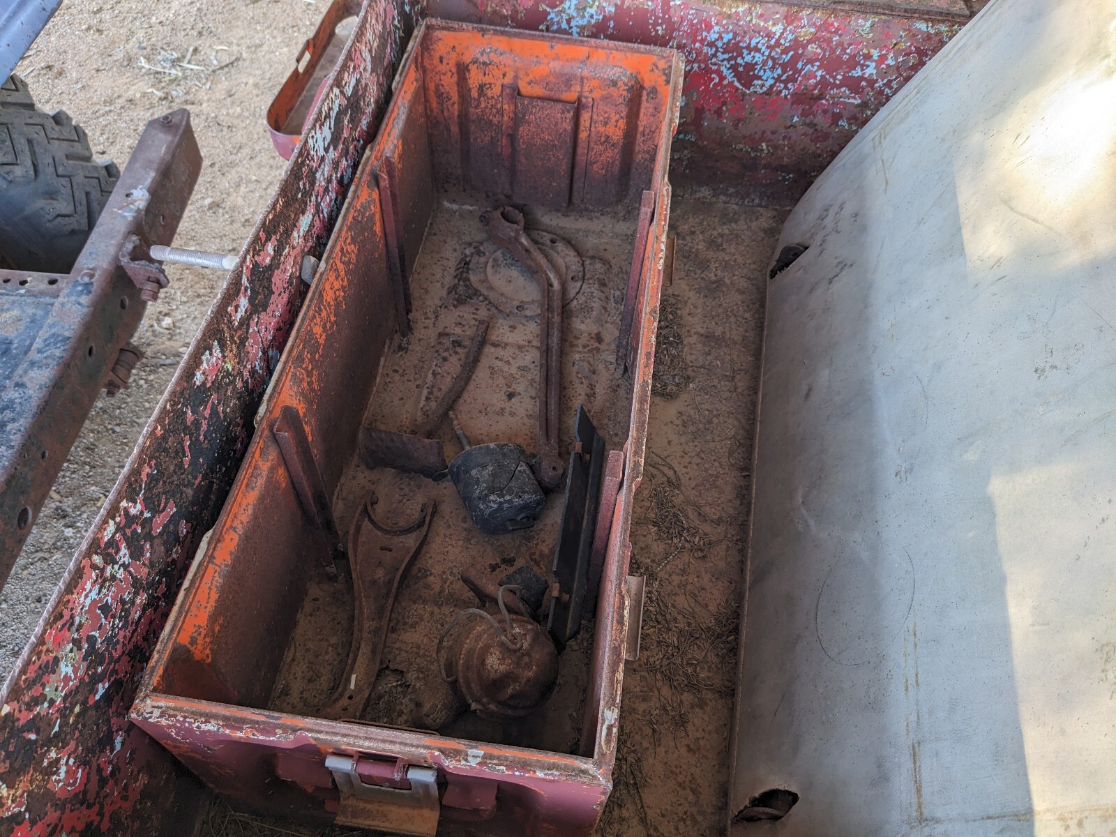 For what I have been able to find, this Jeep has spent all of its time in New Mexico and Arizona. I do not know the length of time that it has not been on the road but I would guess quite a while. There is no rust I have been able to find but there is quite a bit of body damage. With that, nothing significant but definitely shows trail use. In addition, there has been additional metal welded or riveted on top of the preexisting body metal along with a front tow bar for pull behind tasks and a storage box with additional parts.