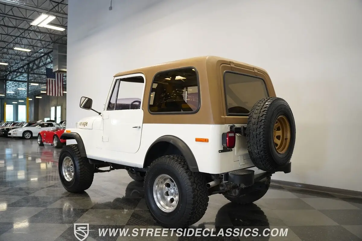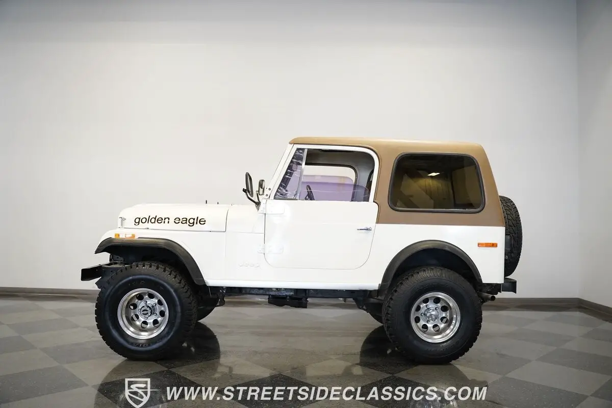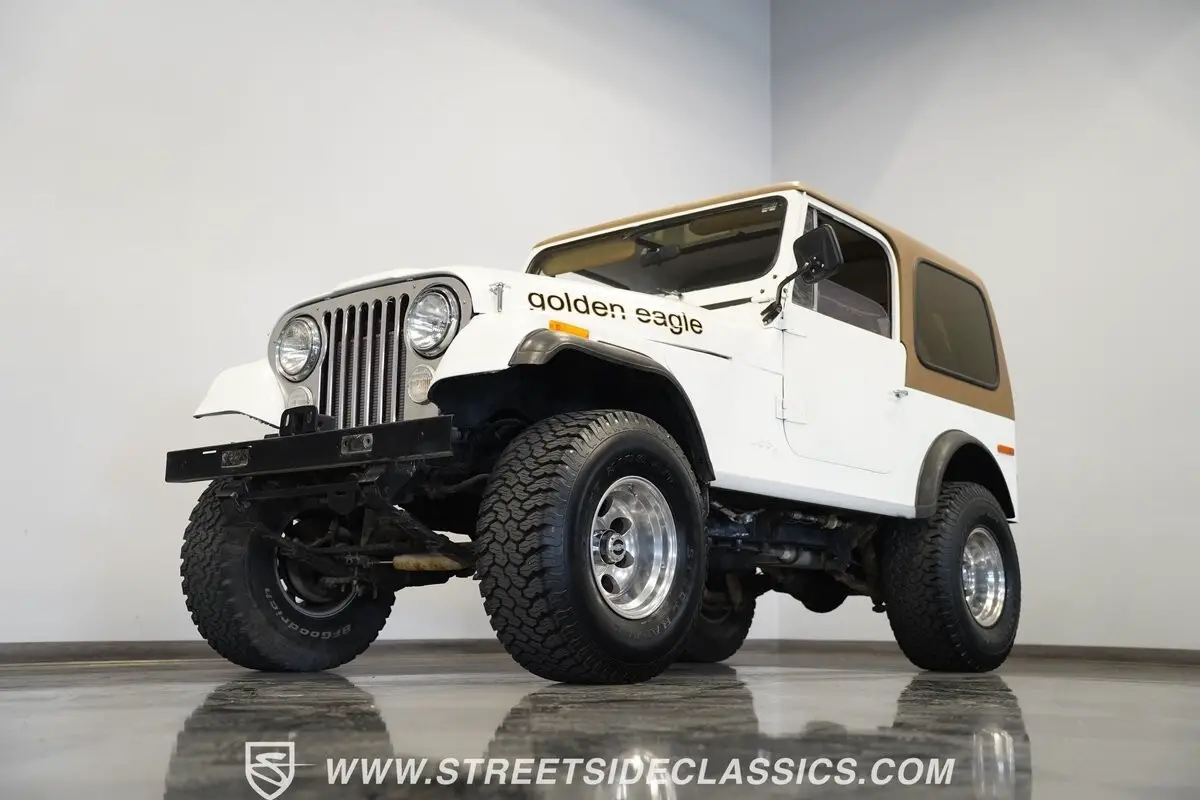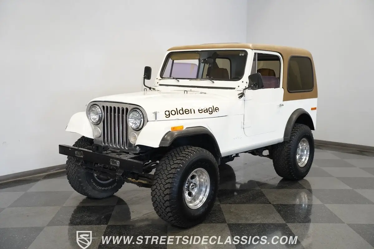Rolling on massive 33x12.50LT15 all-terrain tires, this 1980 Jeep CJ7 Golden Eagle features white exterior paint accented by distinctive gold eagle graphics. The exterior includes 15" chrome Mickey Thompson-style wheels and metal bumpers at both ends, plus LED tail lights for visibility after dark. Halogen headlights illuminate the path ahead while a brown removable hardtop allows for quick conversion. The chrome grille adds a finishing touch to the front end while providing the unmistakable Jeep face that off-road fans appreciate.