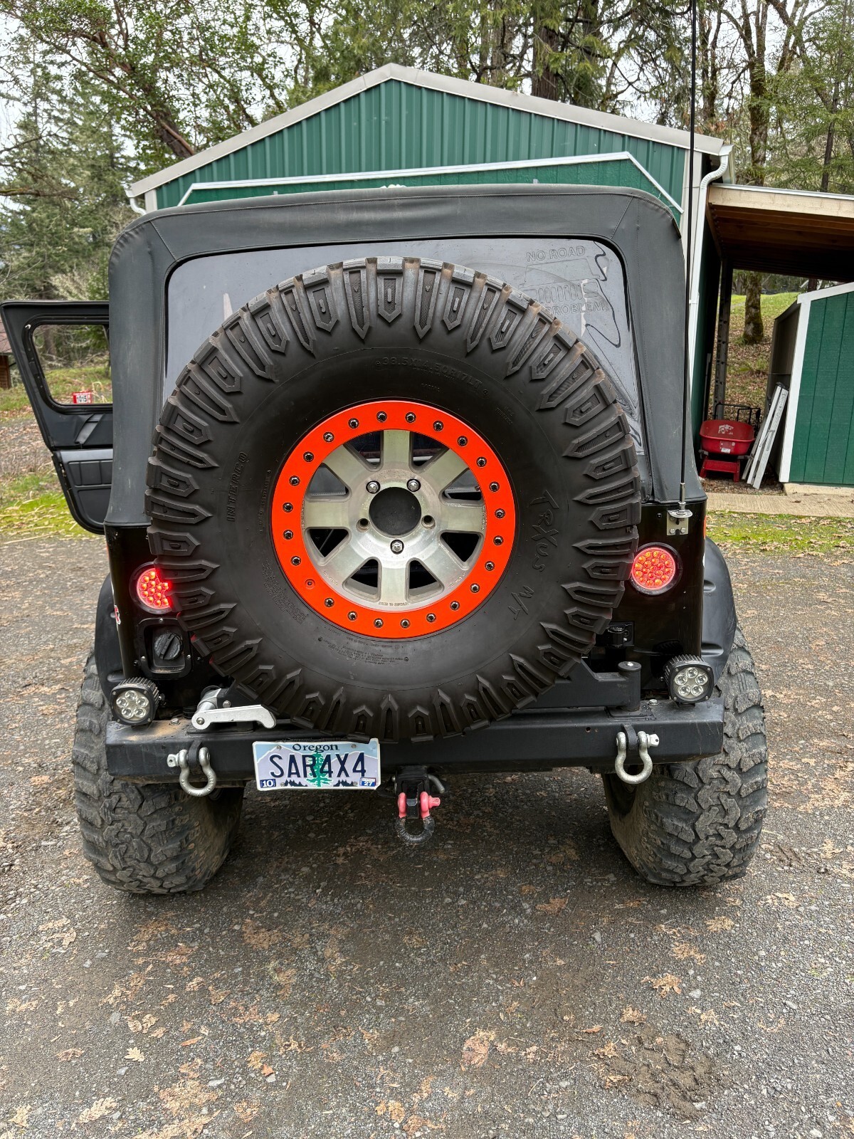 Spare Tire 38.5 X 12.5 X 17 Trux Tire w Aluminum Rim, Orange Beadlock