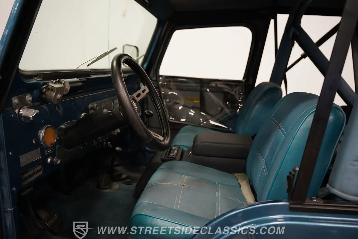 Stepping inside, the original blue Levi vinyl seats beckon with their distinctive charm, setting a vibrant contrast against the utilitarian dashboard. The addition of a Panasonic stereo system, coupled with extra speakers, enriches the cabin, ensuring that each drive is accompanied by a soundtrack as compelling as the landscapes it traverses.