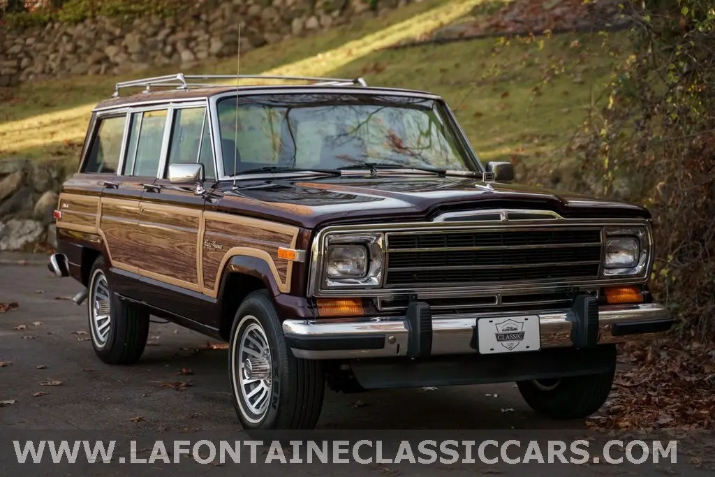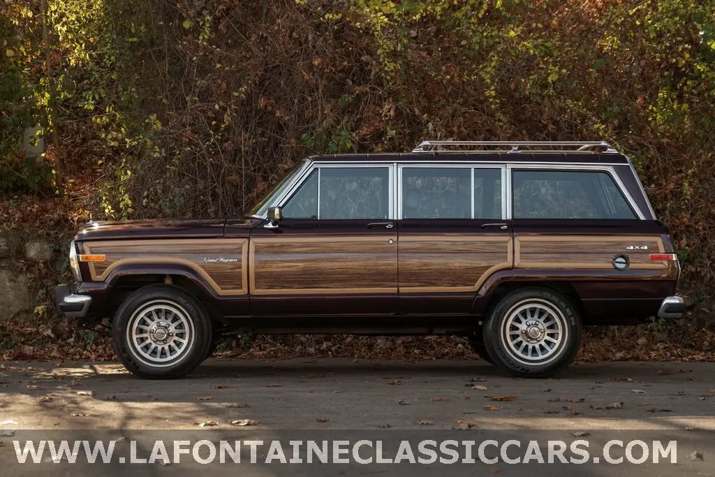This 1991 Jeep Grand Wagoneer is finished in Black Cherry with woodgrain paneling over maroon upholstery and is powered by a 5.9-liter V8 paired with a three-speed automatic transmission and a dual-range transfer case. A refurbishment completed in 2019 included removing the body from the frame, repairing rust, refinishing the body, and performing an engine and transmission rebuild. Equipment includes a Trac Lock rear differential, 15 alloy wheels, a roof rack with crossbars, a power tailgate window, power-adjustable front seats, air conditioning, cruise control, and a Jeep AM/FM/cassette stereo.