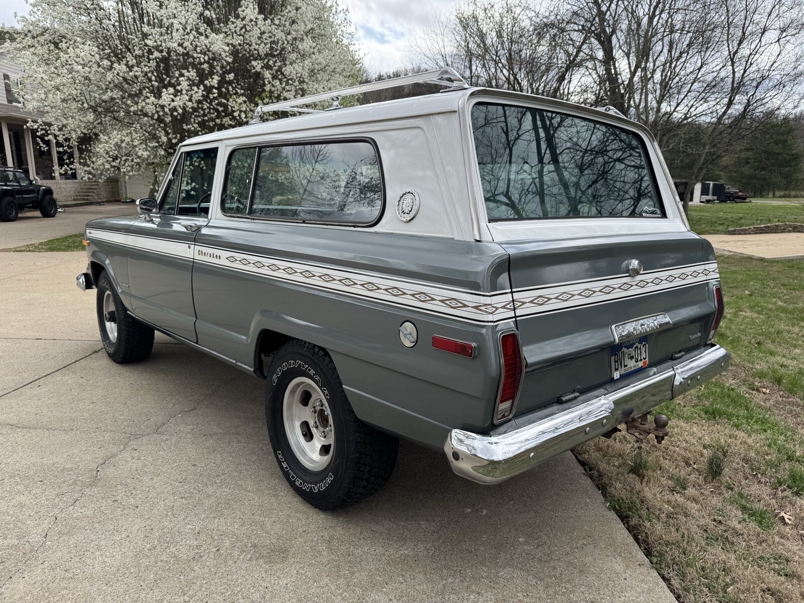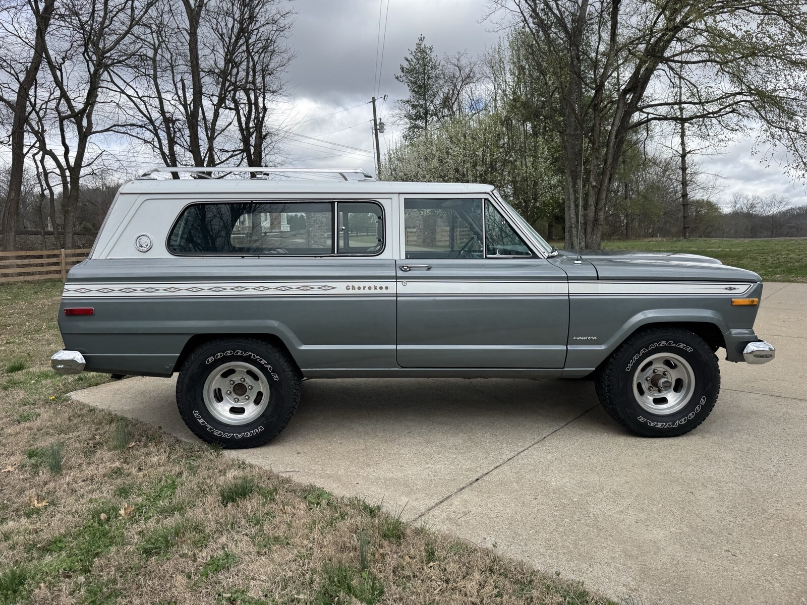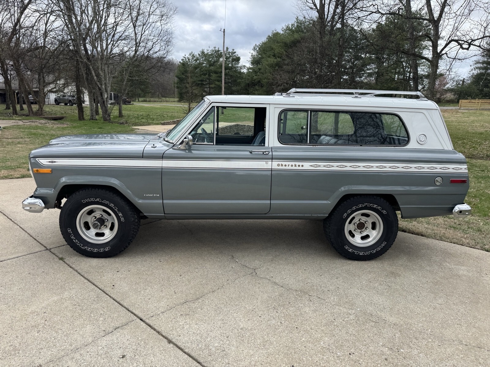 Pewter Grey Poly with the Alpine White 1975 Jeep Cherokee two door. AMC 360 with automatic transmission. Blue interior low backs. 15” slot wheels. Runs and drives good . All gauges work and lights. I consider this a mild project car. It needs the rear window motor looked at. Some of the seals are original and could stand to be replaced. The body overall is solid evident by its solid and not rotted floor pans. That said there are many rust bubble areas and the lower rockers need some work. With some attention to the details and paint fixes this could be a $25k Cherokee no problem.