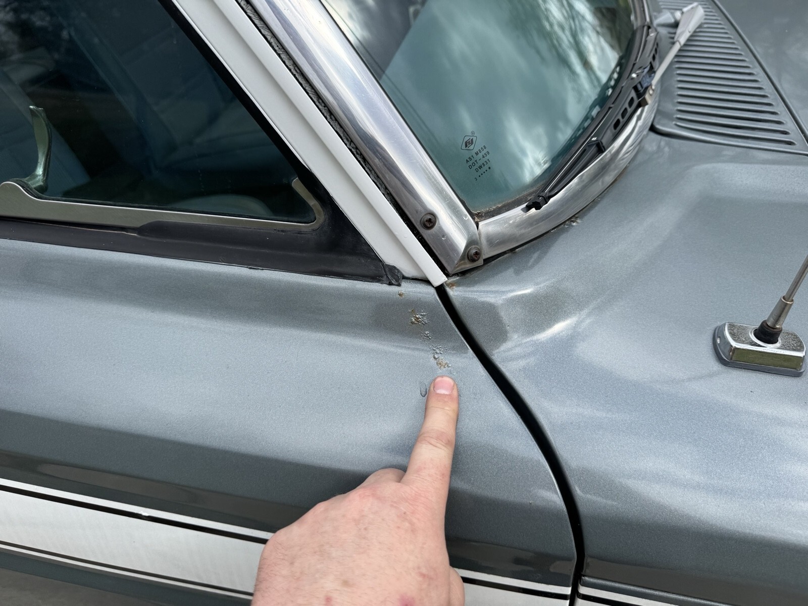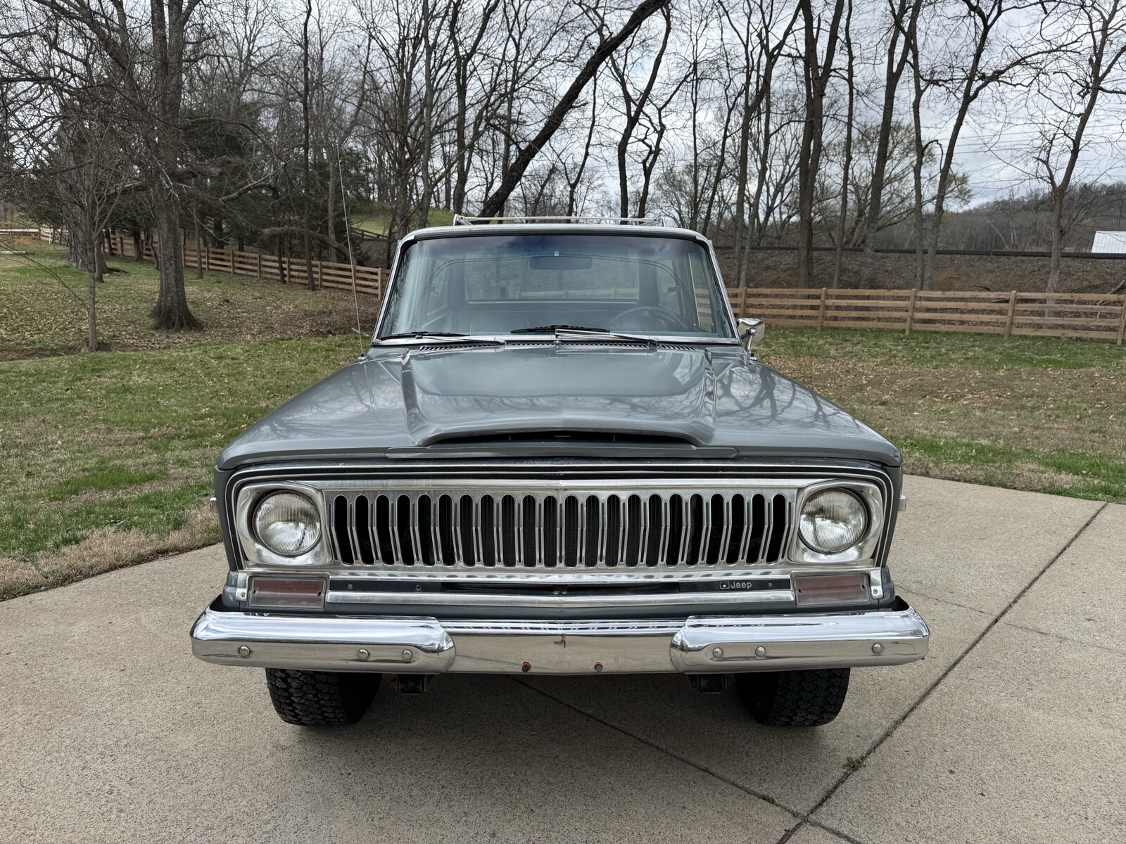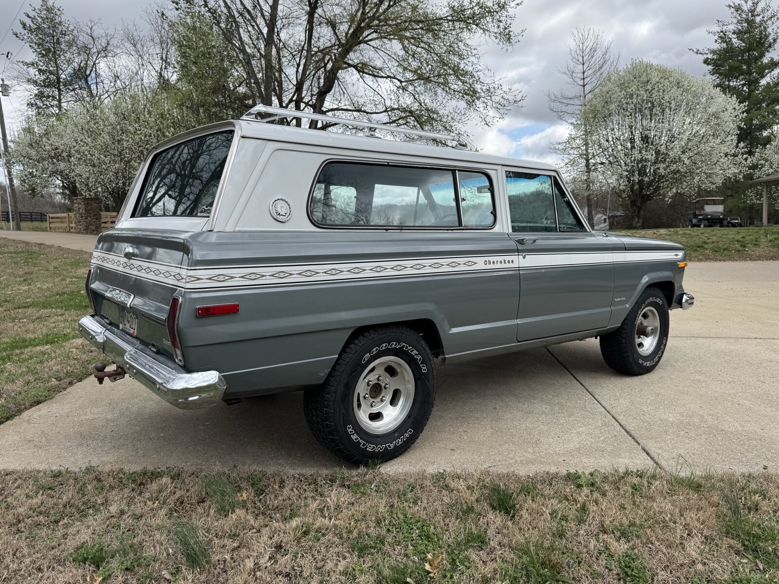Pewter Grey Poly with the Alpine White 1975 Jeep Cherokee two door. AMC 360 with automatic transmission. Blue interior low backs. 15” slot wheels. Runs and drives good . All gauges work and lights. I consider this a mild project car. It needs the rear window motor looked at. Some of the seals are original and could stand to be replaced. The body overall is solid evident by its solid and not rotted floor pans. That said there are many rust bubble areas and the lower rockers need some work. With some attention to the details and paint fixes this could be a $25k Cherokee no problem.