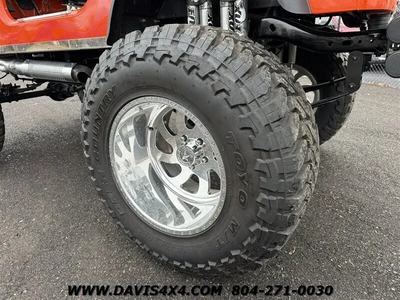 This 1986 Jeep CJ-7 Blower-Powered Monster is a fully customized, no-expense-spared show vehicle that represents a true bucket-list build for its previous owner, with well over $100,000 invested. At the heart of the Jeep is a BDS supercharger setup with polished dual four-barrel carburetors, custom headers, and a full custom exhaust system, all wrapped in a striking Hugger Orange finish with pearl-ghosted flame graphics. The build continues with Corbeau custom seating, a completely new fuel system from the tank to the engine with braided lines, custom doors, FOX shocks with remote reservoirs at all four corners on custom mounts, and a one-off ladder bar/traction bar system to manage the power. It rides on high-polish American Force wheels wrapped in new 40-inch Toyo tires, giving it an unmistakable stance and presence. While photos barely capture the impact of this Jeep, it is a turnkey showpiece that is fully operational and