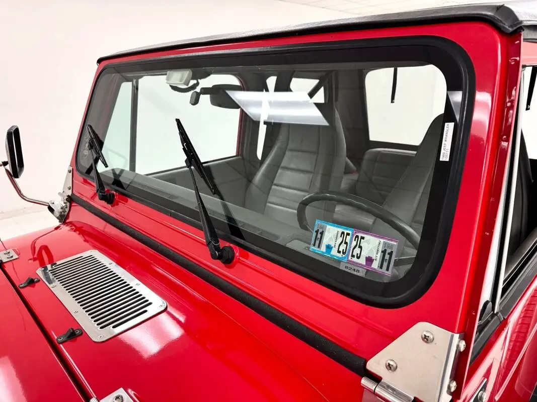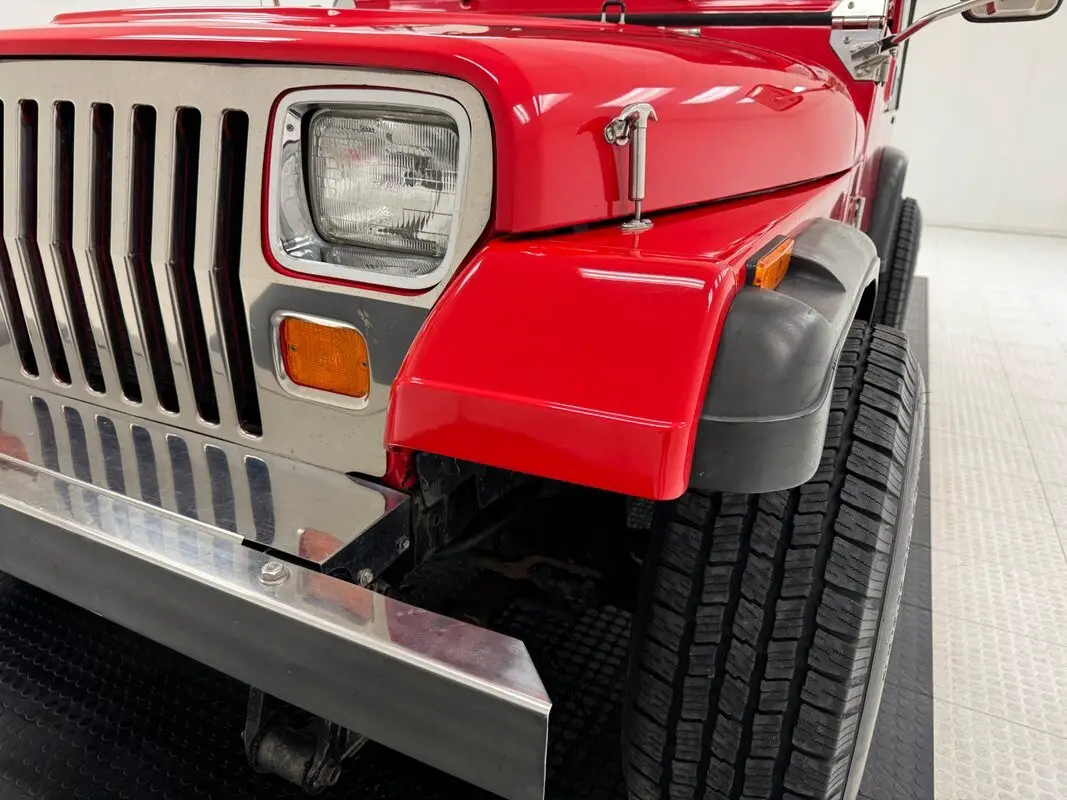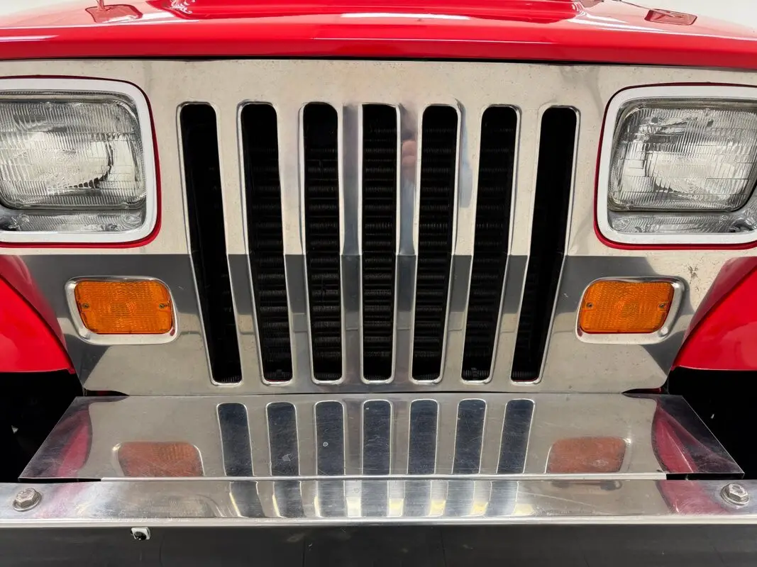 As a first gen YJ, this 1989 features square headlights which were subject to some early consternation but eventually gained wide acceptance. On this car, they're framed in a dressy chrome grille and outlined in red, matching the exterior's Bright Red coat of paint. The bumpers are polished metal and a band of trim runs along the rocker panel that also features a mirror-like finish. Hinges, latches, door handles,
