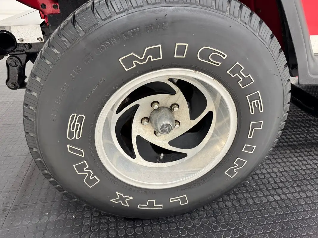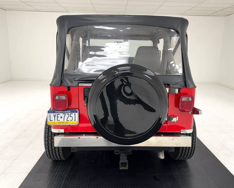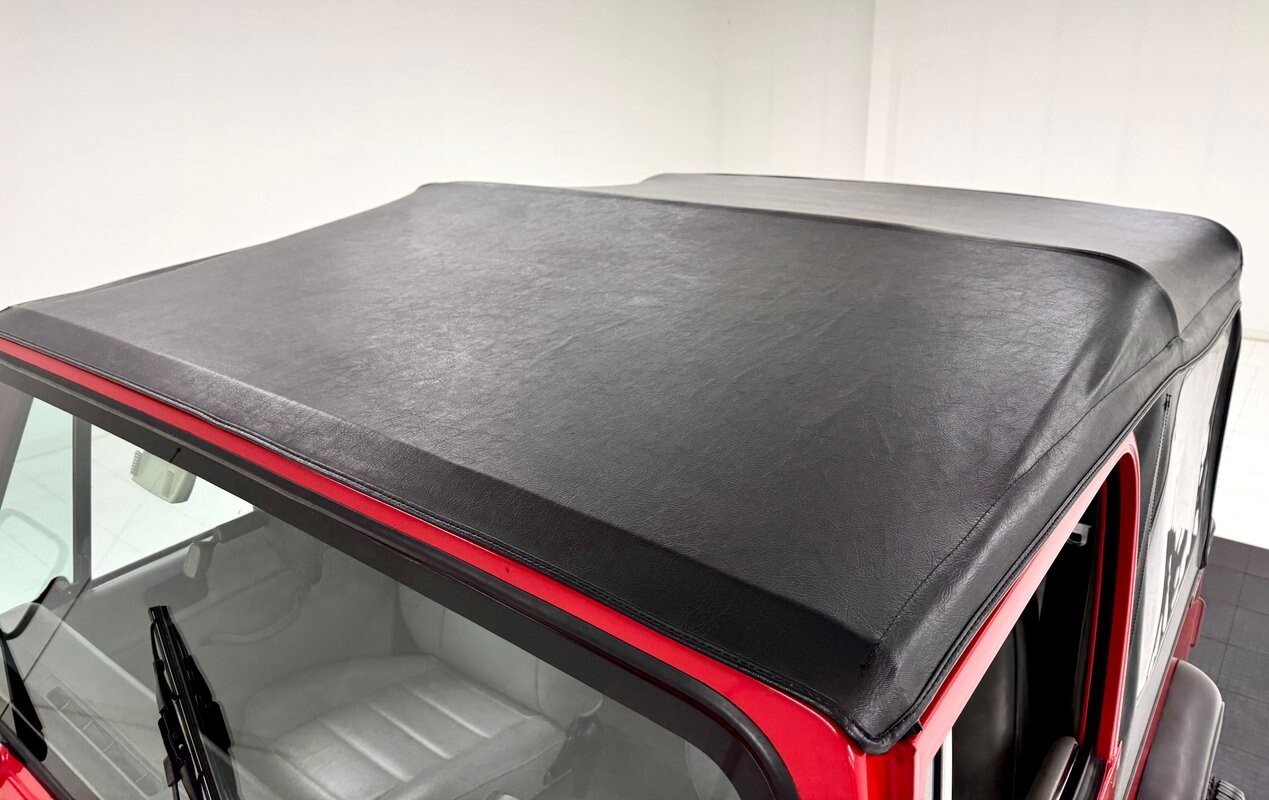 As a first gen YJ, this 1989 features square headlights which were subject to some early consternation but eventually gained wide acceptance. On this car, they're framed in a dressy chrome grille and outlined in red, matching the exterior's Bright Red coat of paint. The bumpers are polished metal and a band of trim runs along the rocker panel that also features a mirror-like finish. Hinges, latches, door handles, and mirrors add yet more bling while black highlights include the fender flares, nerf bars, and canvas top. It's all brought together with the 15-inch American Racing wheels which have black inserts and LT rated Michelin tires. Imperfections include a few scratches and scuffs.