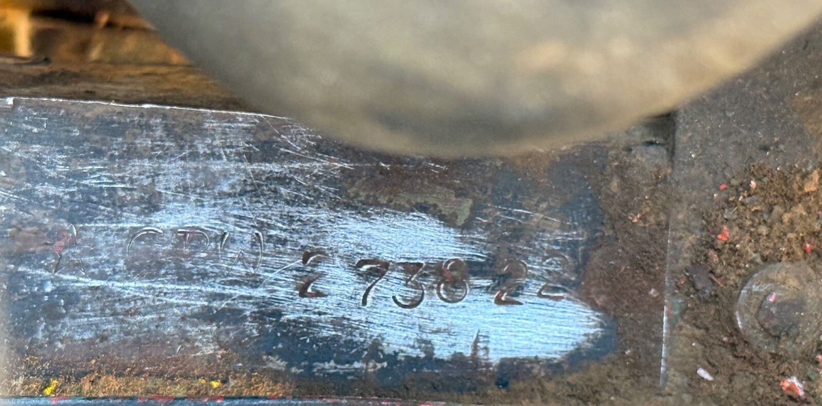 Frame: Front gussets have been removed, frame horns are intact and straight; has extra metal welded on to support the winch, but nothing that can't be easily cleaned up with a grinder. All body mounts are intact, as is the machine gun support and all shock mounts. Rear "A" frame has been cut and needs to be replaced. Left rear frame horn is straight and intact including the bumper mounting tab, the right one is missing about half inch off the end. Transfer case transmission support beam mounts have also been slightly cut to accommodate the T-90 transmission. Frame is straight with no serious rot or rust and can be easily restored. Serial number: 273822.