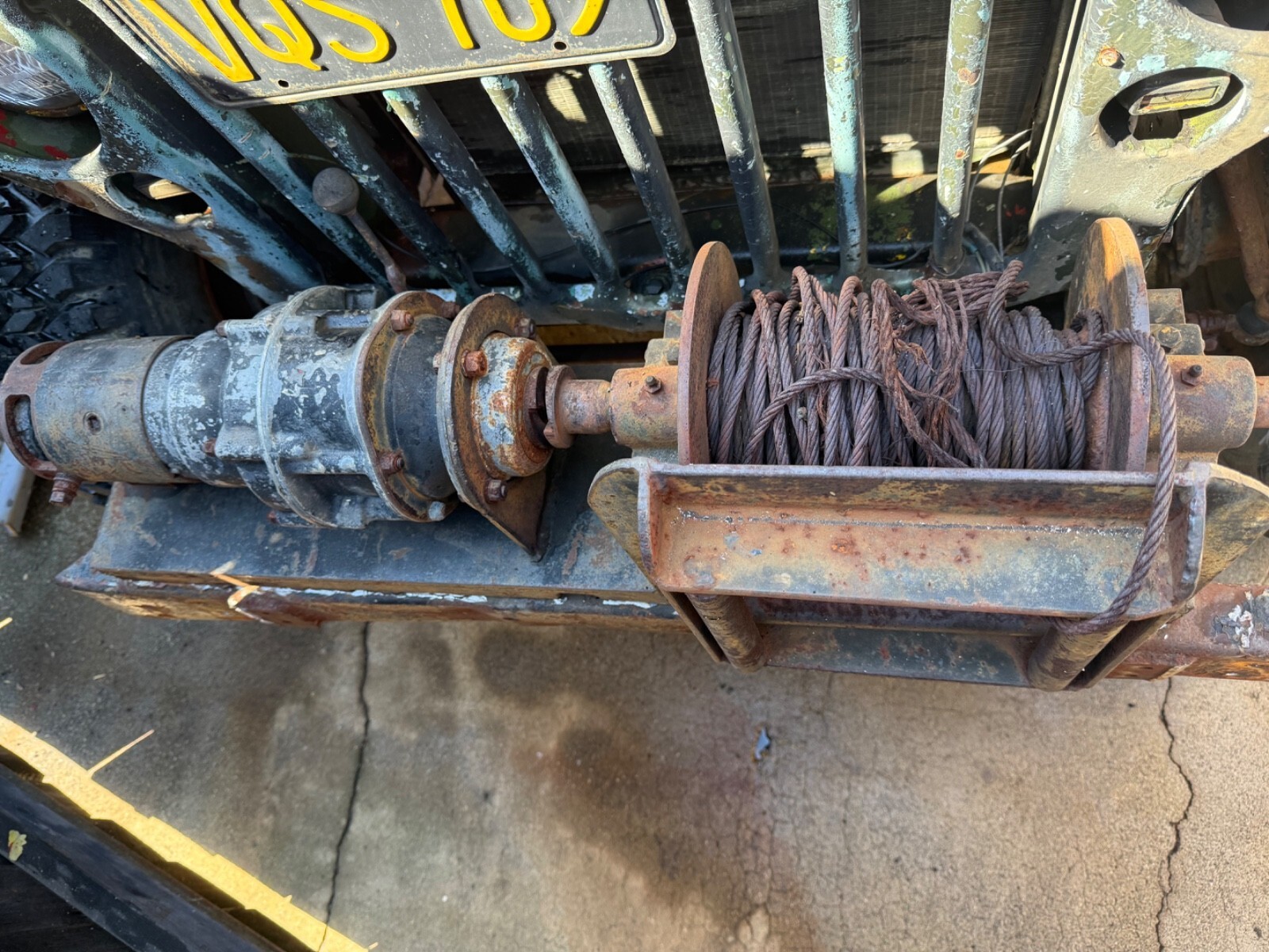Front has a large winch assembly welded to the front bumper and frame, can be easily removed.