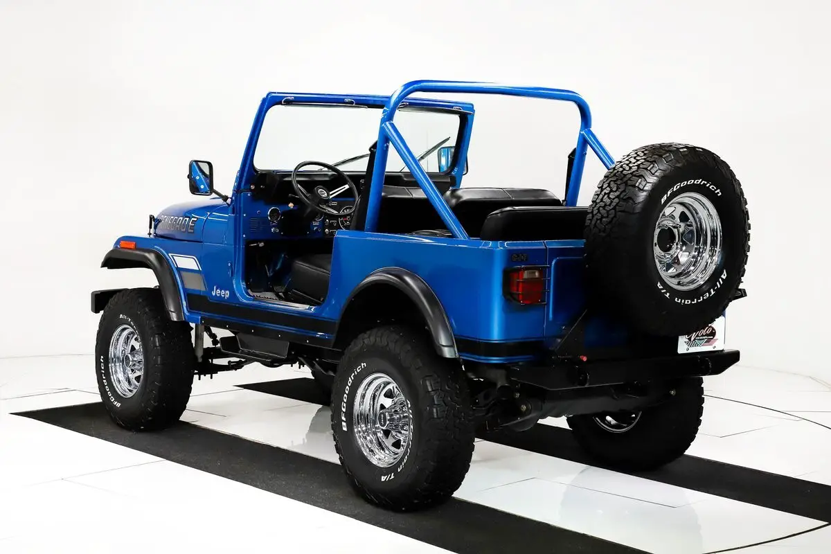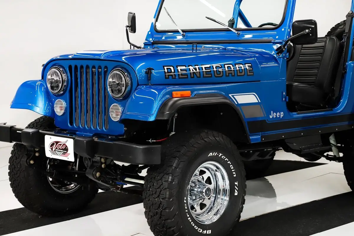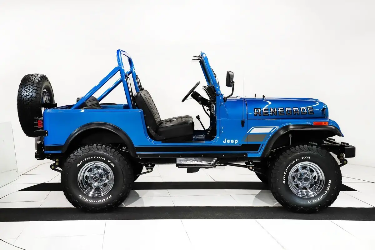 EXTERIOR: There's is nothing like the open air experience in a Jeep Renegade CJ7. The builder started with a rust free body that he hand selected for quality then stripped it down to bare metal. We have pictures of it stripped bare. All the panels are nice and straight and it has good gaps. The professionally applied Ballistic Blue Metallic paint has been laid out evenly and with great detail then was polished to a smooth and slick finish. All the vinyl stickers have been replaced and look fresh. The front