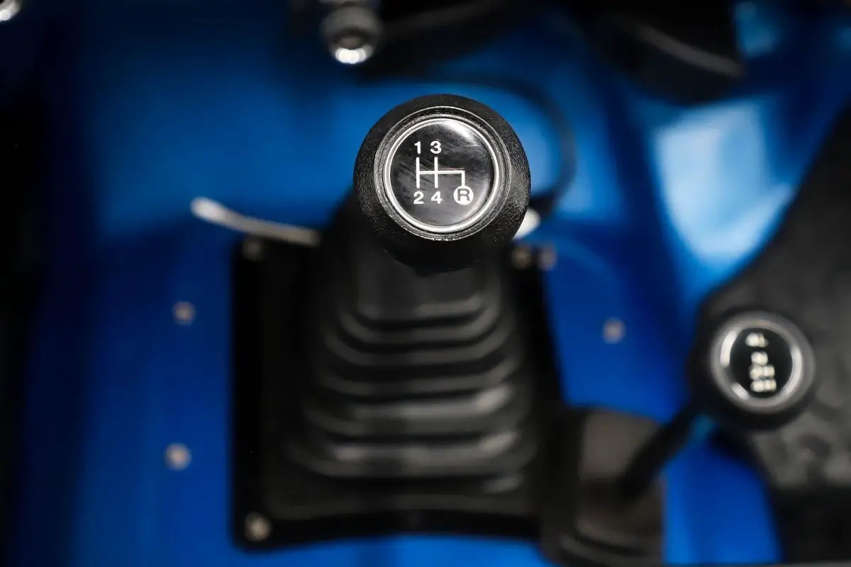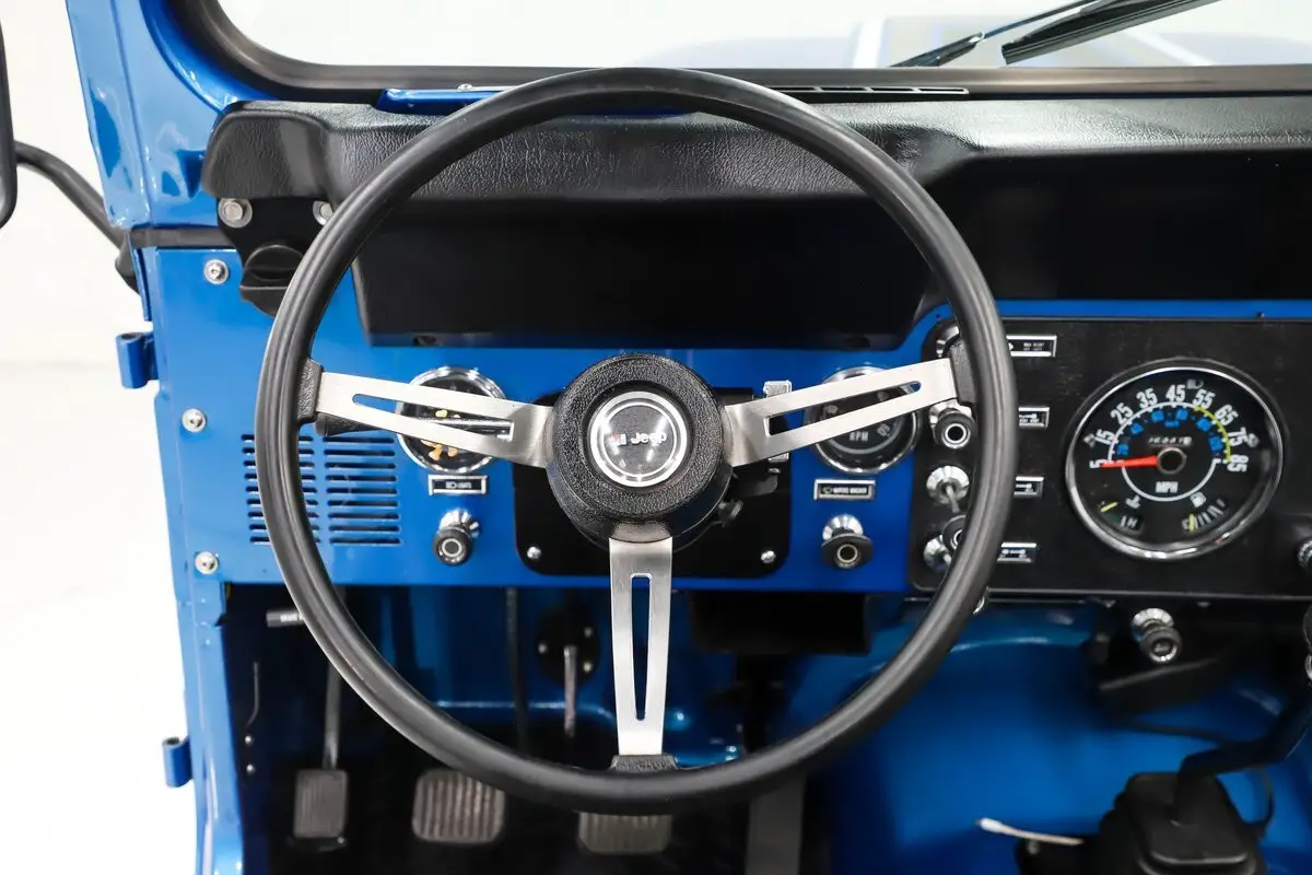 EXTERIOR: There's is nothing like the open air experience in a Jeep Renegade CJ7. The builder started with a rust free body that he hand selected for quality then stripped it down to bare metal. We have pictures of it stripped bare. All the panels are nice and straight and it has good gaps. The professionally applied Ballistic Blue Metallic paint has been laid out evenly and with great detail then was polished to a smooth and slick finish. All the vinyl stickers have been replaced and look fresh. The front grille is excellent, and it was upgraded with LED headlights too. The fender flares are also fresh. It is equipped with a fold down front windshield, dual side mirrors, a full size spare tire on matching rim that has a swing out mount, plus brush guards for the rear taillights. The side steps are a much appreciated addition. It is sitting on beautiful chrome 15" Jeep rims wrapped in beefy BFGoodrich Baja Champion All-Terrain T/A tires that are size 33x10.5R15LT. A complete, brand new convertible top and soft doors is available for only $1,700