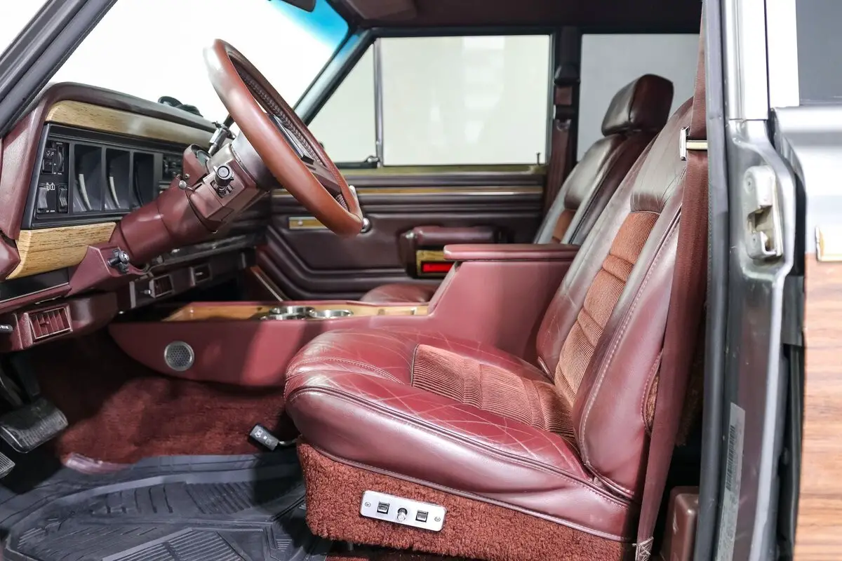 Inside, the red leather interior delivers a bold contrast and a level of comfort that helped separate the Wagoneer from anything else in its class. Bucket seating, a custom center console with cupholders, overhead console, and modern aftermarket stereo blend vintage charm with everyday usability. Power windows, power locks, and air conditioning round out a cabin that still feels upscale decades later.