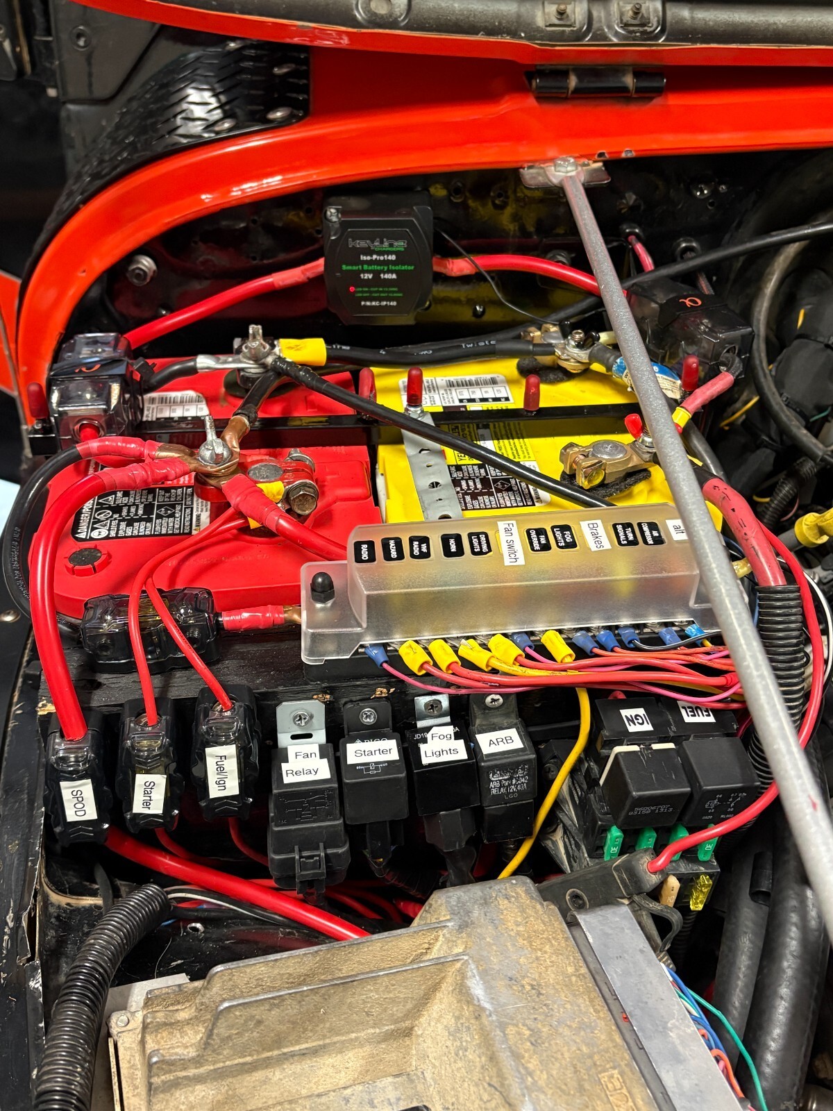 - Full professional rewiring: Entire dash and under-hood wiring redone, with all under-hood wiring neatly routed in a professional-looking loom. New Raynes 12-fuse panel, labeled relays, dual Optima batteries with VSR isolator.