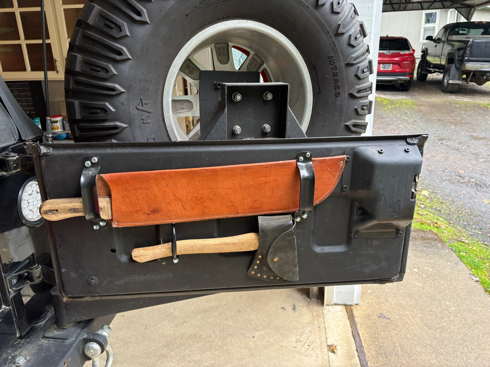 Passenger door canvas has a patched rip (visible inside and out). Soft top has a patched rip above the passenger rear window. Machete and axe mounted on the tailgate do not come with the Jeep.