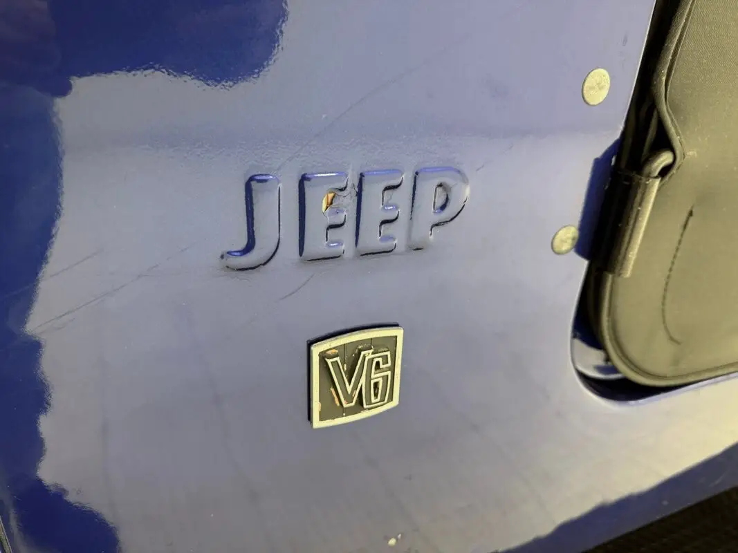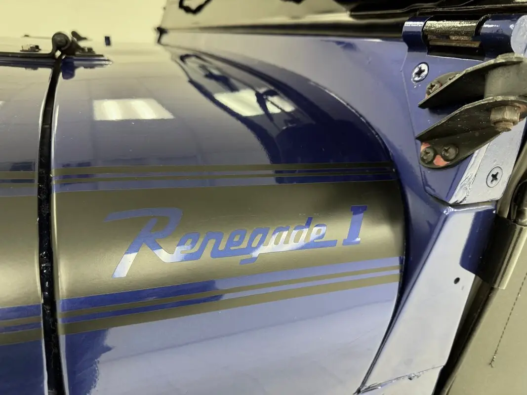 A nice mix of black and blue adorn this CJ with Dark Blue Metallic paint coupled with a Best Top black canvas top and doors along with satin black Renegade tape stripes on the hood. 16-inch black steel wheels at each corner. Let's say you're taking your motorhome to the mountains to do some wheeling. Well, this CJ is equipped with a front tow bar so you can bring it along and LT tires that can handle the trails, each with a mid 2021 date code. Out back, you have a mounted spare tire, a camouflage Jerry can, and both a ball hitch and 2" receiver with wiring front and rear for a winch. Modest black fender flares keep this Jeep narrow and therefore more agile through tighter spaces. Imperfections include various chips and scratches, bubbles in the paint, paint peel at the gas filler, and scuffs.