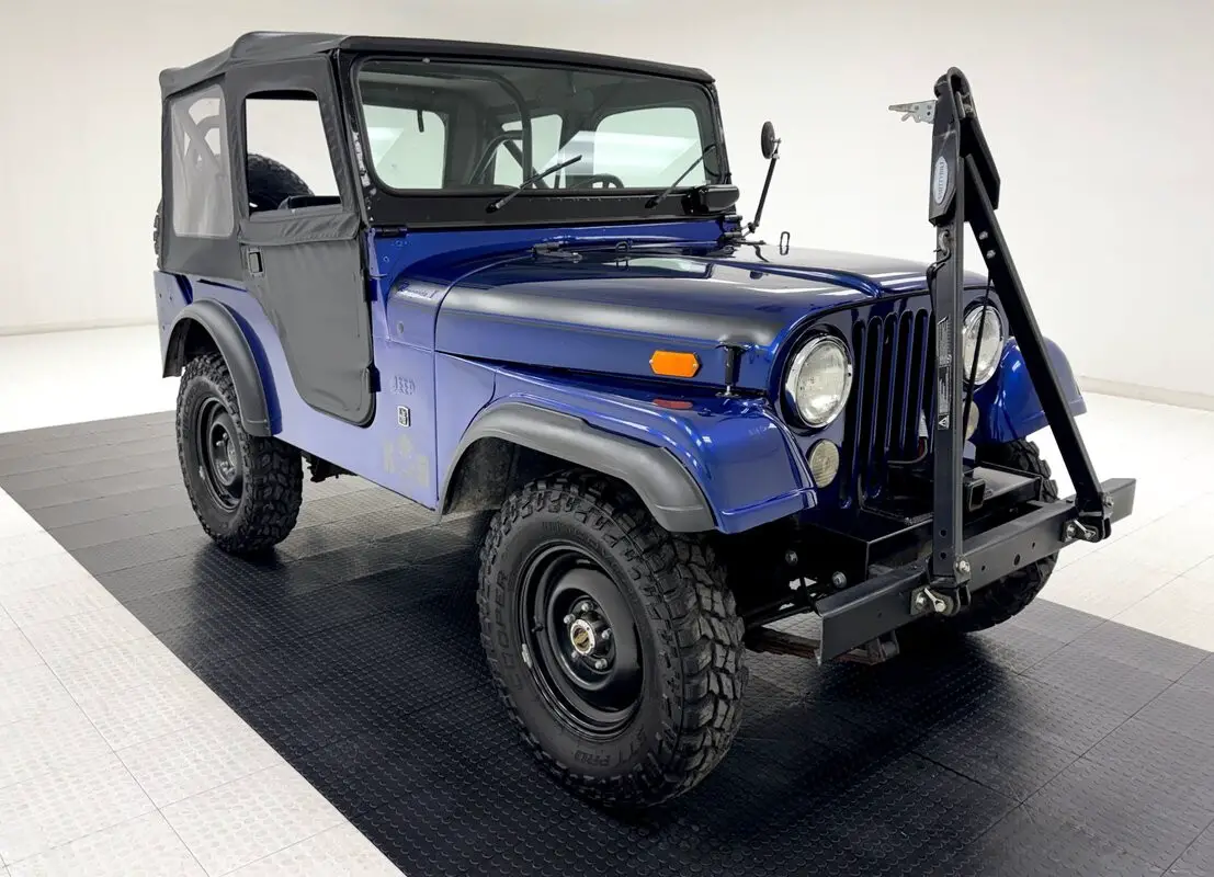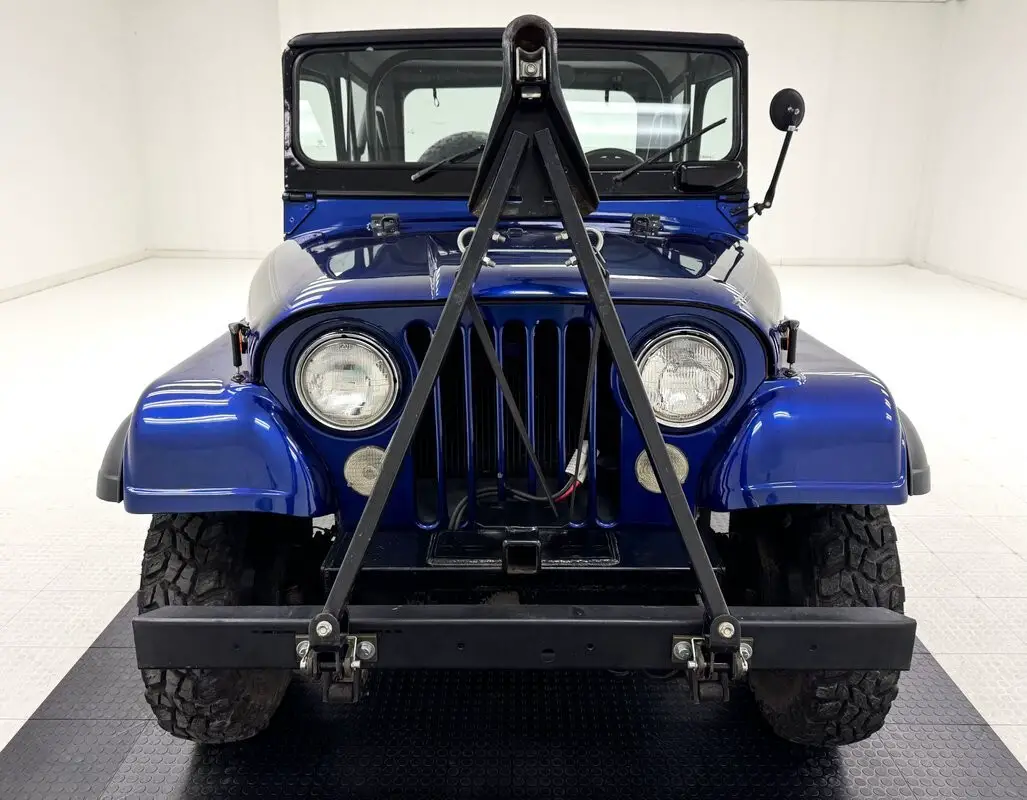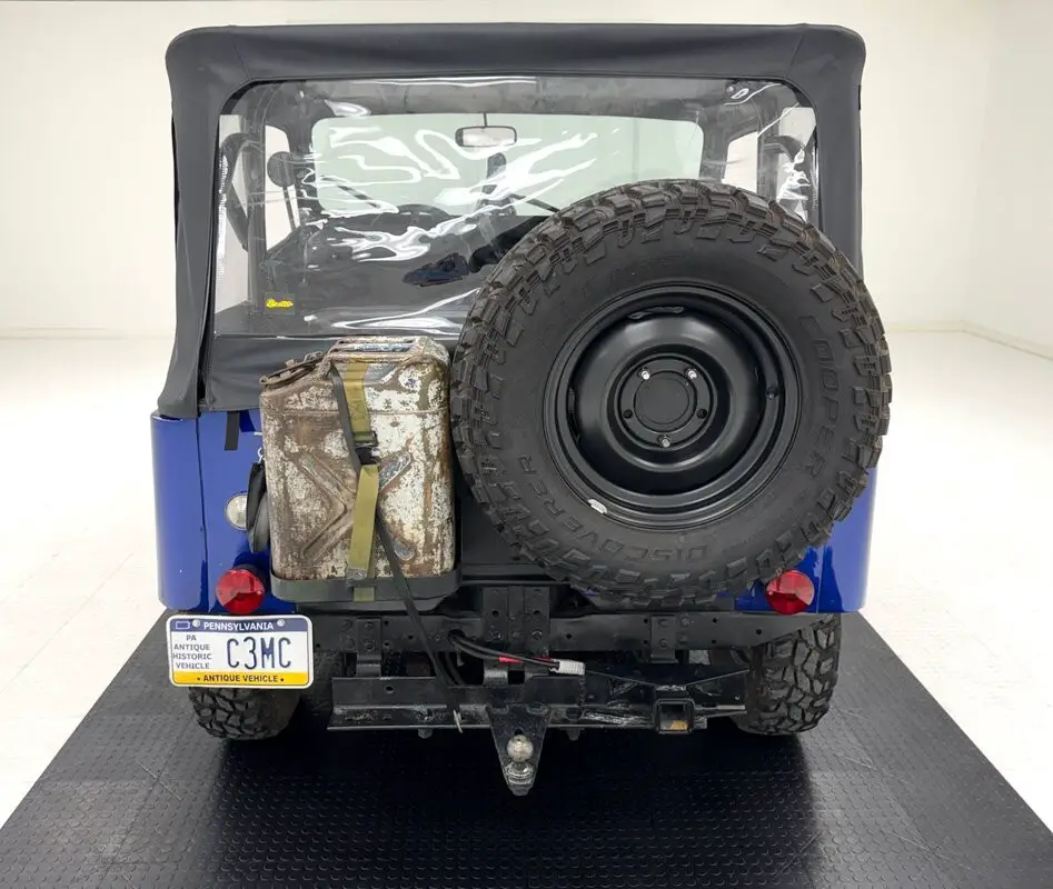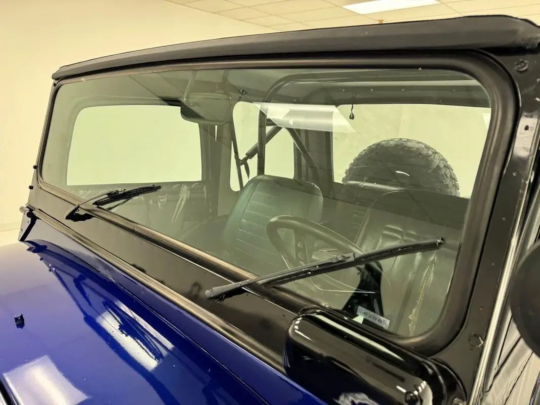 A nice mix of black and blue adorn this CJ with Dark Blue Metallic paint coupled with a Best Top black canvas top and doors along with satin black Renegade tape stripes on the hood. 16-inch black steel wheels at each corner. Let's say you're taking your motorhome to the mountains to do some wheeling. Well, this CJ is equipped with a front tow bar so you can bring it along and LT