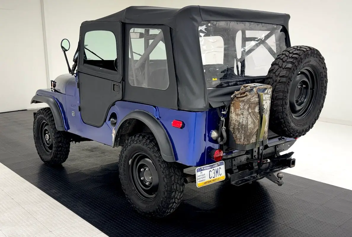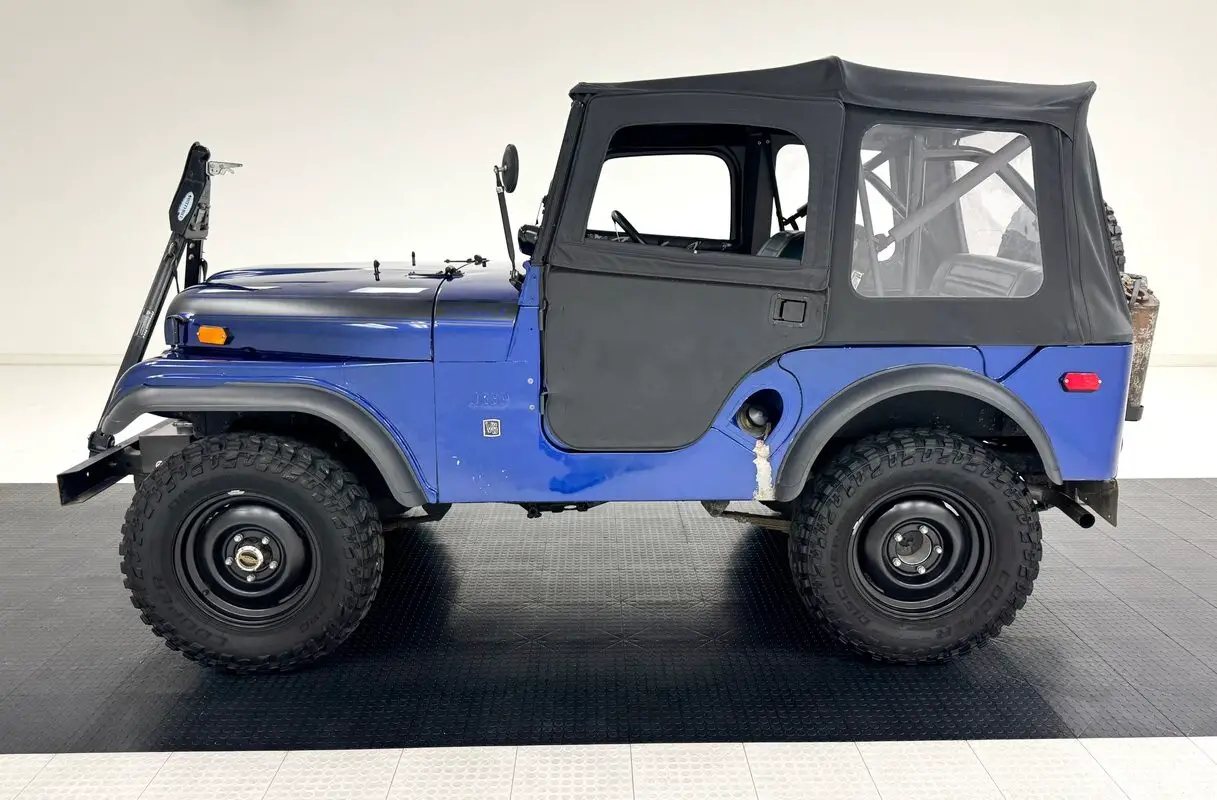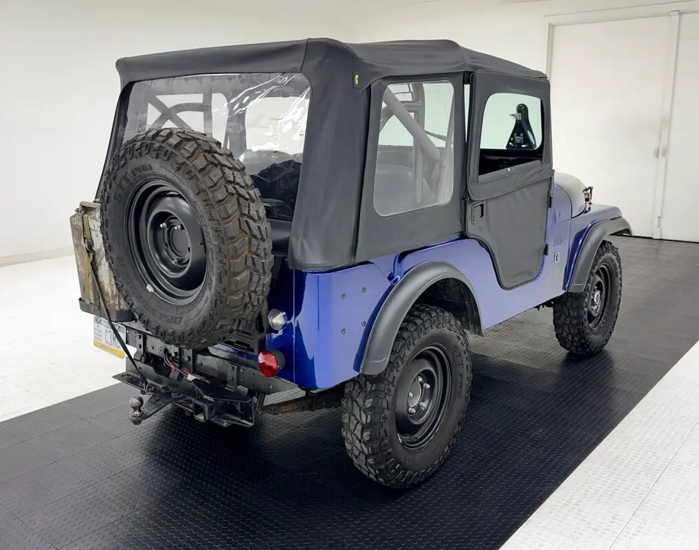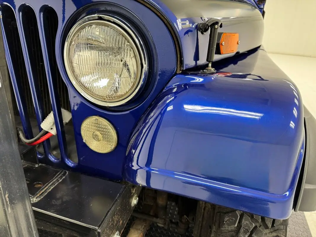A nice mix of black and blue adorn this CJ with Dark Blue Metallic paint coupled with a Best Top black canvas top and doors along with satin black Renegade tape stripes on the hood. 16-inch black steel wheels at each corner. Let's say you're taking your motorhome to the mountains to do some wheeling. Well, this CJ is equipped with a front tow bar so you can bring it along and LT