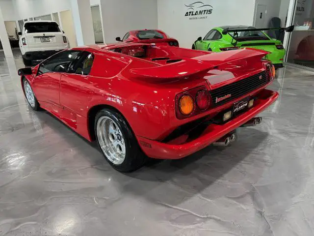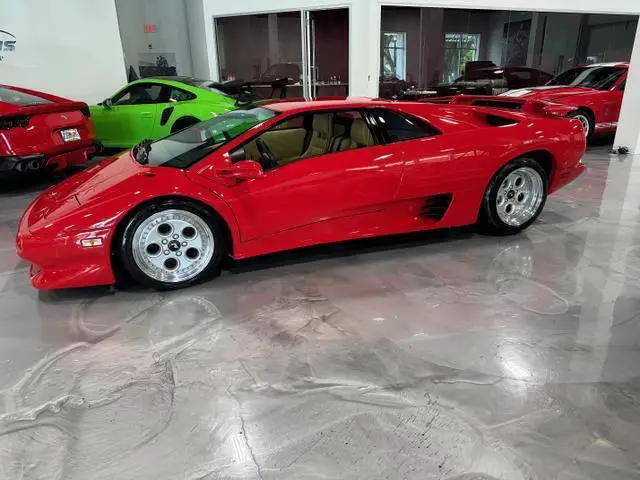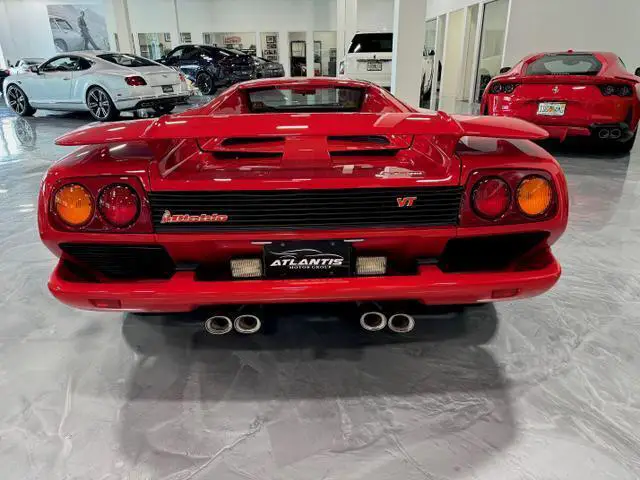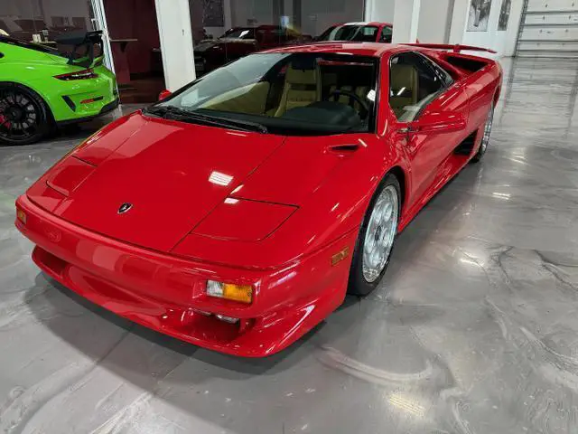 1994 Lamborghini Diablo VT with 13,000 miles.This 1994 Lamborghini Diablo VT was ordered in Rosso Diablo over a beige leather interior with red piping, and it is equipped with a unique ?bull horns? rear wing and a two-tone steering wheel with the signature of former Lamborghini chief test driver Valentino Balboni. Power is from a 5.7-liter V12 linked with a five-speed manual transmission, Viscous Traction all-wheel drive, and a pair of limited-slip differentials. Additional equipment includes adjustable suspension, power steering, 17? five-hole alloy wheels, retractable headlights, scissor doors, air conditioning, a Pioneer stereo, a gated shifter, and fixed-back bucket seats. The car spent its last 11 years in Ontario, Canada, with one registered owner, and work under their care included overhauling the fuel system, rebuilding the water pump, and replacing engine sensors, O-rings, the engine mounts, the tires, and various seals, hoses, and rubber components. This Diablo VT was featured in the June 2017 issue ofAutostradamagazine, shows 21k kilometers (~13k miles), and is now offered by the selling dealer with records, a clean Carfax reportFor more info call, email, or just stop in!877-894-4420