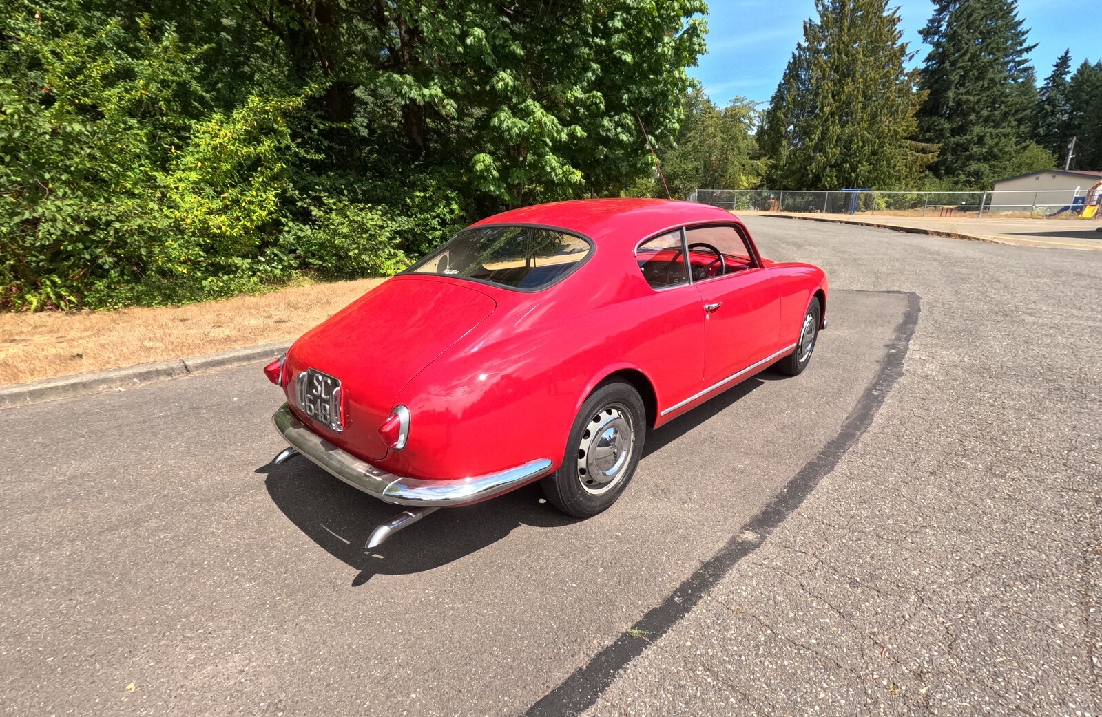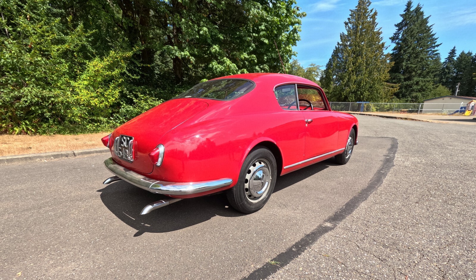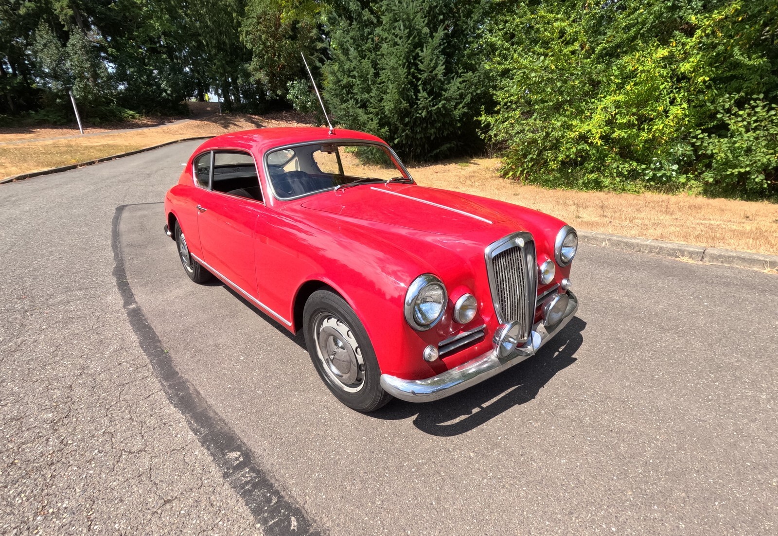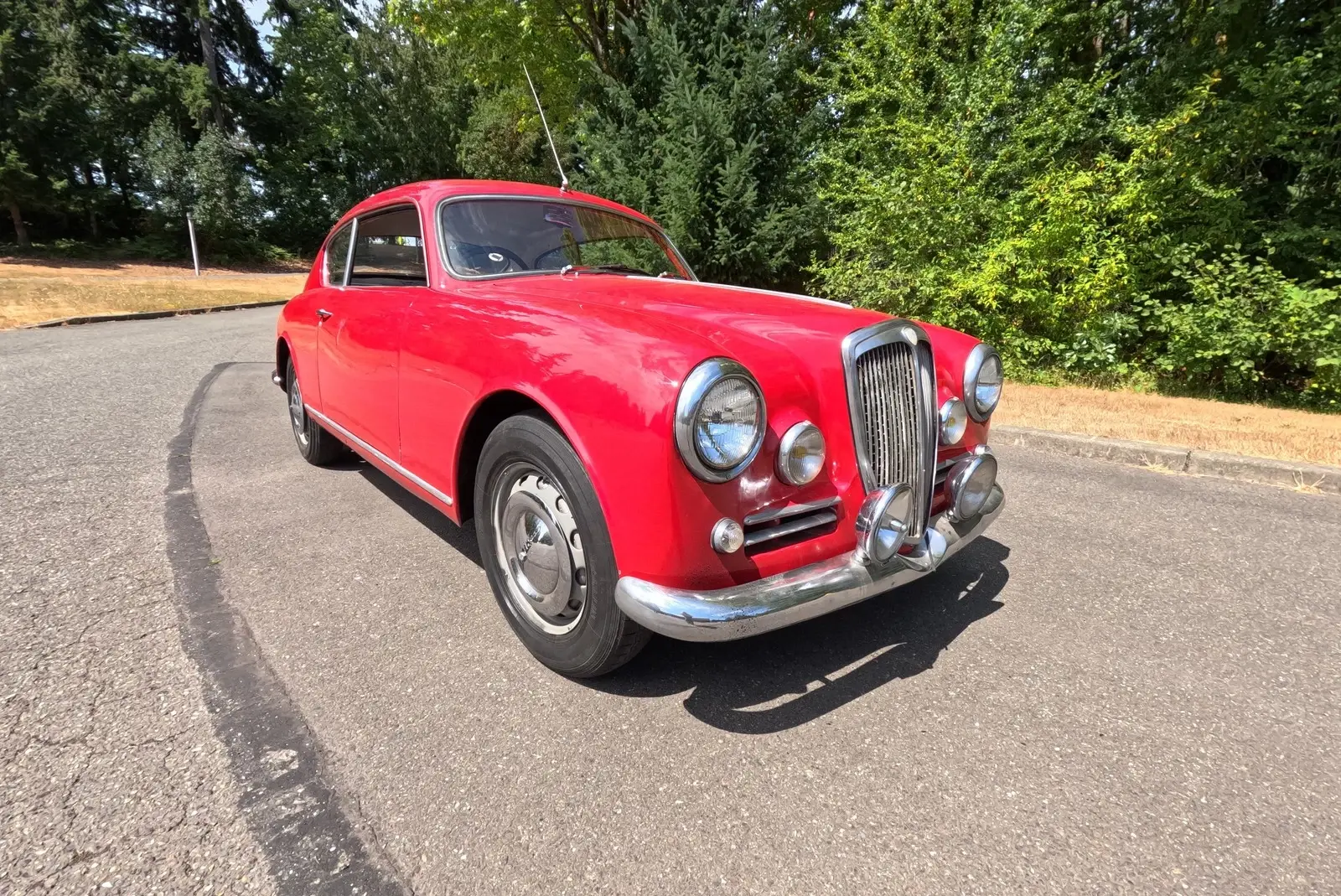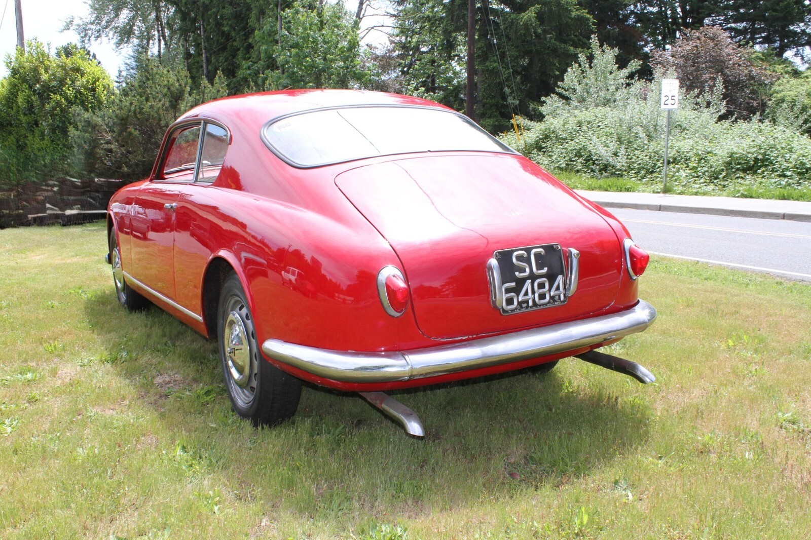 This 1956 Lancia Aurelia B20 GT is a right-hand-drive coupe and one of an estimated 3,900 examples built during an eight-year production run. Finished in red over black vinyl and beige cloth upholstery, this Series VI car is powered by a replacement 2.5-liter B24 V6 paired with a floor-shifted, rear-mounted four-speed manual transaxle. It rides on metric steel wheels and is further equipped with auxiliary lights, a Weber 40DCL 5 carburetor, a de Dion rear axle, and hydraulic drum brakes. The car was acquired by the selling dealer in 2025, and subsequent service involved adjusting the carburetor, replacing the clutch cylinders, and performing a brake service. This B20 is now offered in Washington State with a copy of an instruction manual, a previous Singapore registration book, and transferable Connecticut registration that lists the vehicle as a 1957 model.