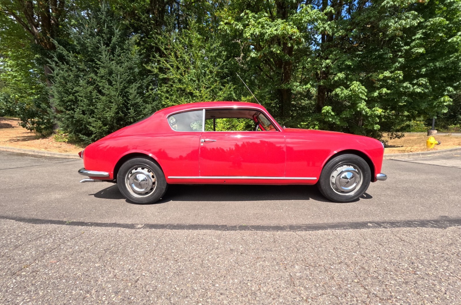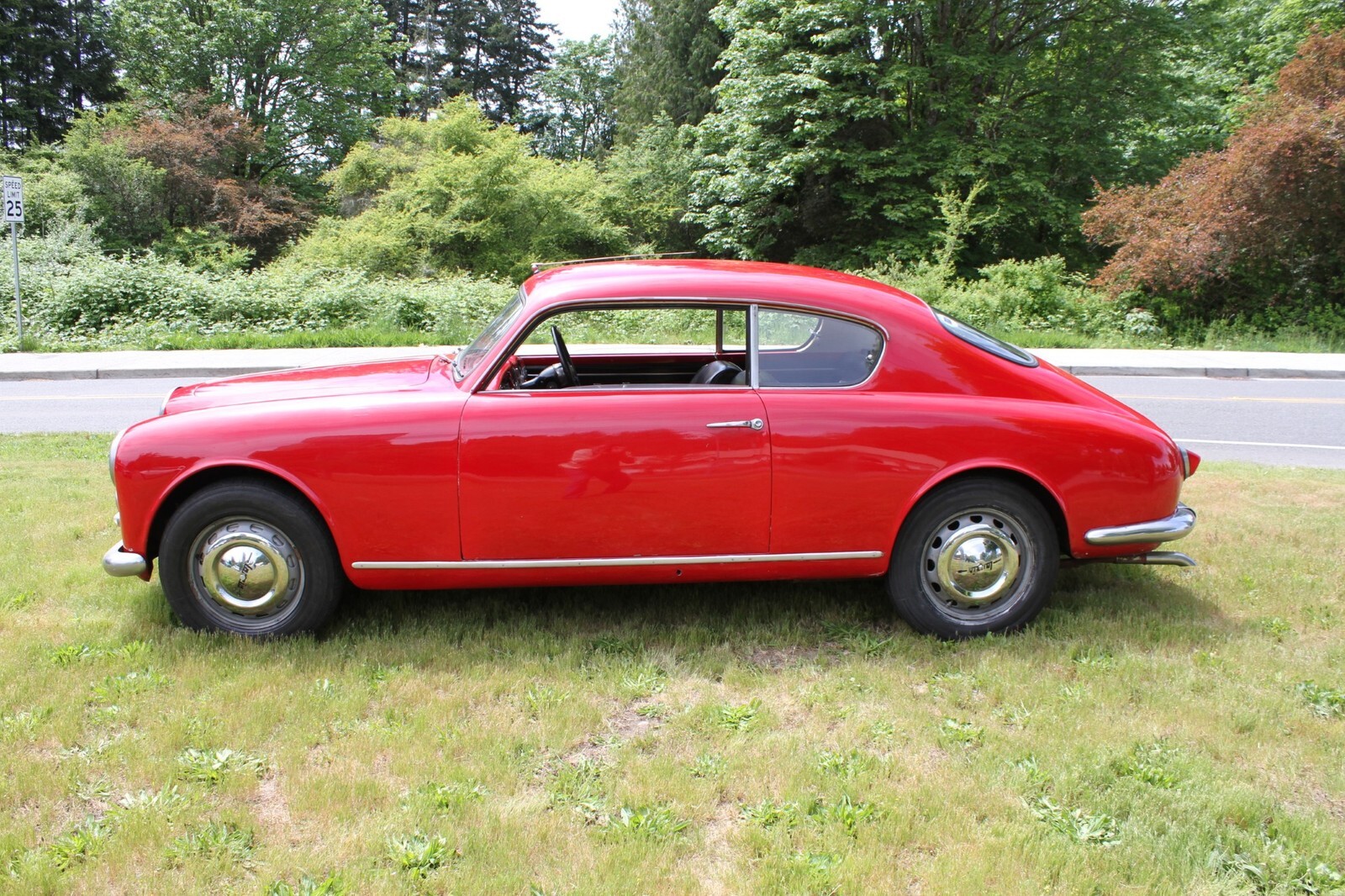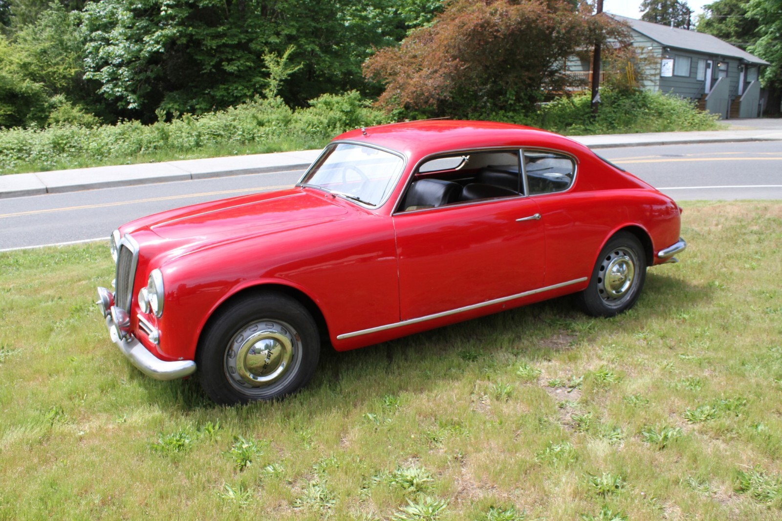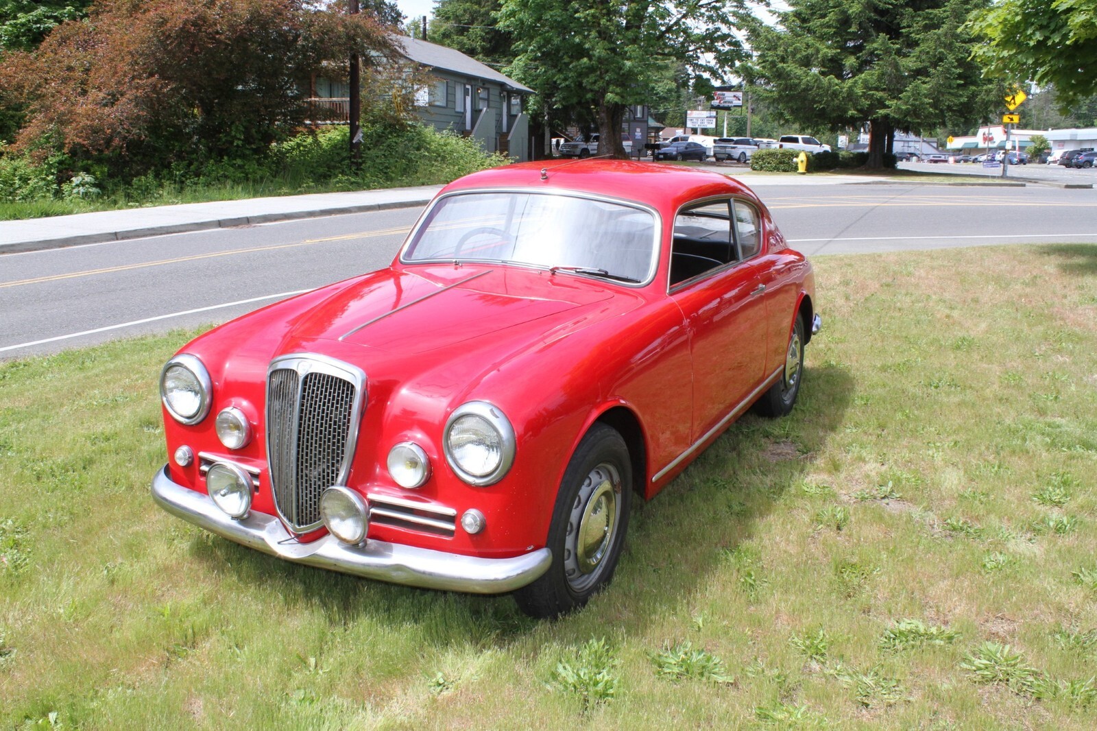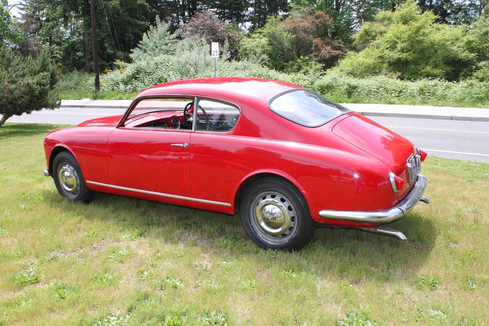 This 1956 Lancia Aurelia B20 GT is a right-hand-drive coupe and one of an estimated 3,900 examples built during an eight-year production run. Finished in red over black vinyl and beige cloth upholstery, this Series VI car is powered by a replacement 2.5-liter B24 V6 paired with a floor-shifted, rear-mounted four-speed manual transaxle. It rides on metric steel wheels and is further equipped with auxiliary lights, a Weber 40DCL 5 carburetor, a de Dion rear axle, and hydraulic drum brakes. The car was acquired by the selling dealer in 2025, and subsequent service involved adjusting the carburetor, replacing the clutch cylinders, and performing a brake service. This B20 is now offered in Washington State with a copy of an instruction manual, a previous Singapore registration book, and transferable Connecticut registration that lists the vehicle as a 1957 model.