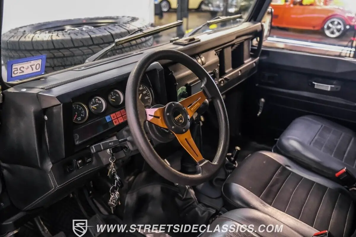 The cockpit channels pure British expedition functionality with rugged black vinyl covering the adventure-ready bucket seats and folding armrests. A MOMO custom steering wheel puts control in your grasp while exploring uncharted paths. Modern tech meets classic British utility with a Sony touch screen command center providing AM/FM/Bluetooth/Satellite connectivity through powerful 6x9 speakers. Carbon fiber style dash inserts add a dash of modern flair, while the rear jump seats stand ready for extra explorers.