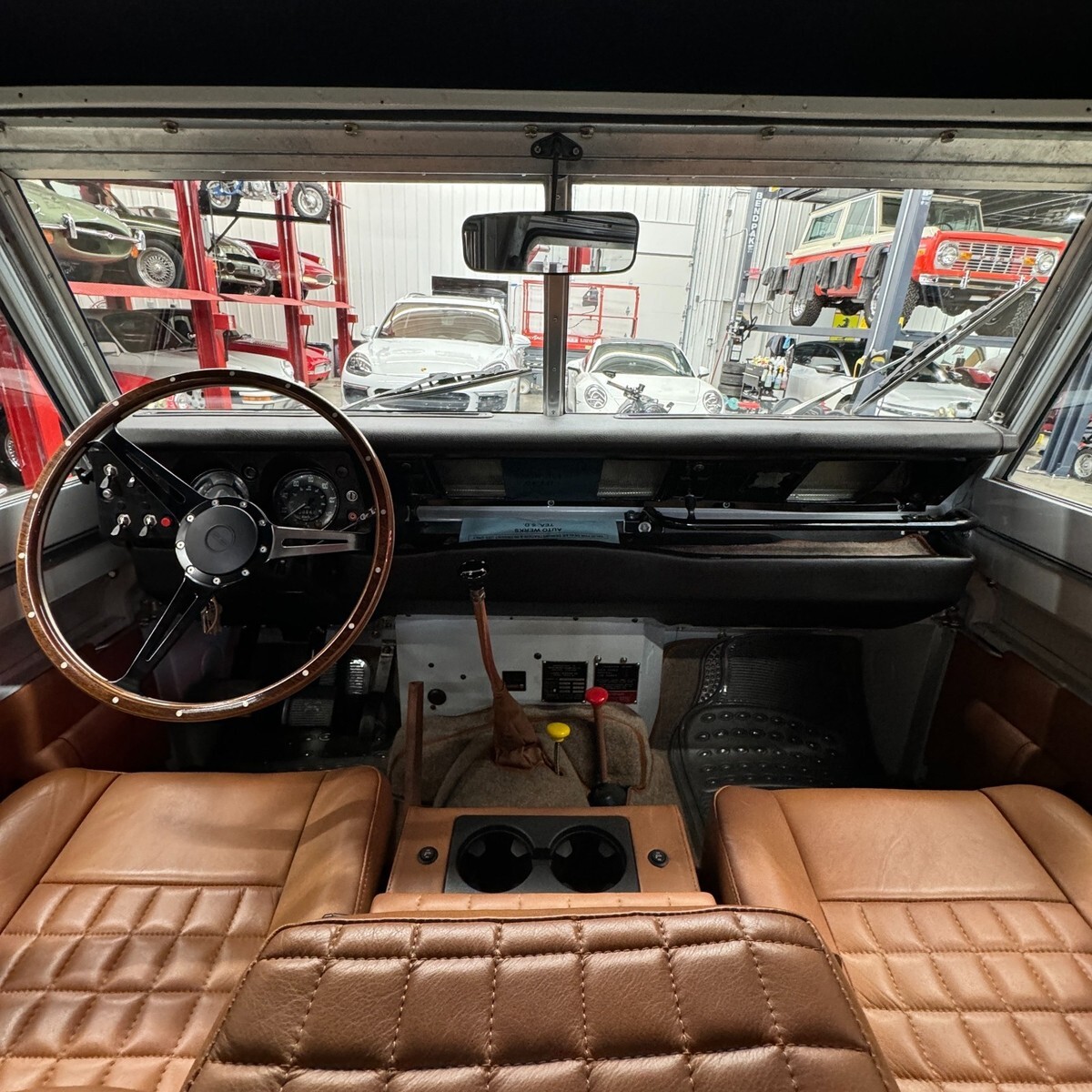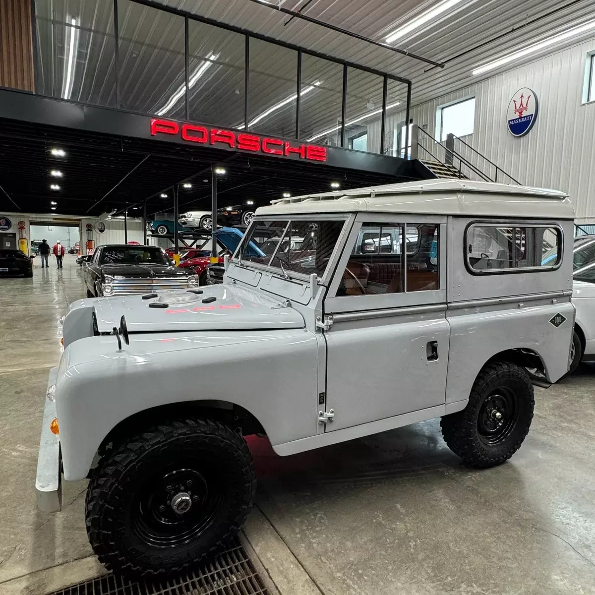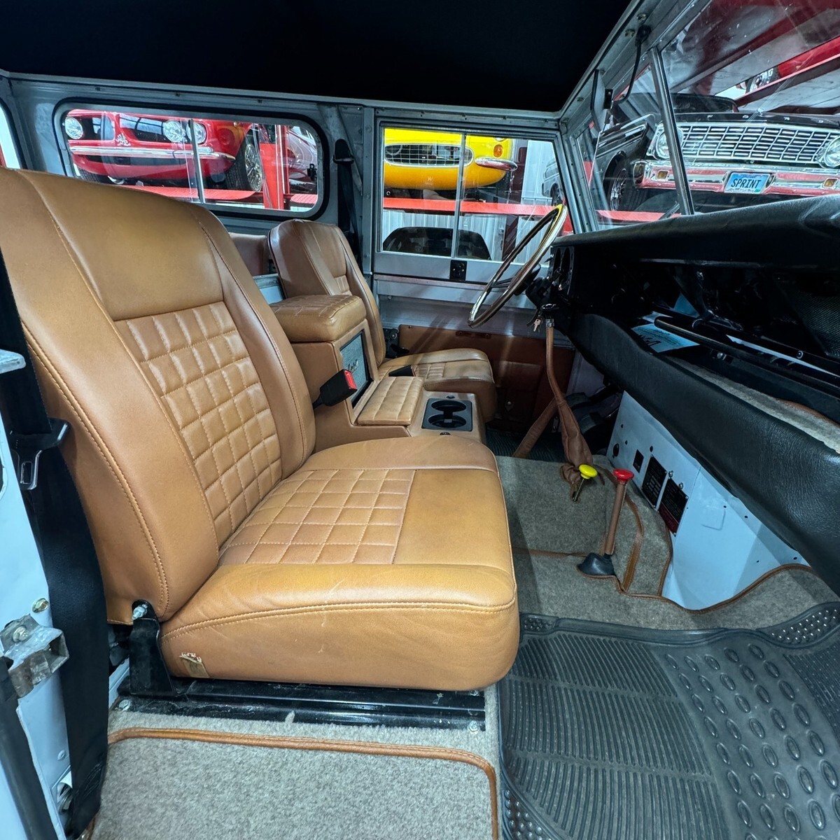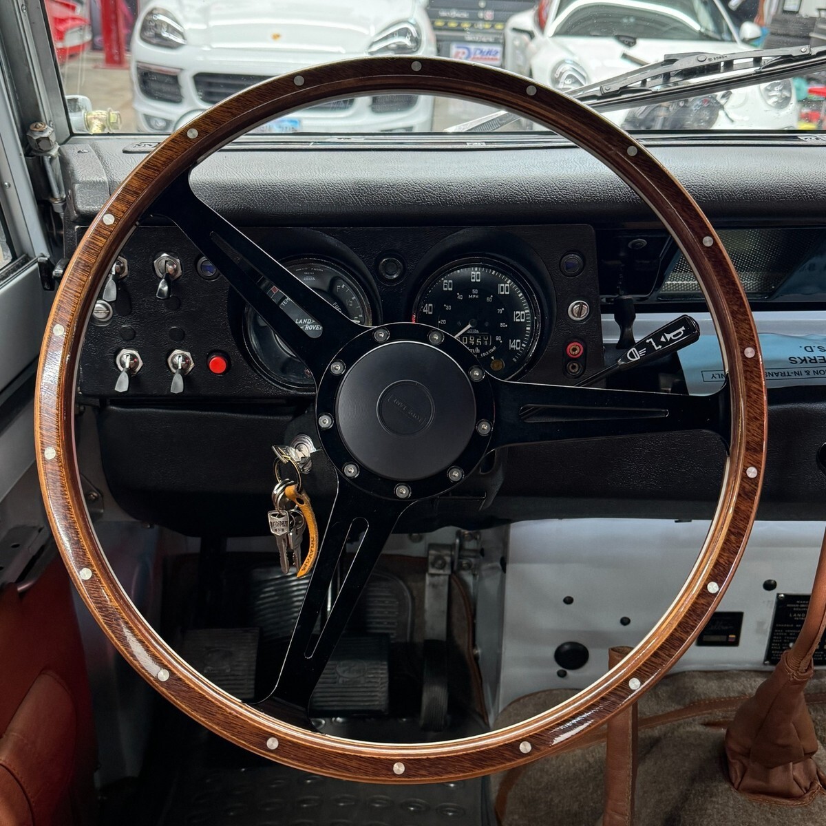 The 1976 Land Rover Defender Petrol Series 3 is a classic SUV with a brown interior, manual transmission, and a 2.25L 4-cylinder engine. With 8 seats and only 651 miles on the odometer, this collector car is a rare find for fans of Land Rover vehicles. The vehicle is being sold by a dealer, making it a desirable addition to any car enthusiast's collection. Custom Interior, new rims and tires.