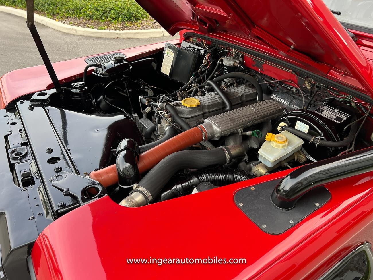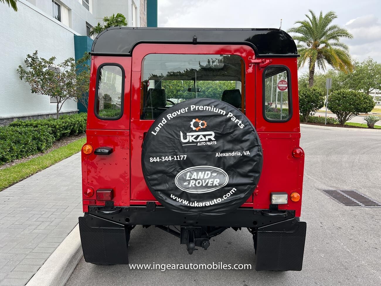 Defender has numerous options such as Power Steering, Power Brakes, Front Disc Brakes and rear disc brakes, 5-spoke wheels, Factory Left Hand Drive, rear tire mount kit w spare, new tires, mud flaps, black fender flares, matts, custom black grill, full Air snorkle kit and more…The Interior is nice and contrast well to the exterior red safari paint, newer seats has been fitted, and tastefully done. Factory steering wheel. Very solid Land Rover, and as you can see it received a restoration by the previous owner. Painted black roof. The engine swap alone to a 200tdi can run over $10,000 easily. Make sure to see my full album of pictures. Since its a classic car milage is exempt.