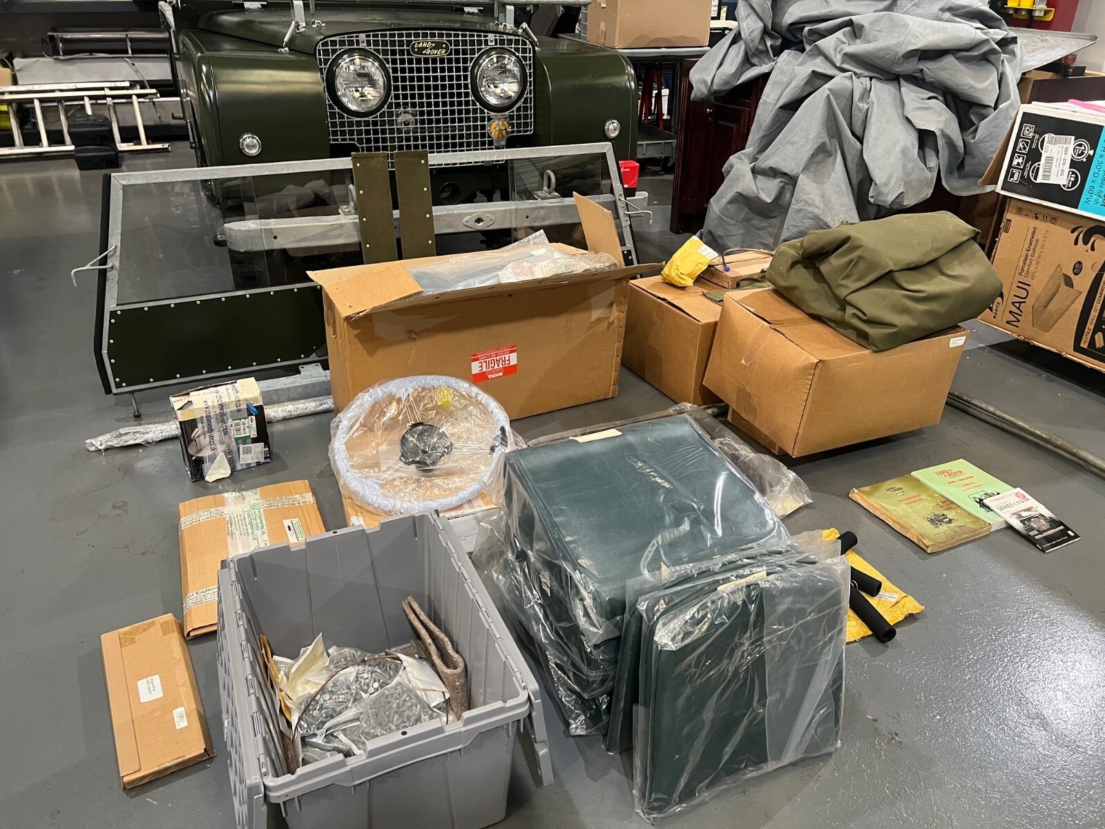 Parts are just too numerous to list completely. But I will touch the highlights.Being a perfectionist, the steering wheel being new and with new buttons and controls was very important to me. I bought an original used one and sent it to craftsman in the UK where it was completely restored inclusive of the bakelite being restored using the original oven fired method of the past.The horn button and light control etc for it are new in package.New in box Original SU Fuel pump, new galvanized front bumper not on the truck currently.Most all Gaskets, seals, bearings and multiple kits for the engine and transmission.I like the seats in it which are UK mil spec they are in excellent condition as is the original top but I did secure a Connolly green set as well as a brand new top all of which are in the box and come with the truck.Some interior restoration parts like shift knobs etc. New hoses, clamps, bolts hardware, vintage period right wiring in multiple color rolls. Again, allot of parts too numerous to list. The under seat tire kit/jack are excellent. There a set of rubber mats new in package. Genuine factory OEM vintage parts catalog and workshop manuals.The entity specializing in series rovers in the UK included with the engine build kit and seals etc a color sample to match for the exact factory engine color.I secured many of the metal plates and badges to “make new” from a UK entity that was making them to OEM spec years ago as well all of which accompanies the truck. I intended to send the gauges off for complete restoration and had a new dash plate I secure from England painted to perfectly match when reassembled. It is in the box with the truck as well. So this said, there may be some small items you may need to source but not much. My next move was pulling the entire drivetrain and sending it to a specialty shop in England to rebuild but found an entity in the US thus why I secured many of the parts and brought here stateside.I’m sure I will get many questions asking what I am seeking in the sale of the unit. I simply wish to recover my vested costs and a reasonable return on investment.The vehicle is for sale locally and I reserve the right to sell it if a local offer comes before reserve is met here.