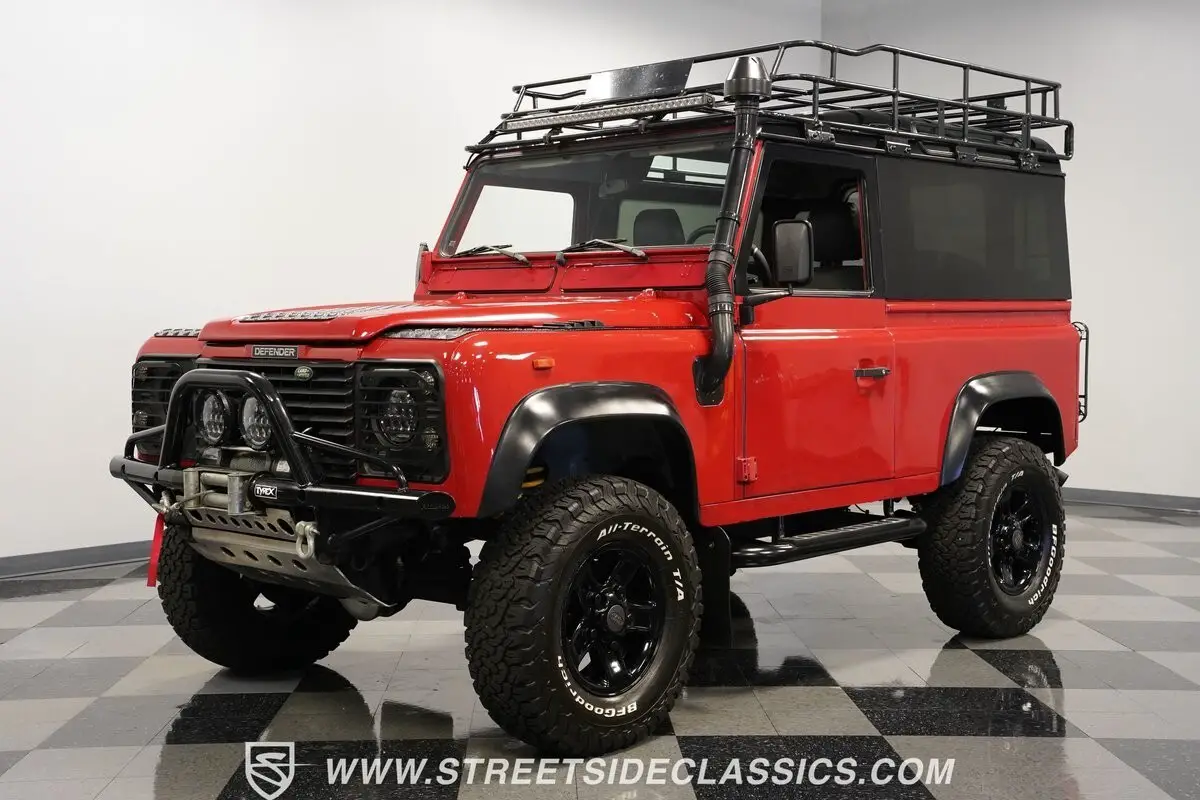 In terms of collectible SUVs, classic Land Rovers rank right up there as some of the most sought-after trucks on the market today. Today, we present to you this exceptionally capable 1991 Land Rover Defender 90, which has only 1999 miles on its odometer since its rebuild. Decked out in proud Arrow Red, complemented by a black top, this Defender is equipped with tubular bumpers and sidesteps, a full roof rack with ladder, intake snorkel, light bar, and front winch, making it ready to take on whatever kind of terrain you can throw at it.