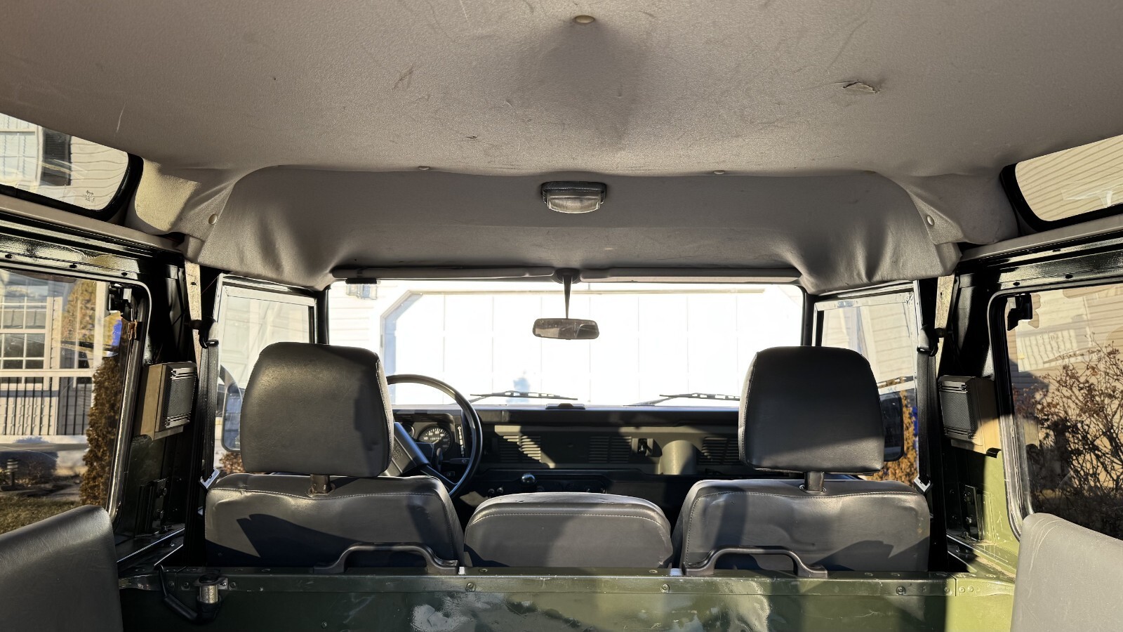 The sale also includes significant extras: a Front Runner roof rack (approx. $2,000 value), a telescoping ladder, and a Front Runner rooftop tent (approx. $1,200 value), making this Defender ready for travel and extended adventures.