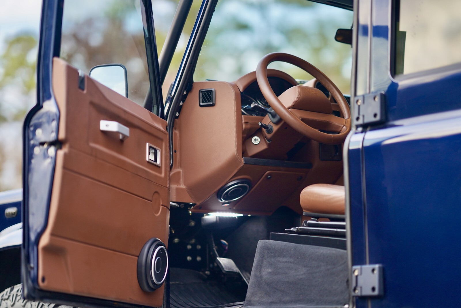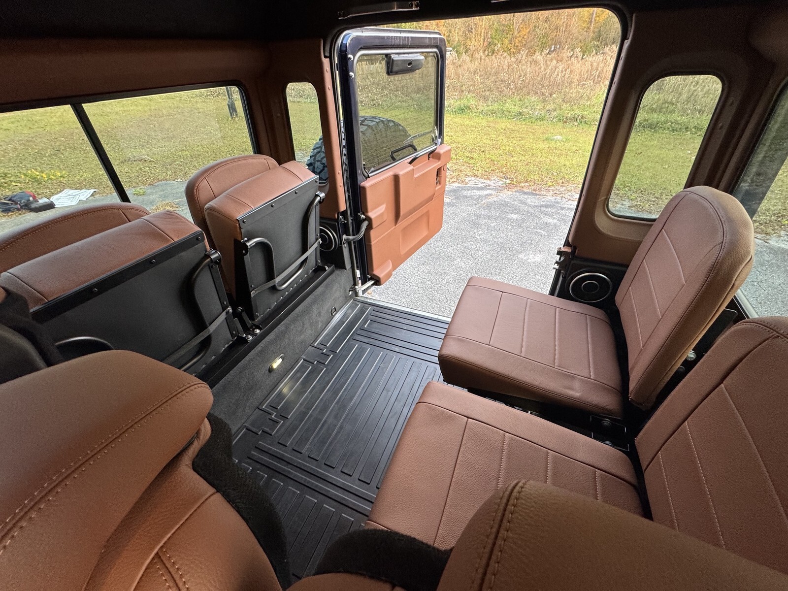 In the cockpit, the modern TDCI PUMA-style dash provides excellent heating and air conditioning ensuring the passenger cabin is comfortable year-round and there’s even a heated front windscreen for those extra frosty mornings. The heated front seats are upholstered in supple, dark saddle leather, as are the second-row seats, door cards, dash, and steering wheel with an embossed logo. Four side-facing, stowable rear seats with matching upholstery provide the ultimate in flexibility – seating for additional passengers or true utilitarian cargo space. The bespoke interior is further complemented with billet aluminum interior door pulls, handles, and lock buttons. The leather-wrapped center console houses a deep storage cubby, as well as a wireless fast-charging pad for your mobile device, and USB charging points.