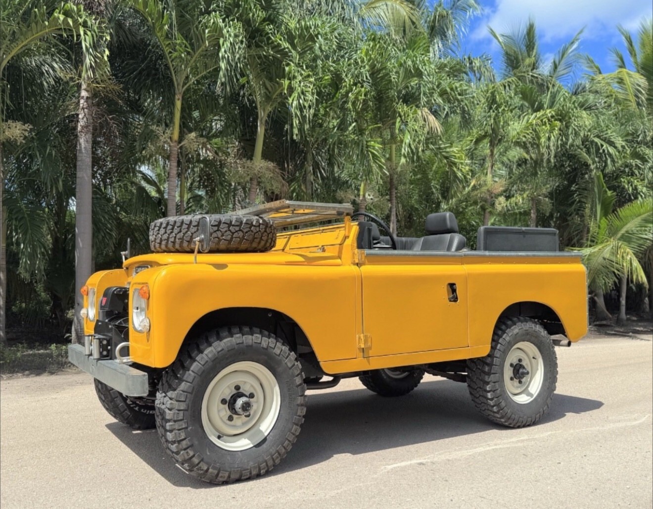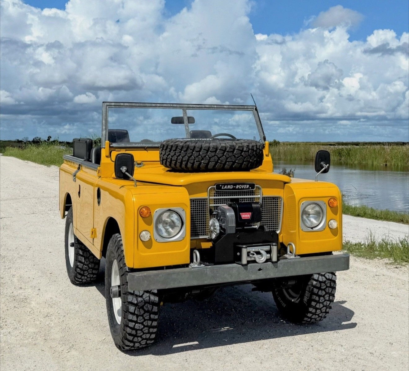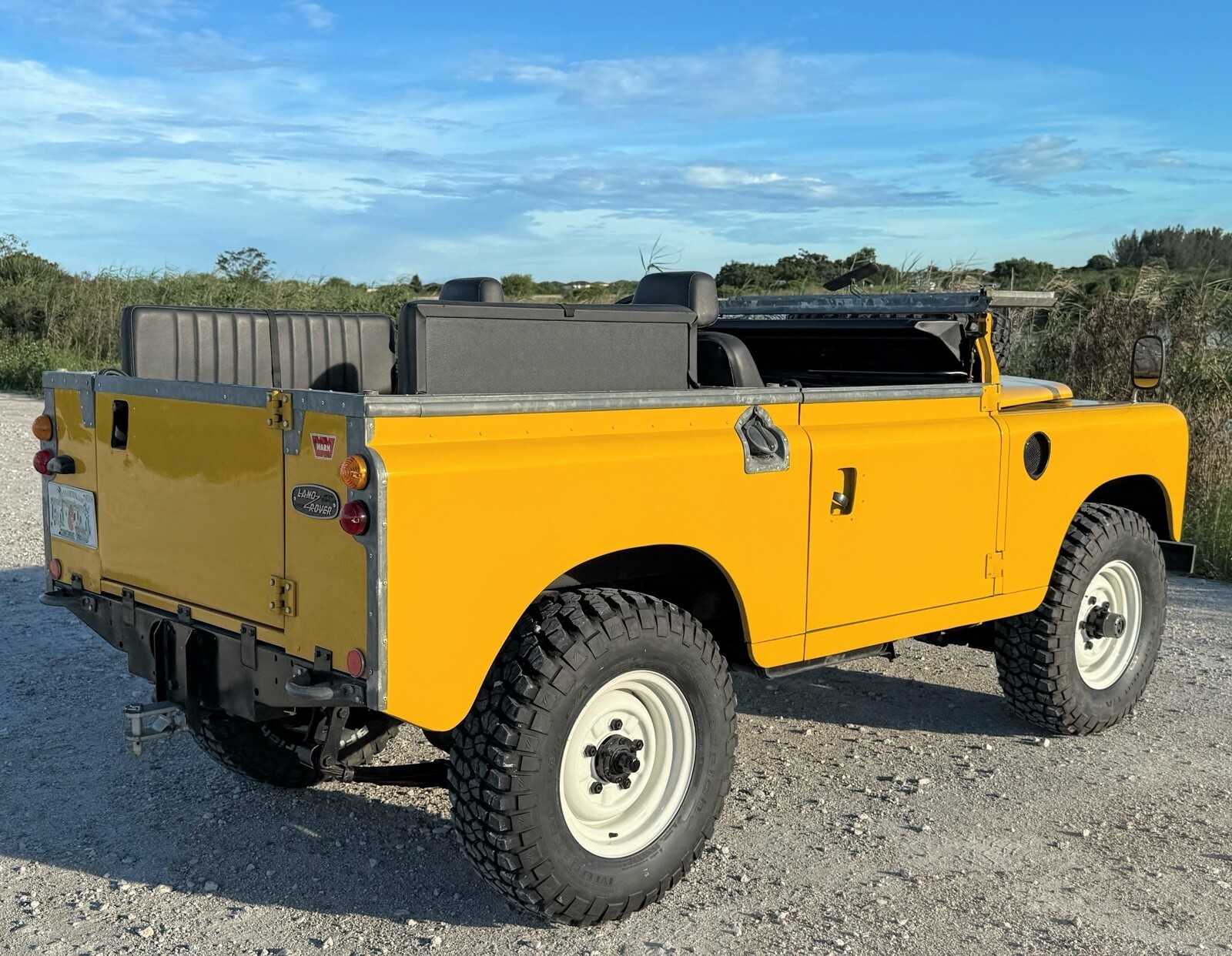 Stainless-steel exhaust system, electronic ignition, manually locking front hubs, removable tropical roof, swing away split tailgate assembly that allows easy acces for the rear passengers, removable door tops, two-speed transfer case, 8000 pounds Warn winch, folding windshield, NOS BF Goodrich KM2 tires with less than 300 miles, 16″ steel wheels, hood mounted spare tire, rear recovery hitch, lifting/towing rings, three-point front seat belts, fender-mounted side mirrors.